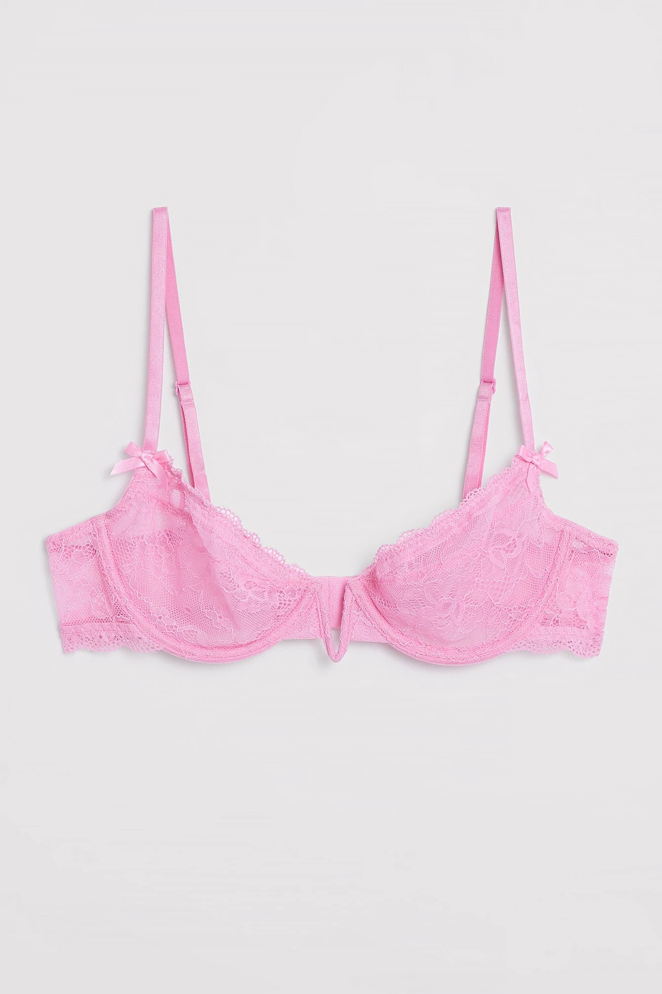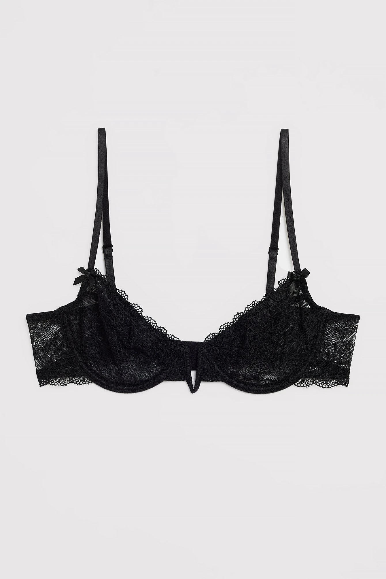 This bra is made of lace and features an underwire cup. It has adjustable shoulder straps with a bow detail and a fish hook closure.