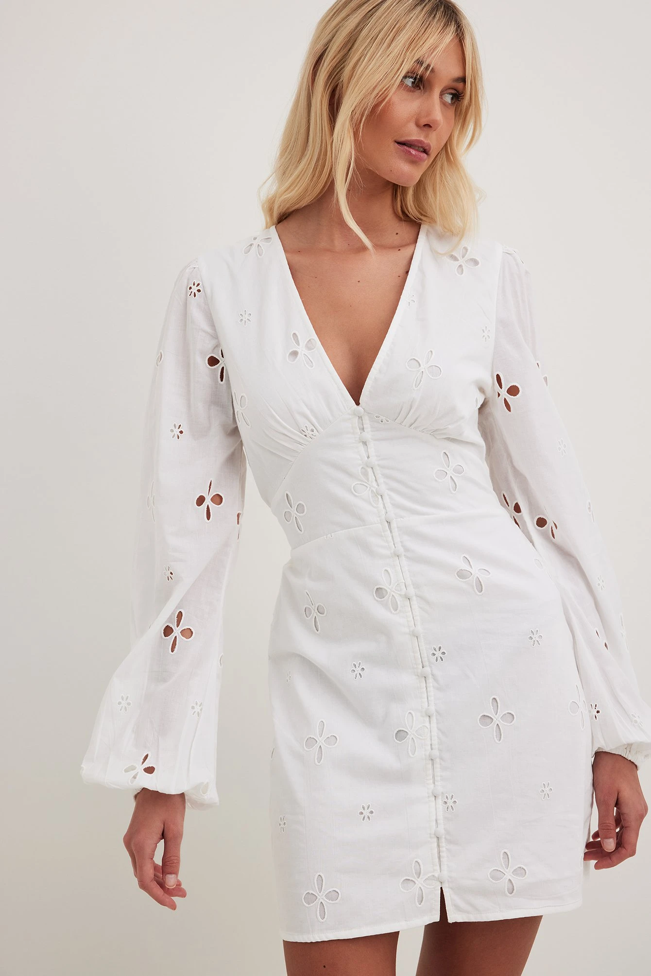 This mini dress is made of cotton and features broderie anglaise. It has a V-neck and long balloon sleeves with elasticized cuffs. Our mini dress features a button fly closure down the front and an elasticized waistband on the back.