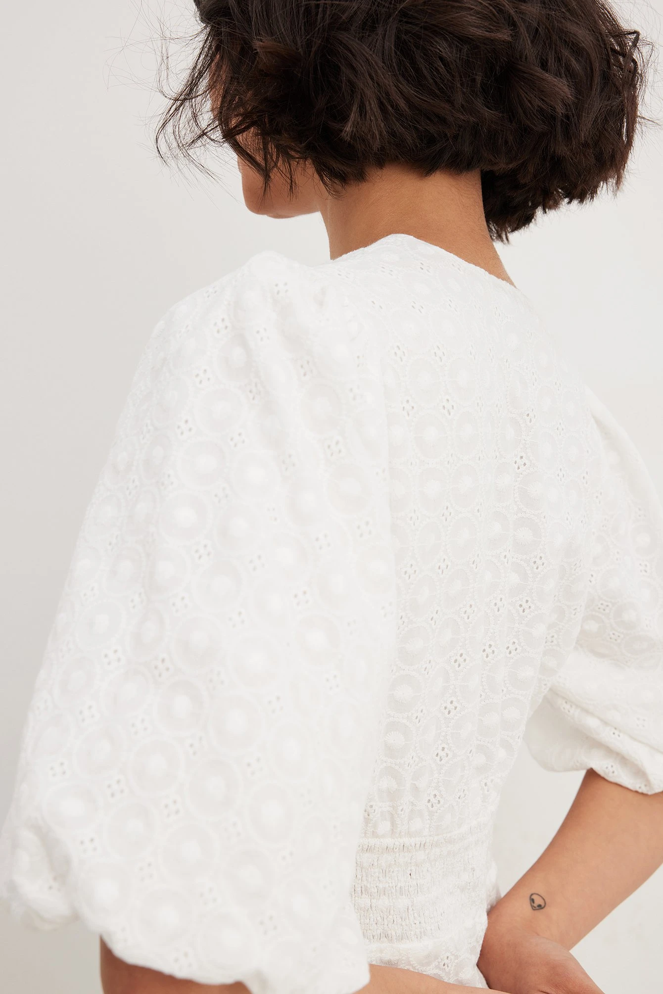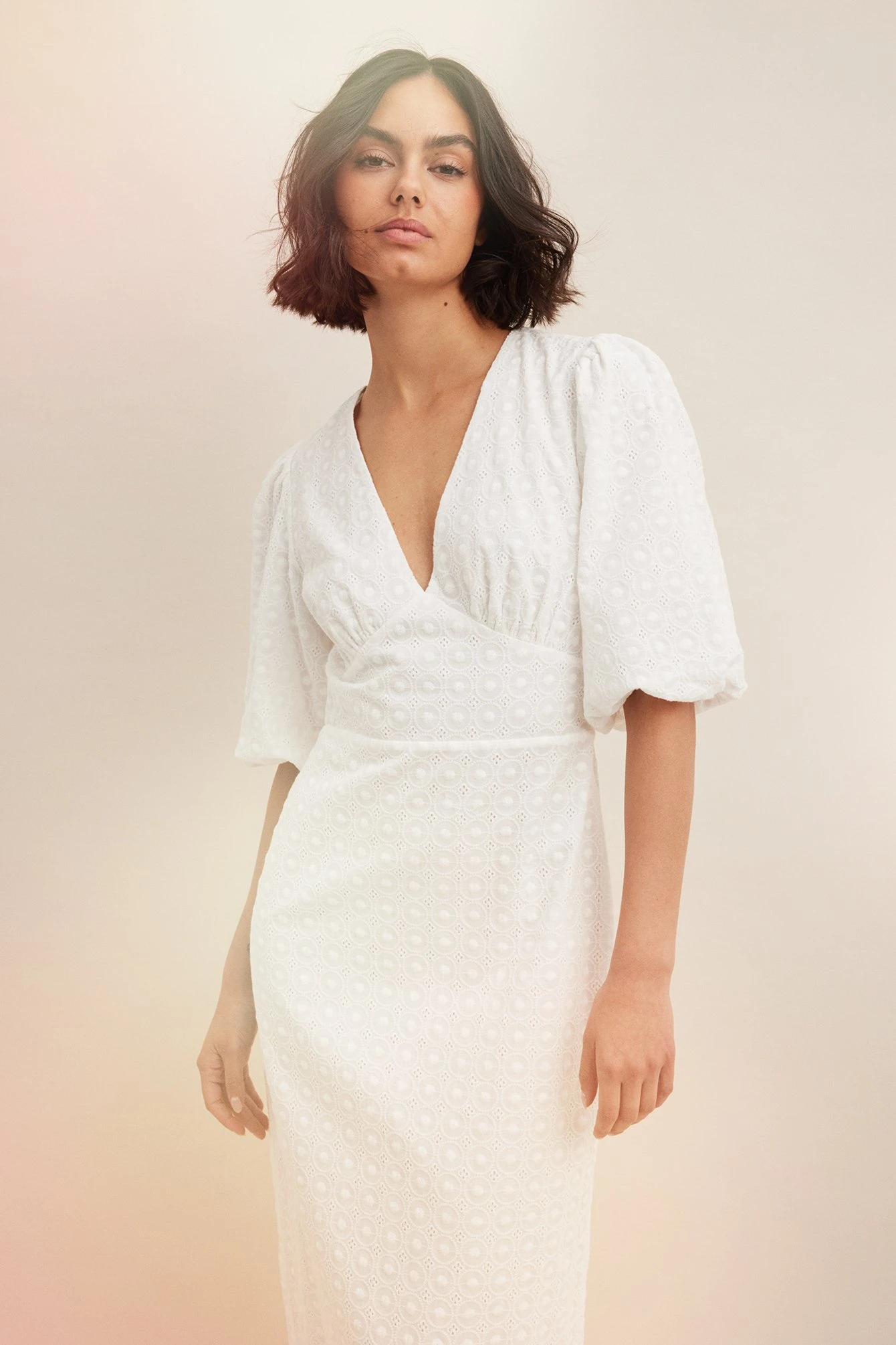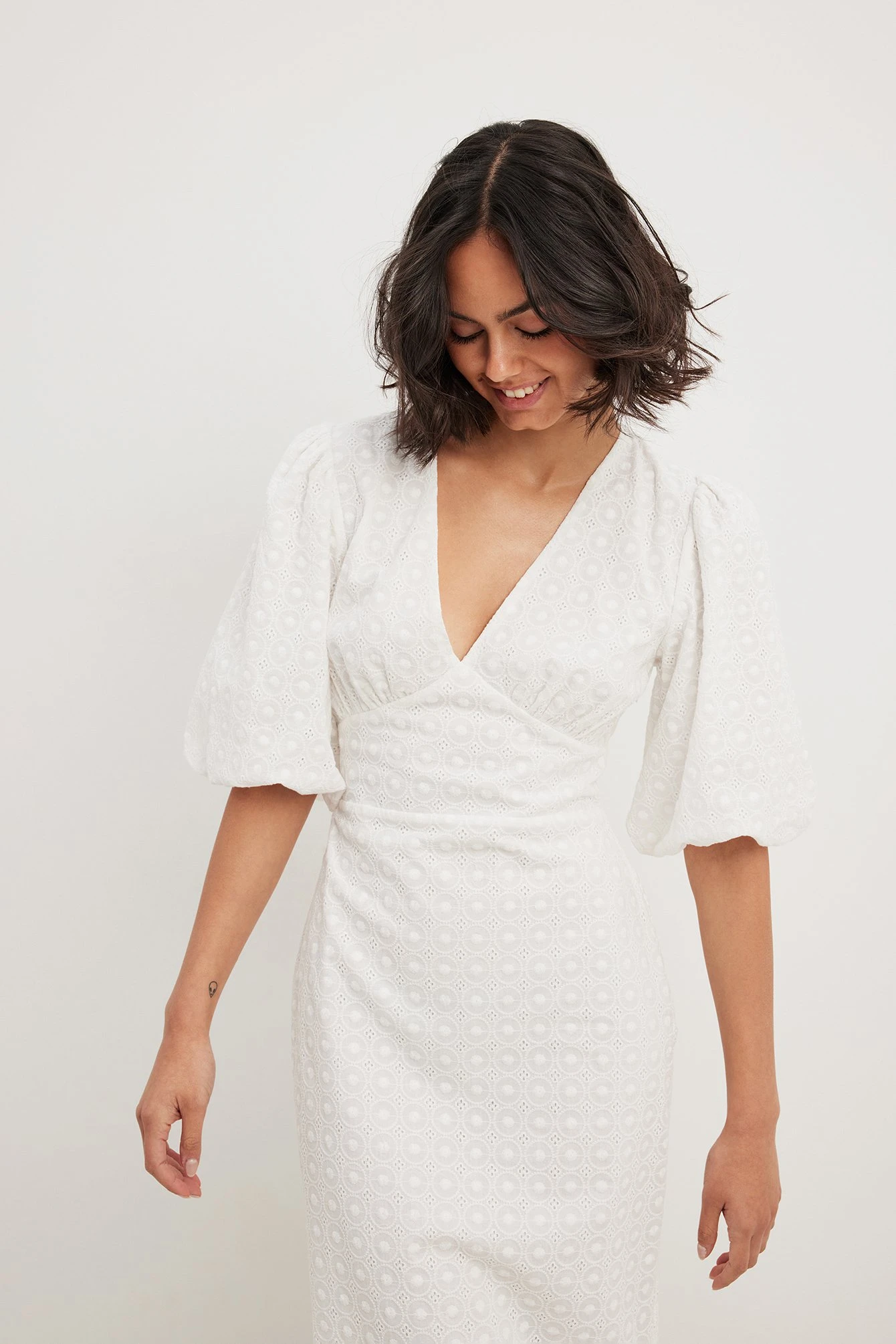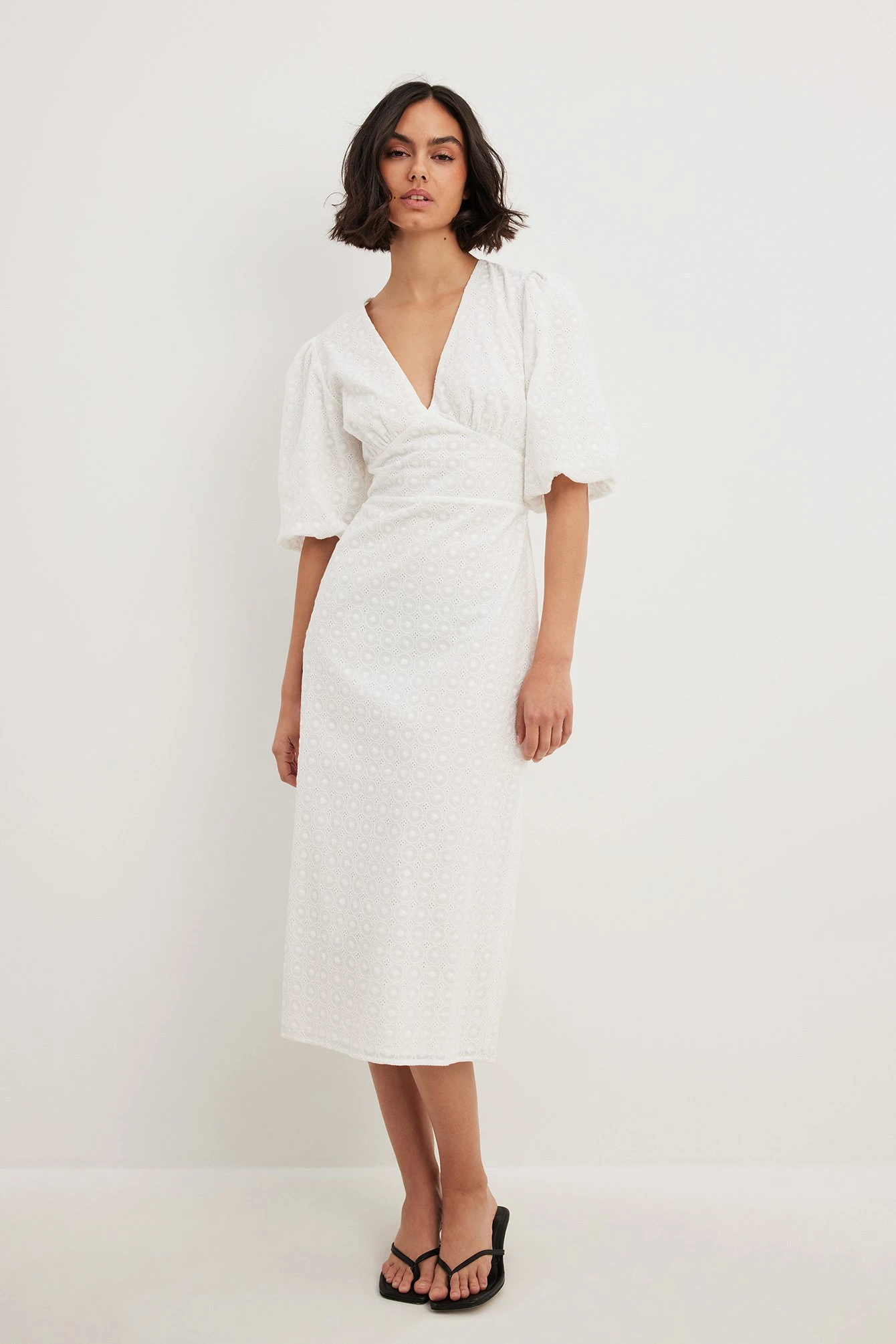 This midi dress features broderie anglaise. It has a v neckline and puff sleeves. This midi dress features a back slit detail and a side zipper closure.