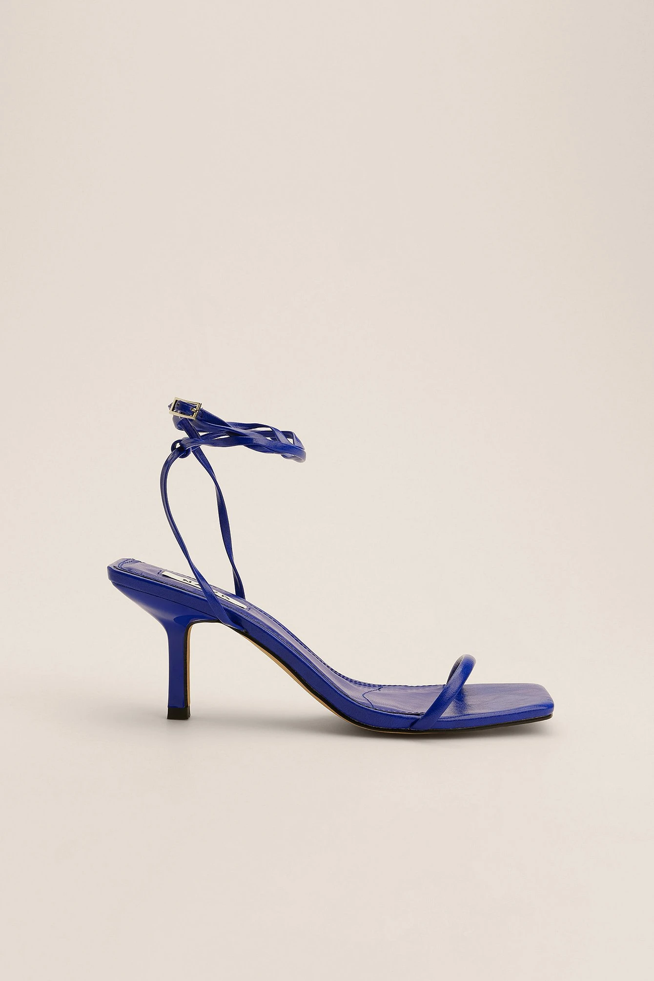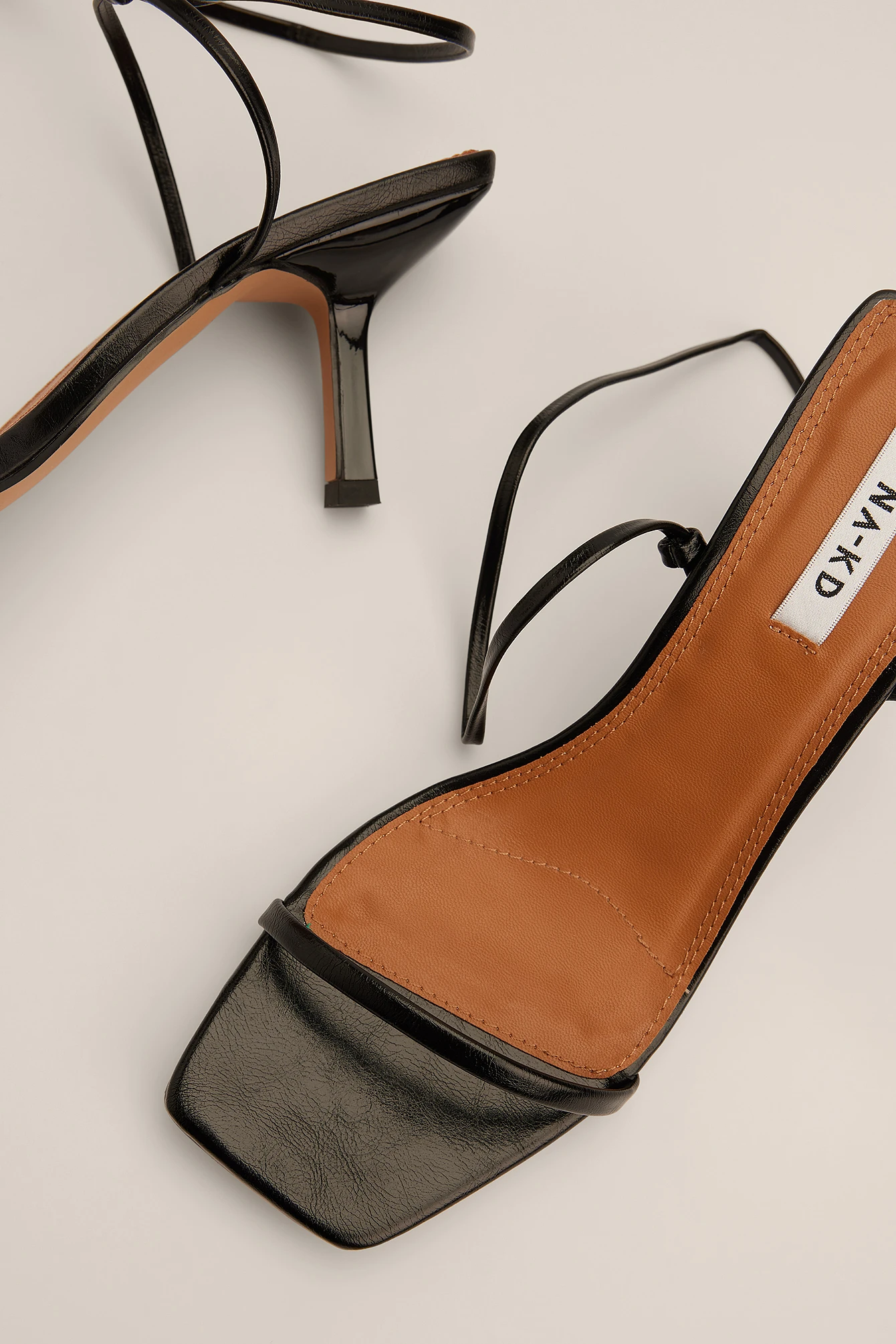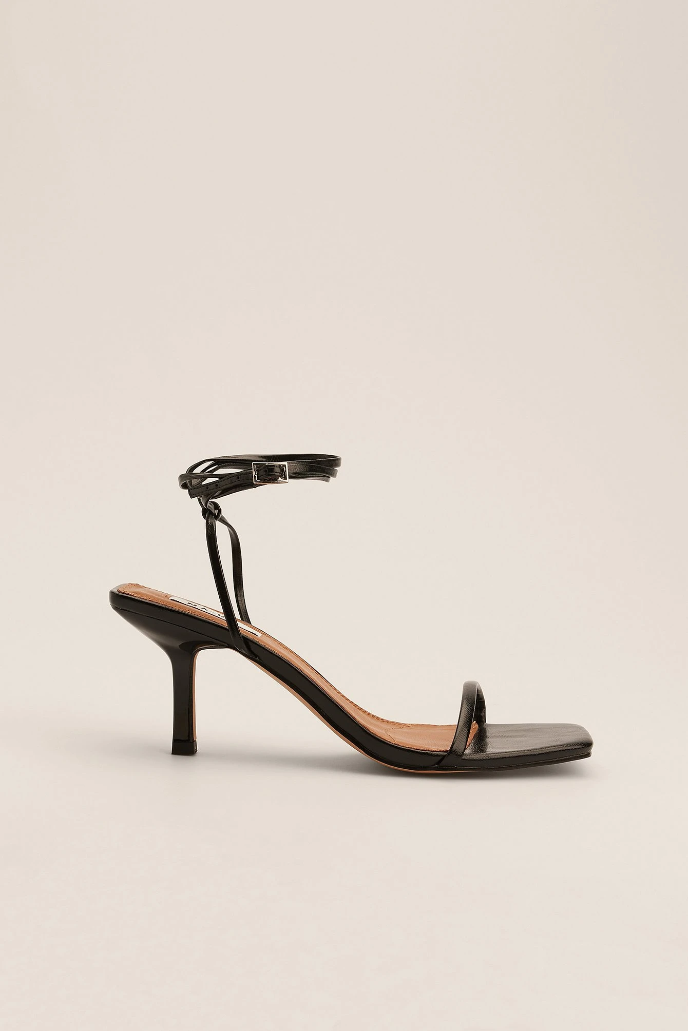 These sandals are high-heeled and feature straps on the ankle. Measurements in size 39: Heel height: 7 cm / 2.9 in. Insole length: 26 cm / 10.1 in.