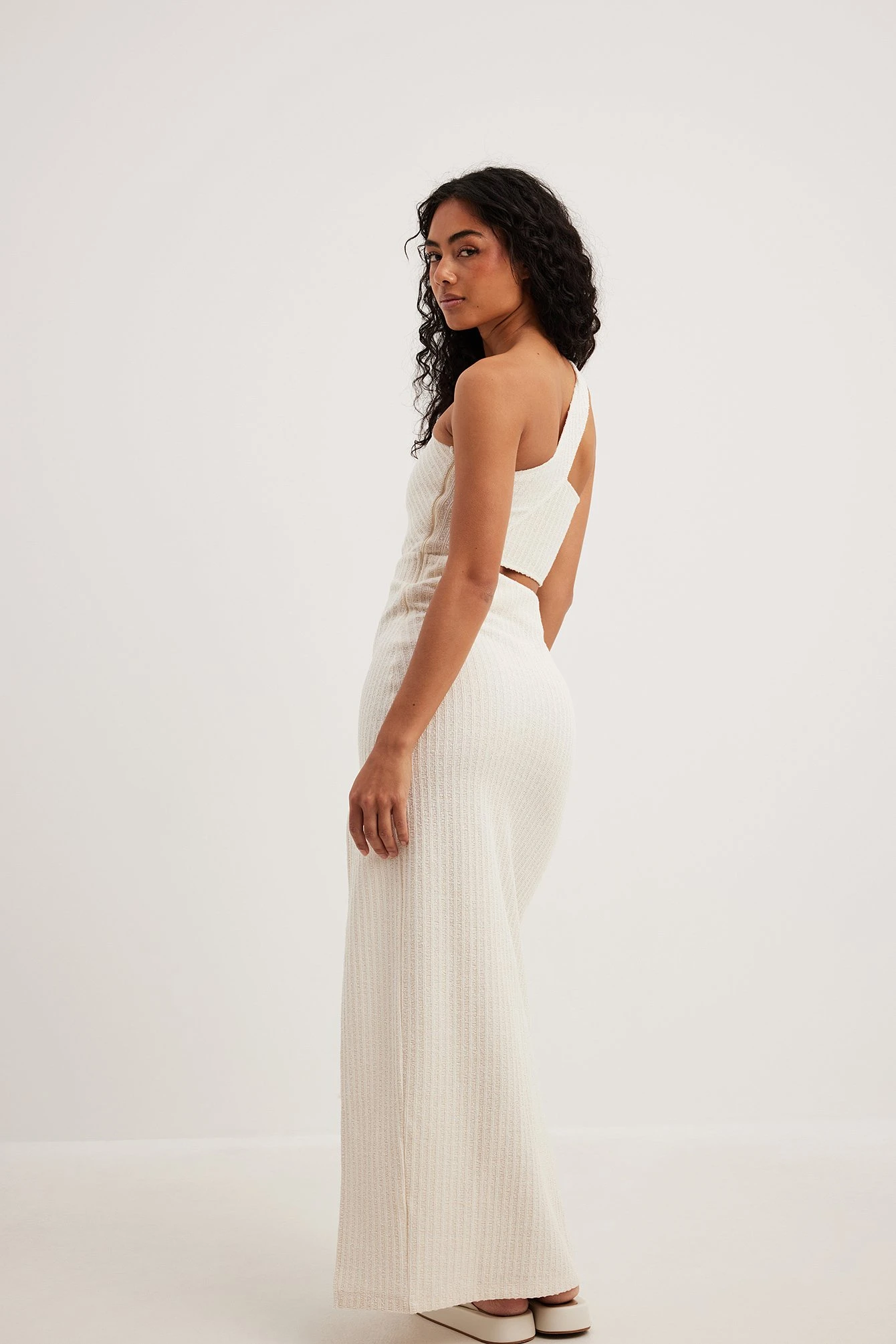 This dress is knitted and features a maxi length. It has a one shoulder design and an asymmetrical seam. This dress features a cut out detail, a side zipper closure with a hook-and-eye closure and a high slit.