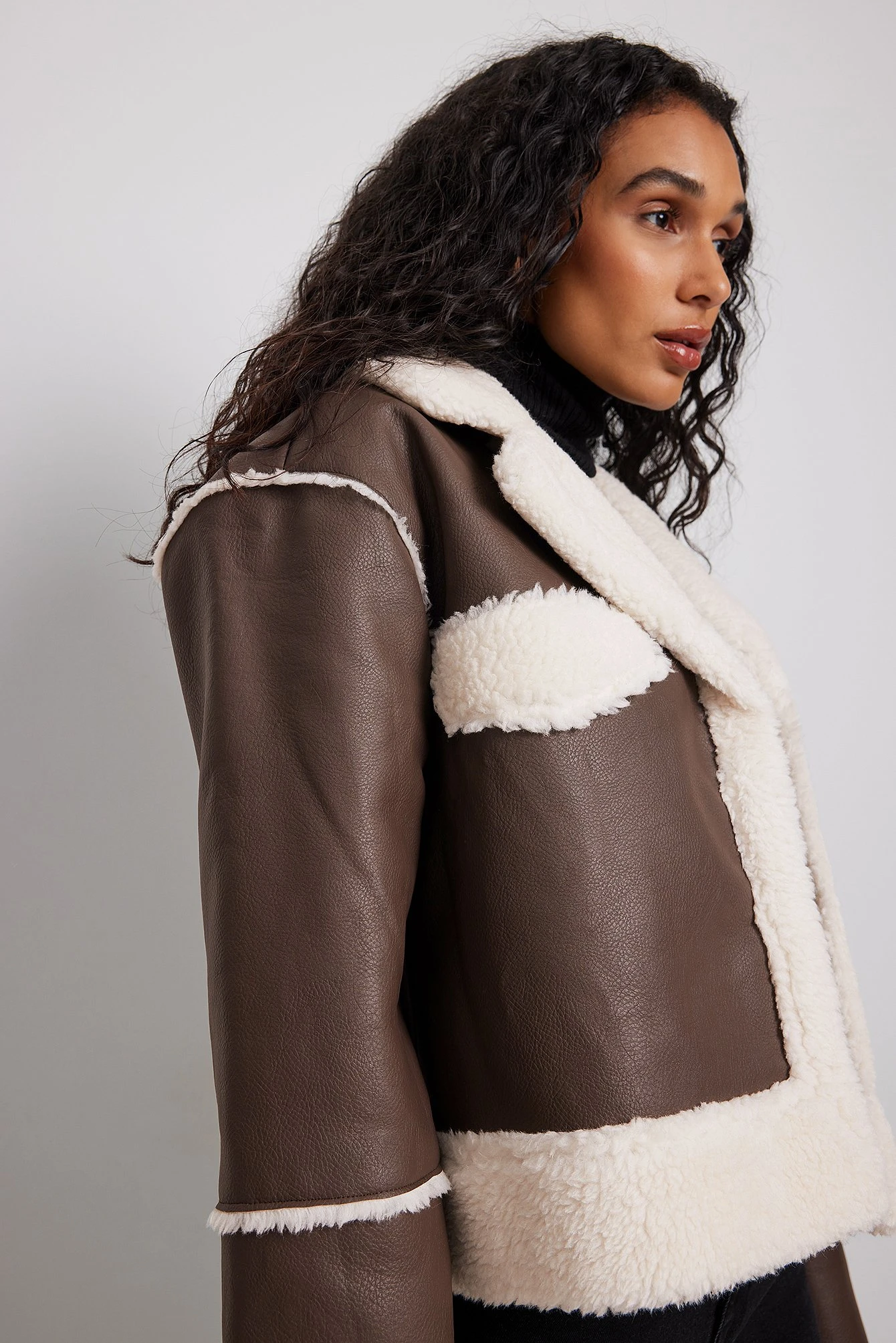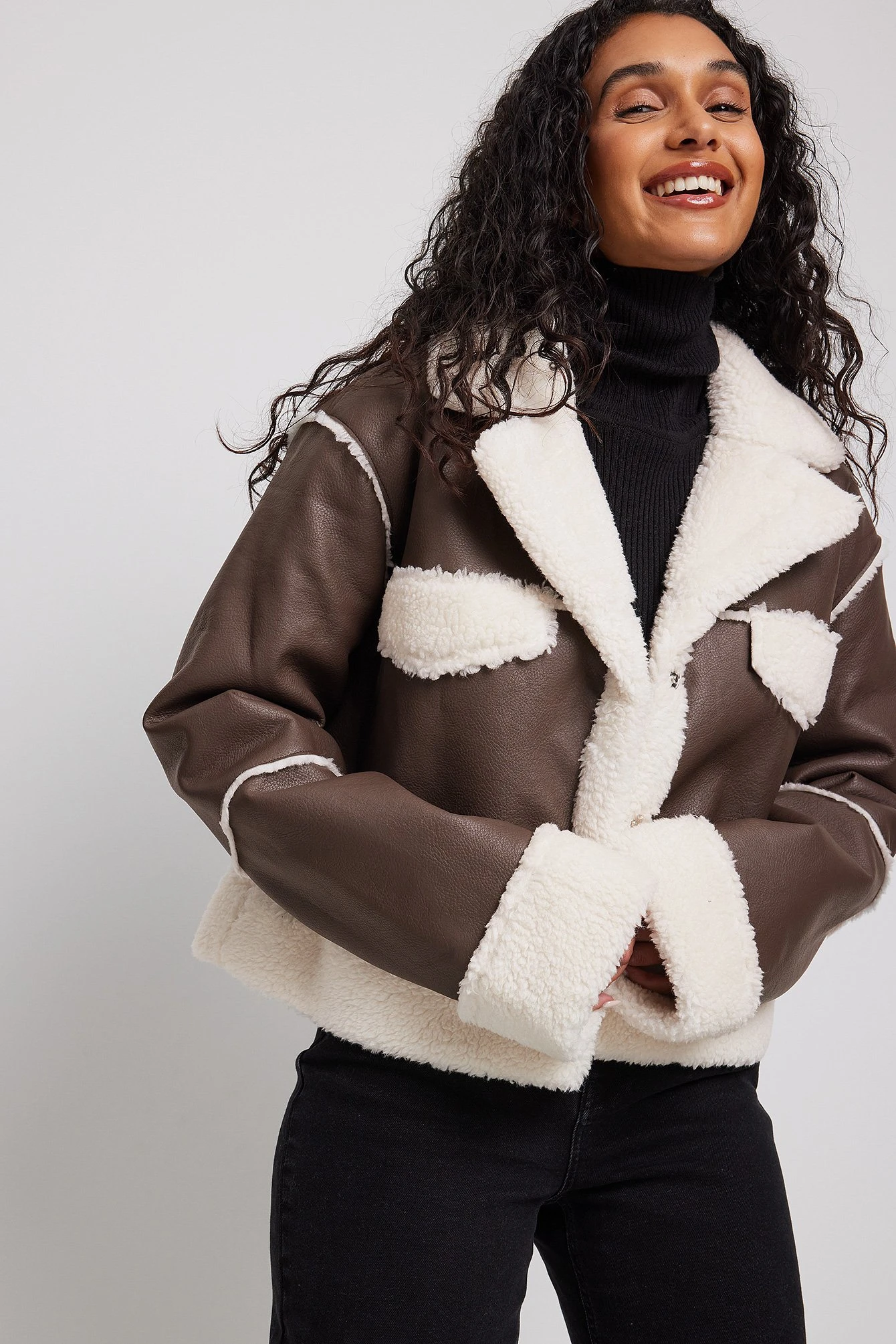 This jacket is pocketless and made of PU and features aviator style with a lapel neckline with snap buttons along the front, long sleeves and teddy details.