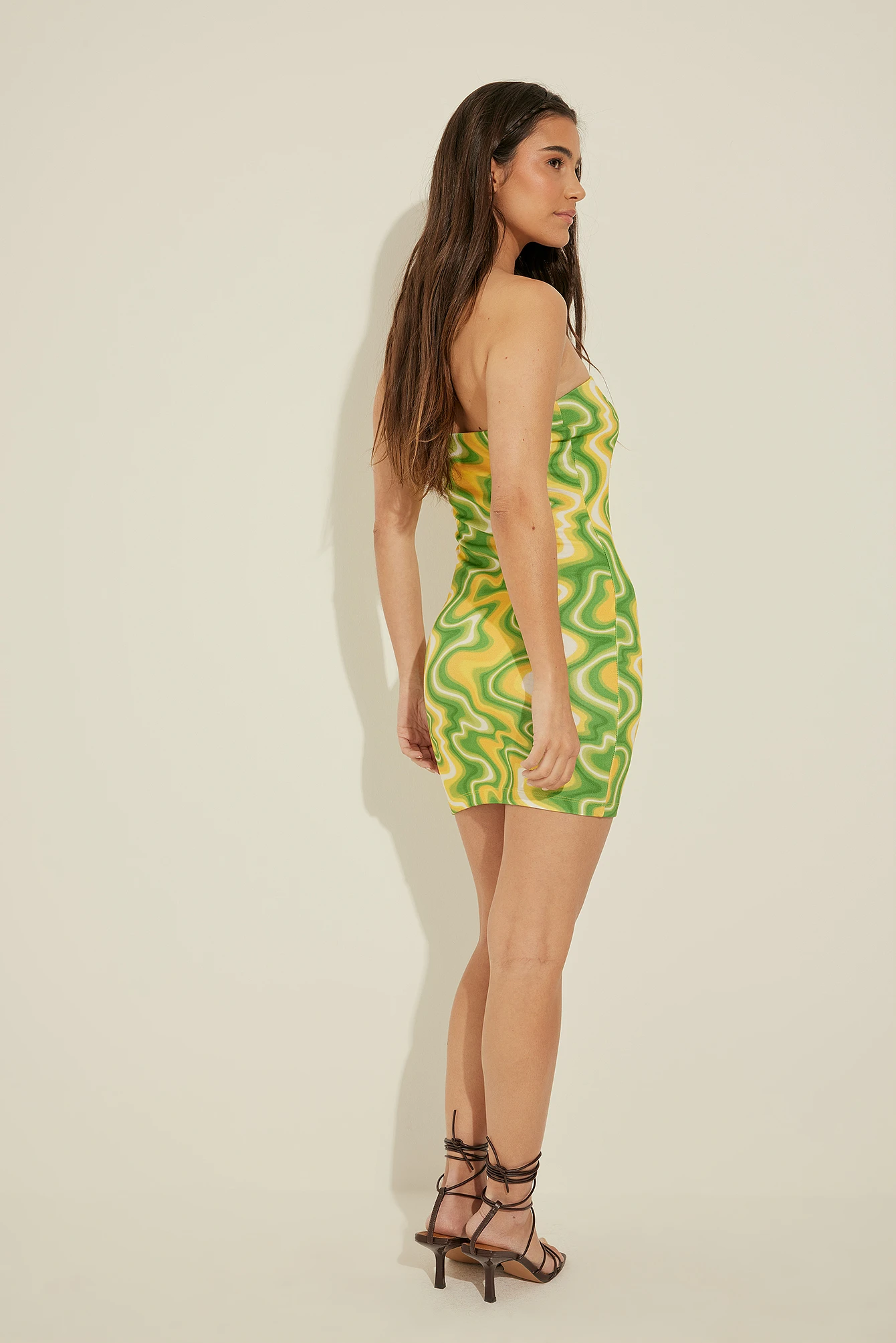 This mini dress is bodycon and features a bandeau design and a stretchy material.