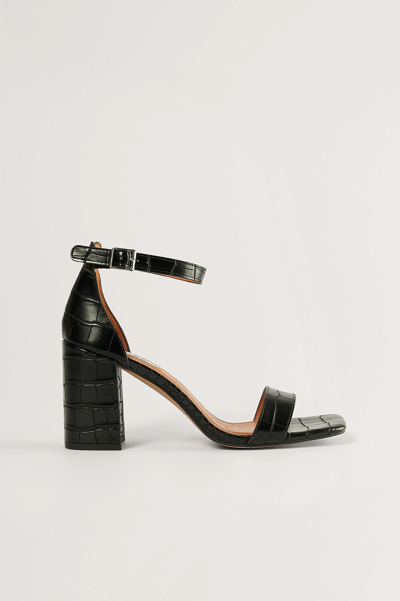 These sandals are high-heeled and basic and feature a block heel, a squared toe, a strap on the front, an adjustable ankle-strap fastening and a fake snake pattern. Heel Height: 9 cm / 3.54 in.
