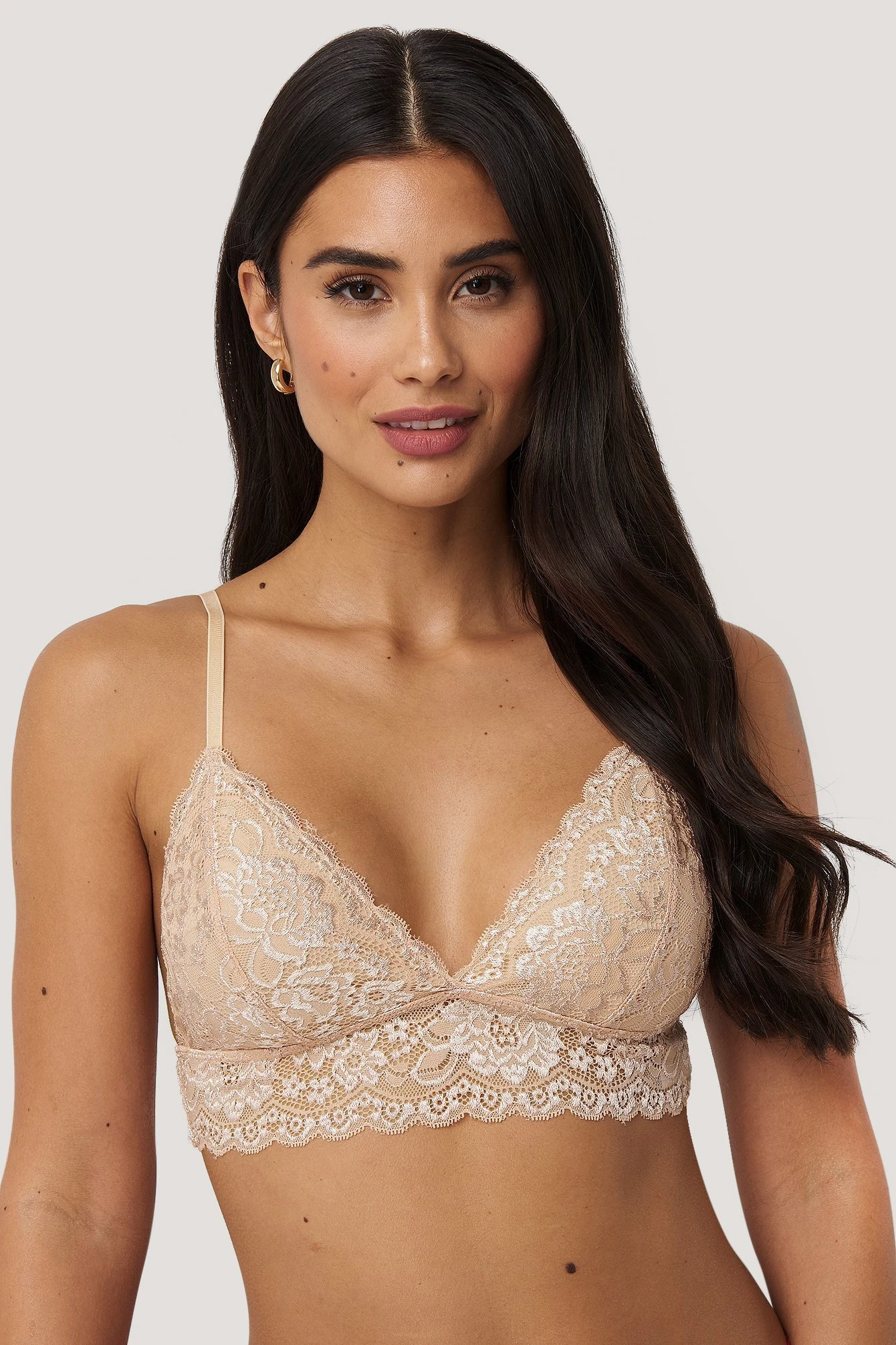This lace bra features lined cups with a stretchy material and adjustable shoulder straps.