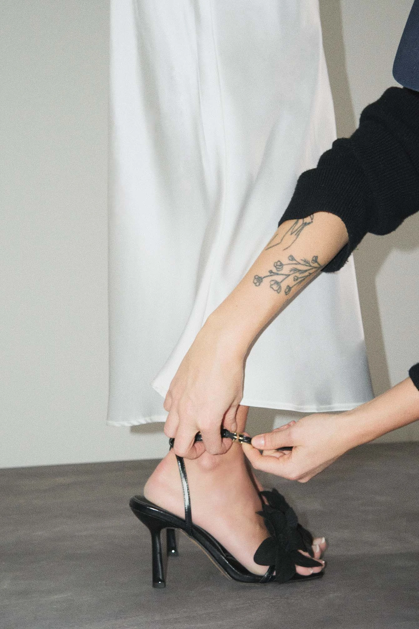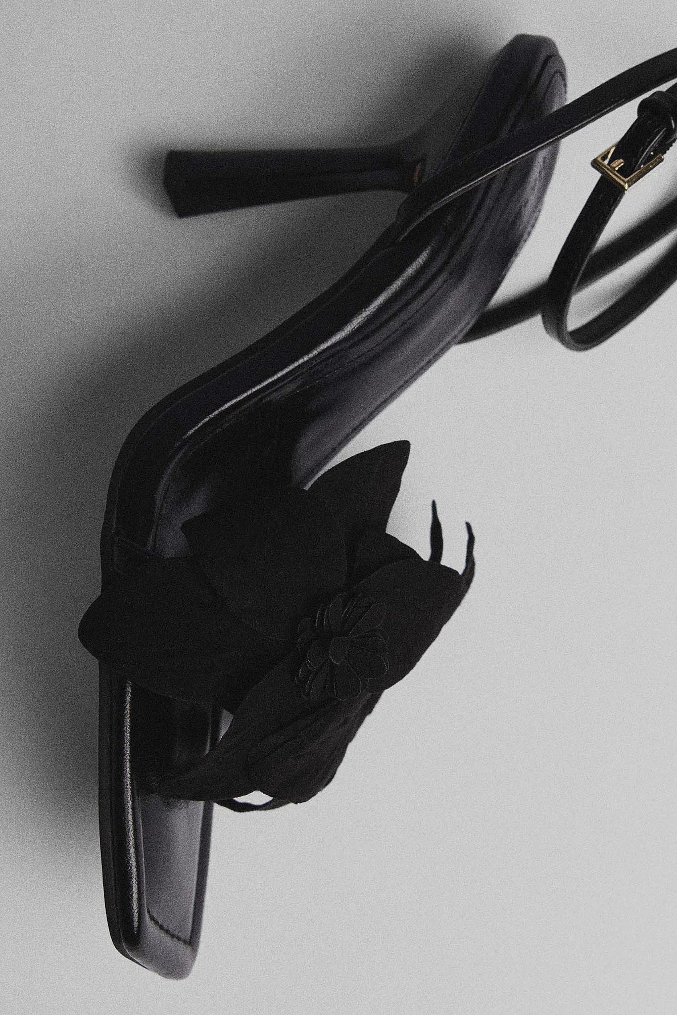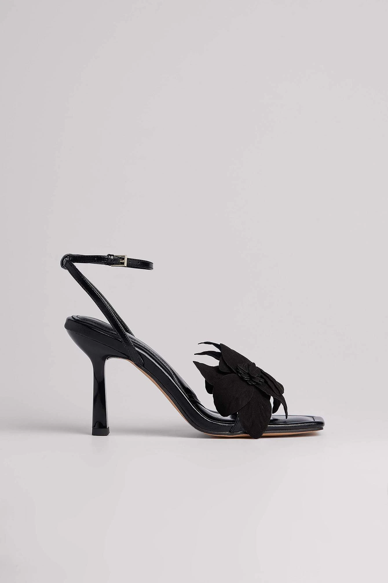 These sandals are high-heeled and feature an adjustable strap on the ankle. They have a square toe and an embellishment with flowers. Measurements in size 39: Heel height: 9,5 cm / 3.8 in. Insole length: 26 cm / 10.1 in.