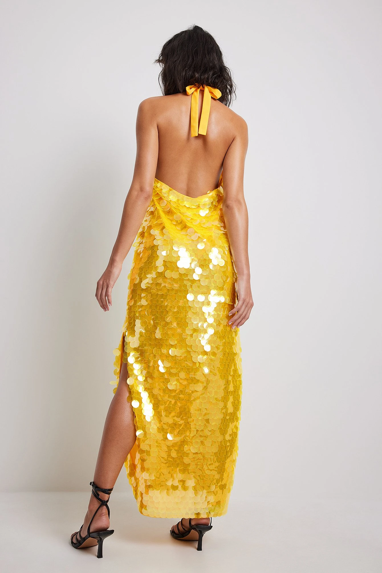This midi dress features a big sequin detail, a halterneck with a self tie detail and side slits.