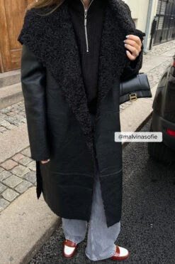 This coat features faux fur on the inside, a faux leather material on the outside with seam details, a self tie waist belt with belt loops and 2 side pockets with lining in PU.