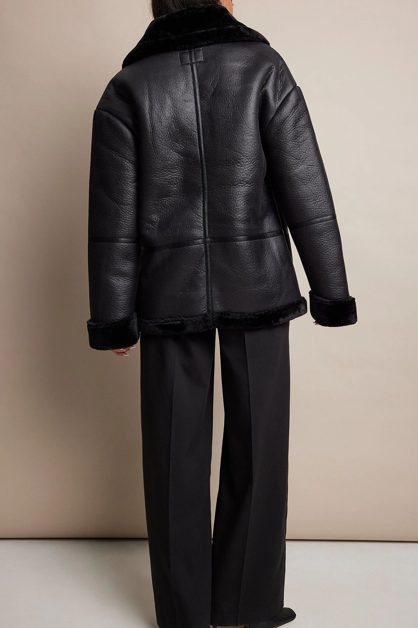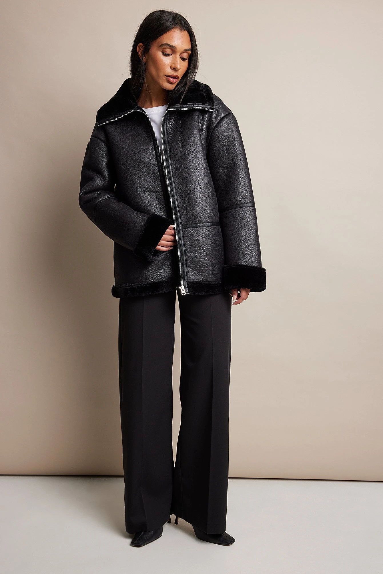 This jacket features a stand collar, faux fur trims, a zipper closure, long sleeves, side pockets, an oversized fit and a super soft inside.