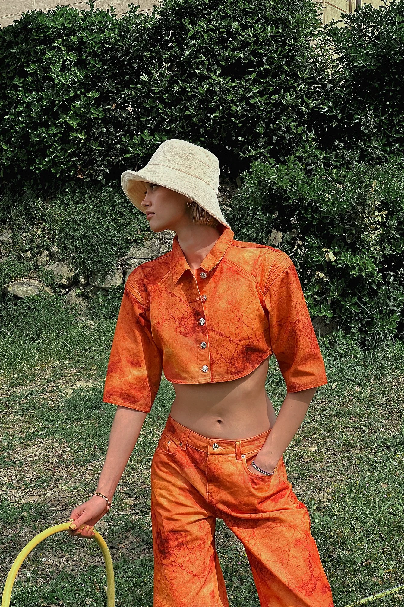 This denim jacket features a cropped design, a button closure and short sleeves.
