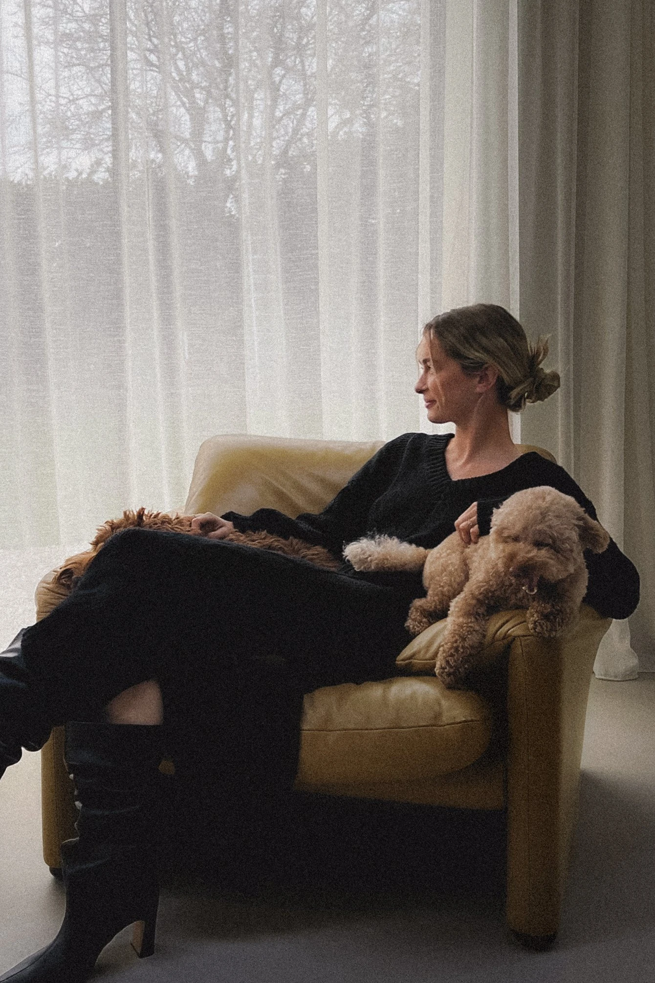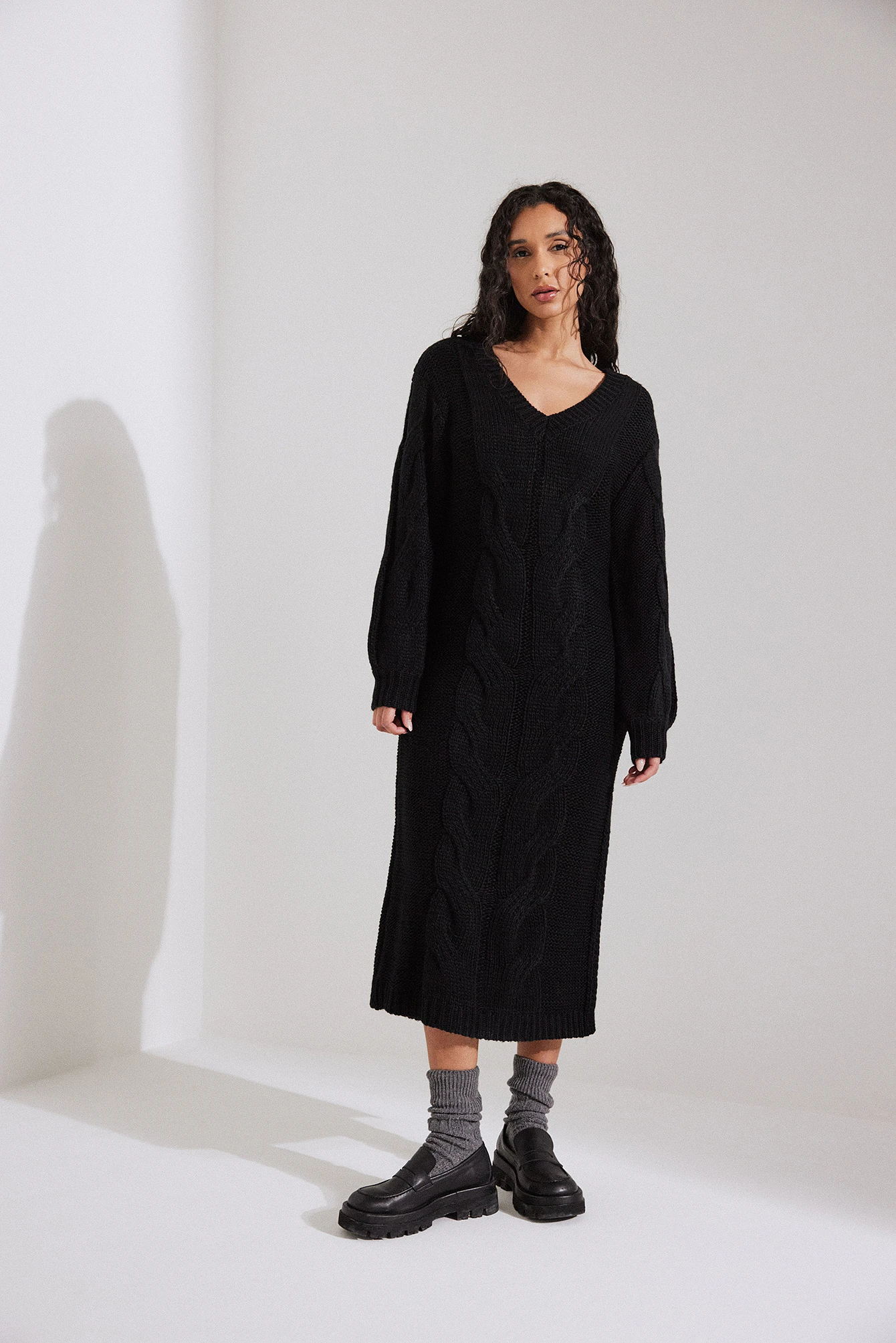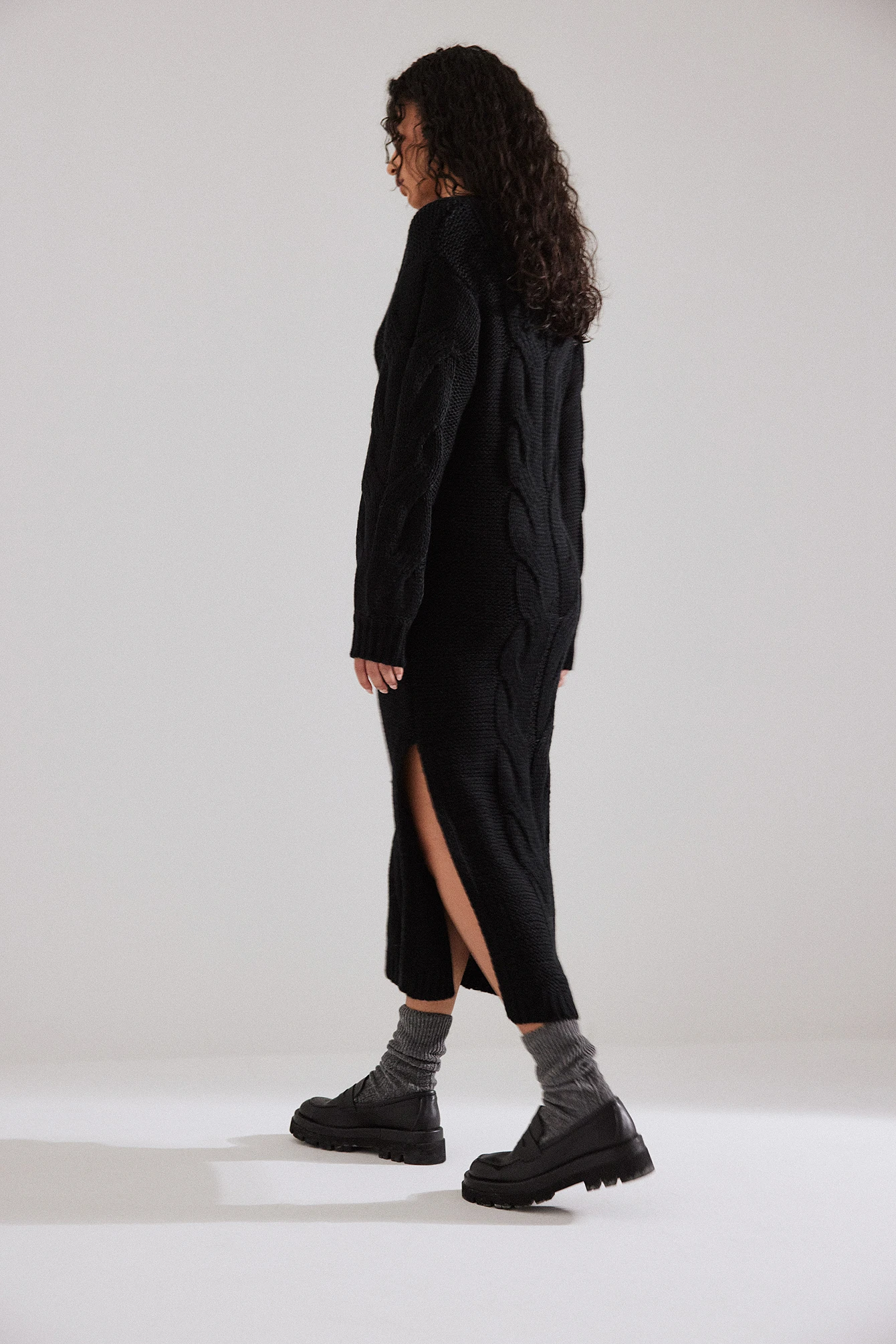 This midi dress is knitted and features an oversized fit. It has a v-neck cut and ribbed cuffs. This midi dress features a slit detail on the sides.