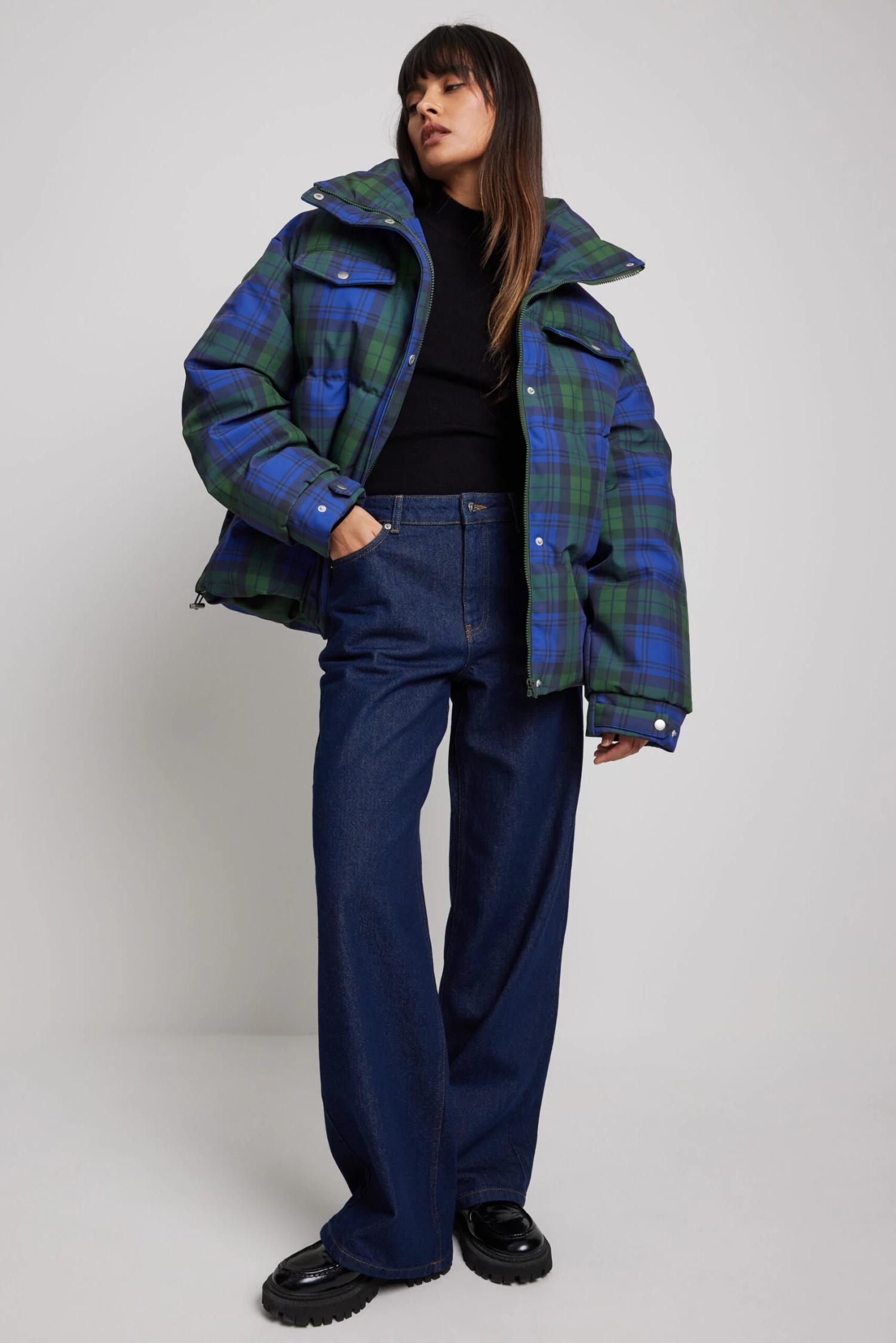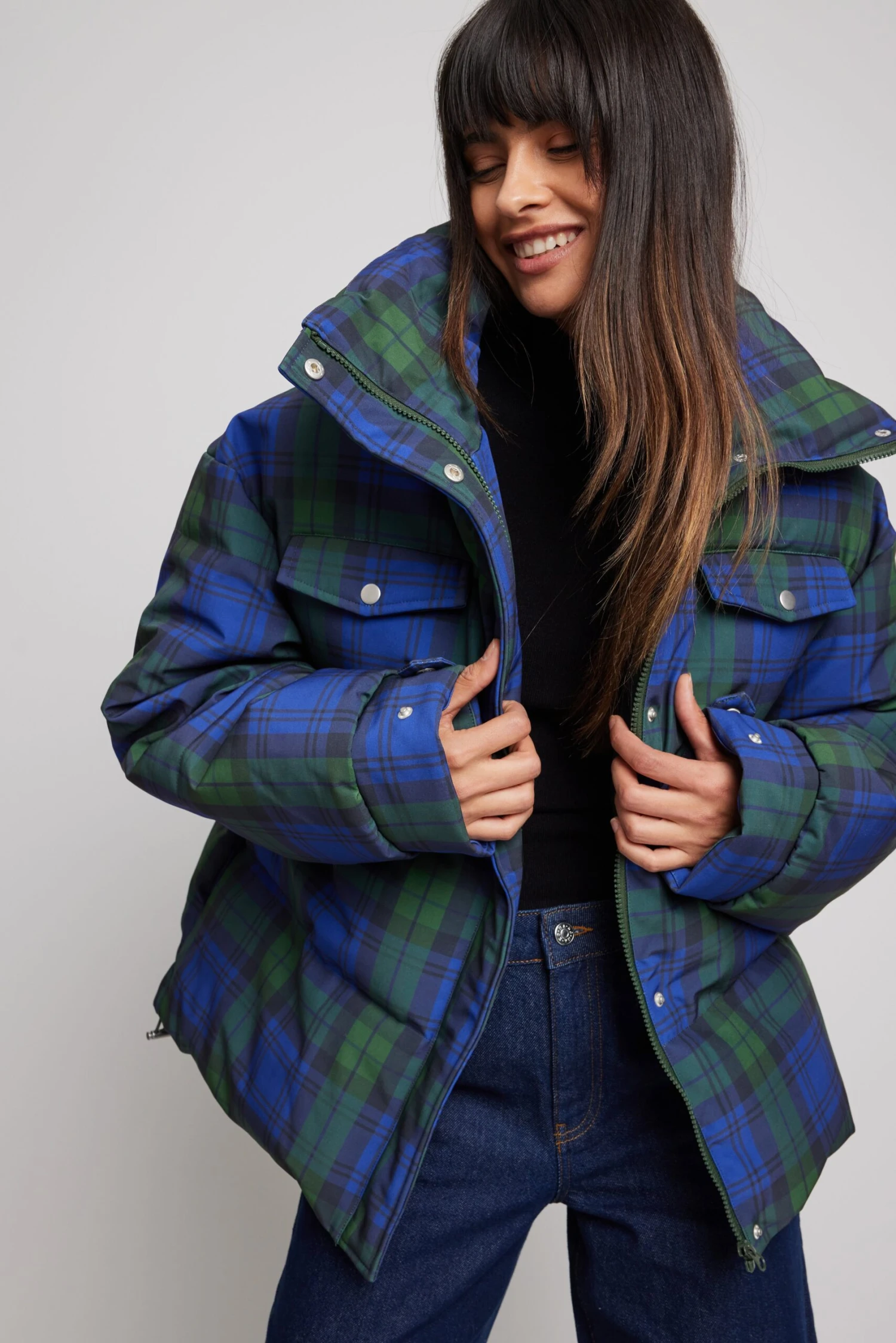 This jacket is quilted and patterned and features a puffer, a high neckline, long sleeves with adjustable cufflinks, a zipper closure with a button closure, flap front pockets on the chest, side pockets and a drawstring detail on the waist.
