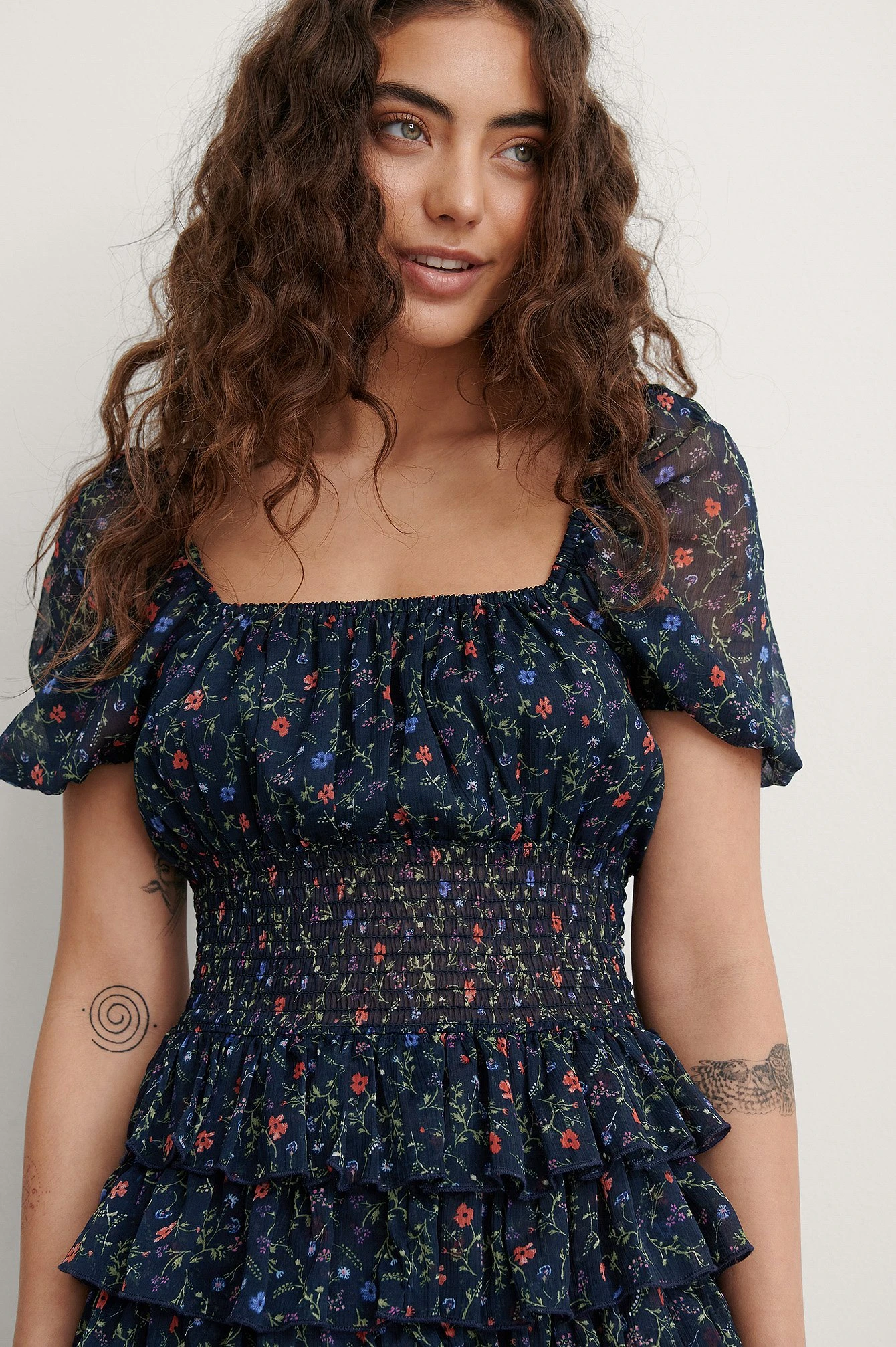 This dress features a square neckline, transparent short sleeves, a smocked, elasticized waistband, frill layers, a flowy fit and a mini length.