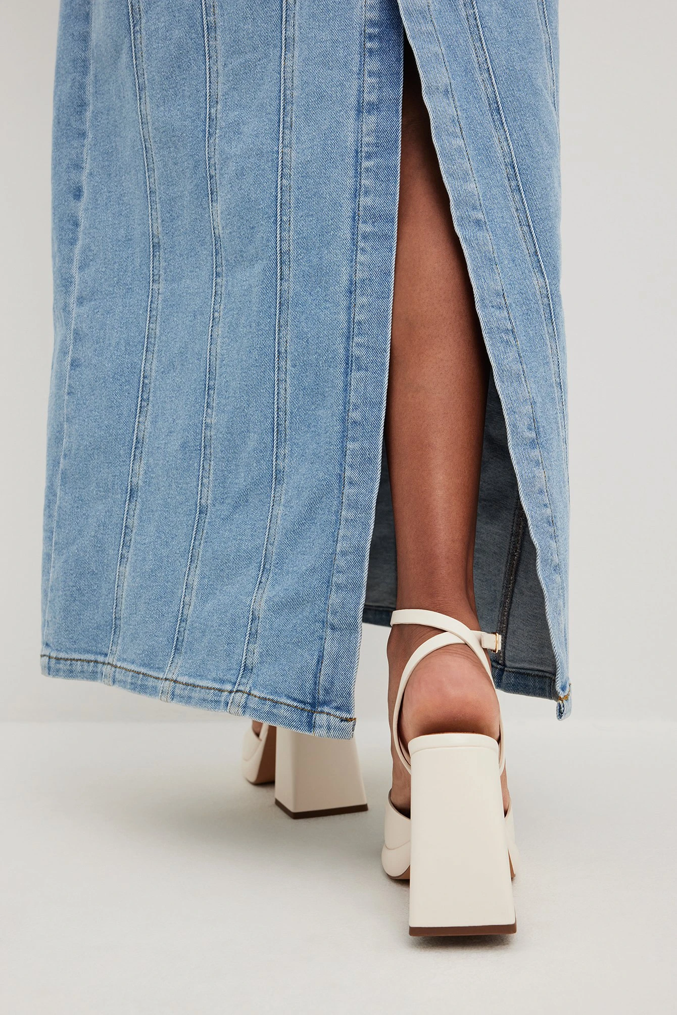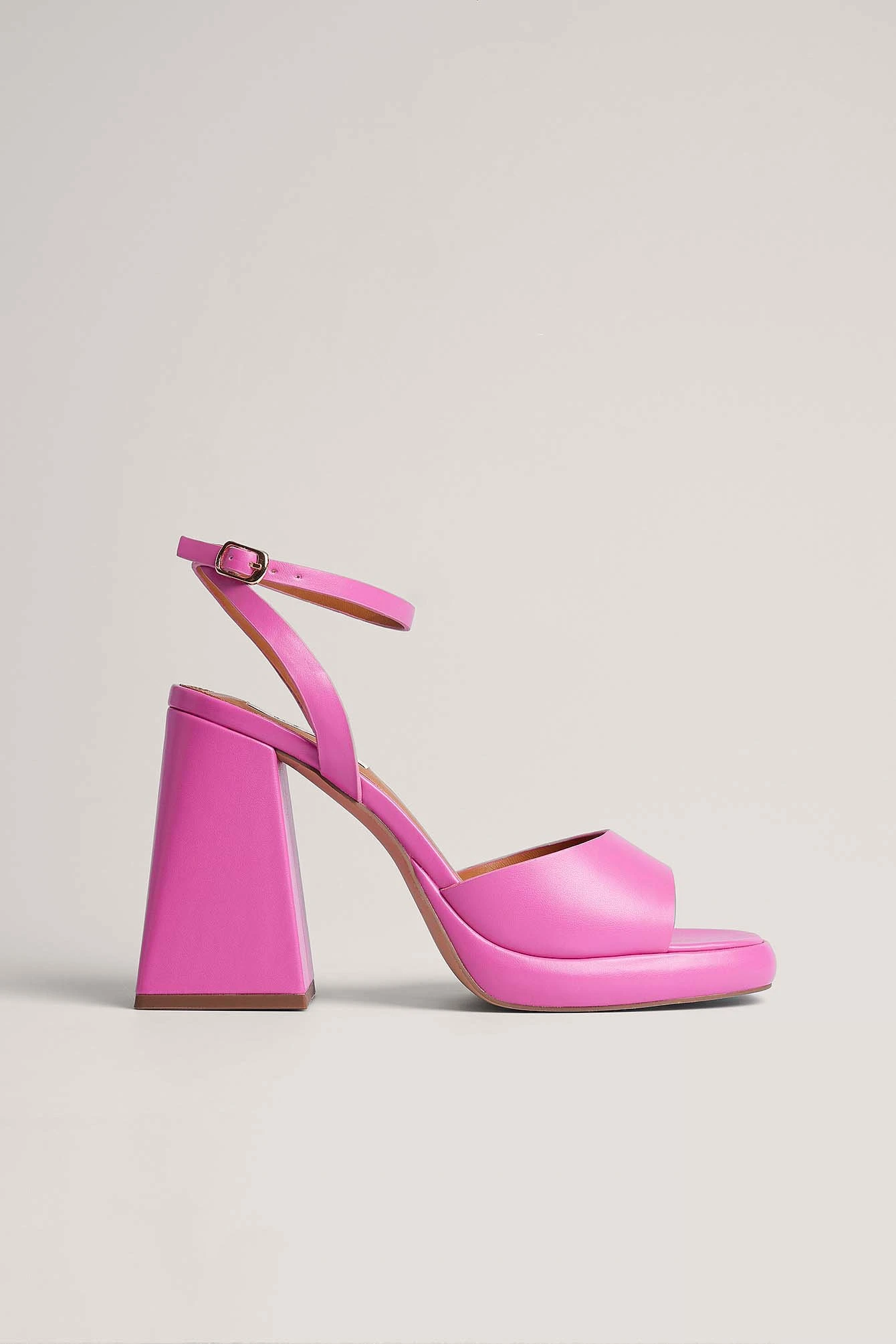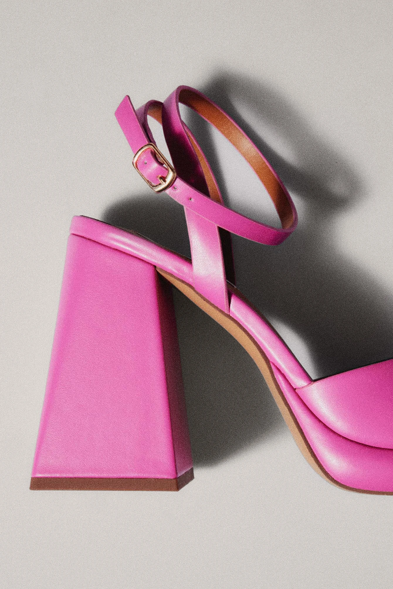 These heels feature a chunky heel. They have an adjustable ankle-strap fastening and a rounded toe. Measurements in size 39: Sole height: 2 cm / 0.8 in. Heel height: 10,7 cm / 4.2 in.