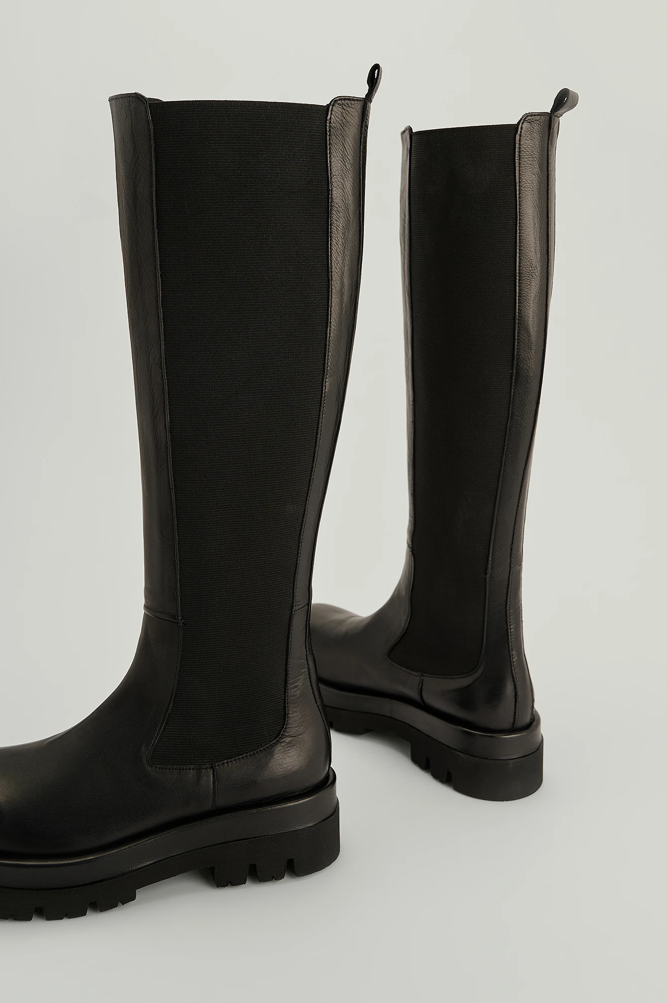 These boots are knee high and feature elasticized shafts, a rounded toe and a chunky sole. Big in size. Sole Height: 4,8 cm / 2 in. The shaft height on this boot measures 43,7 cm / 17.2 in in size 39. The shaft height might differ from size to size.