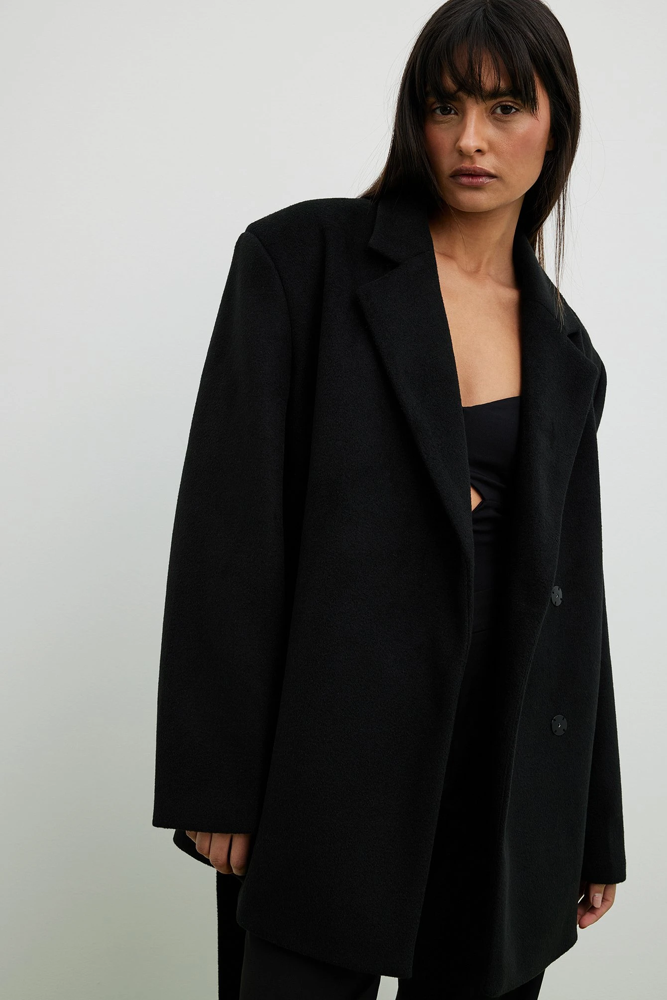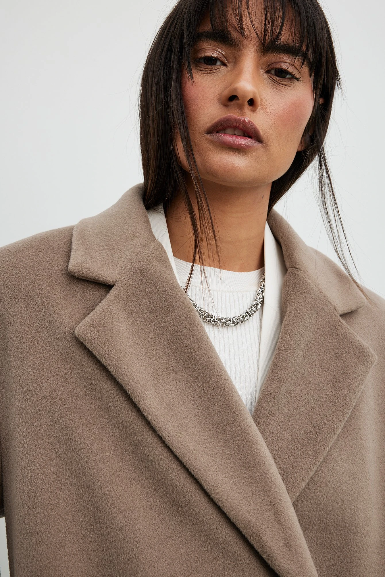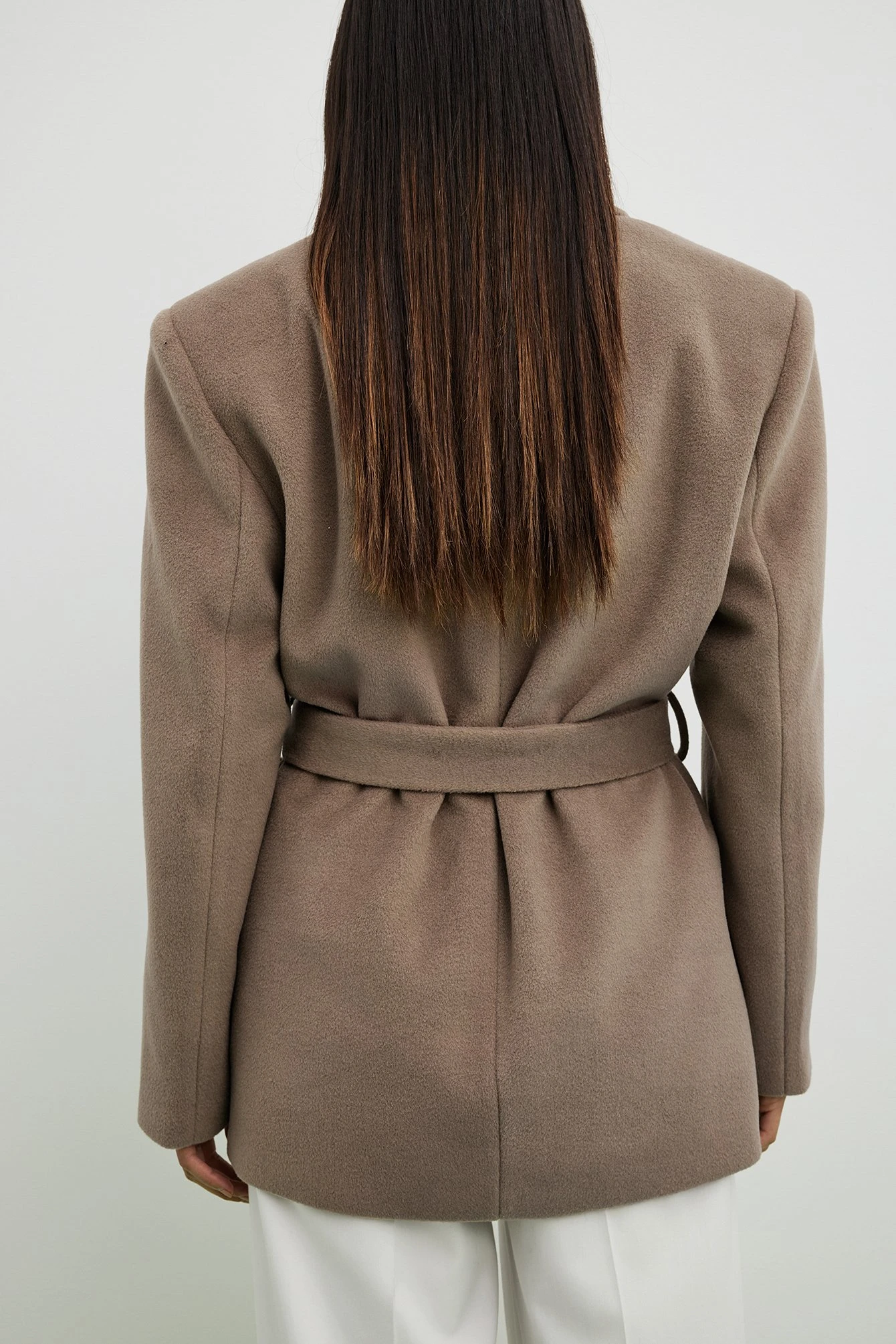This coat is short and belted and features a lapel detail. It has an overlap design with a snap button closure.