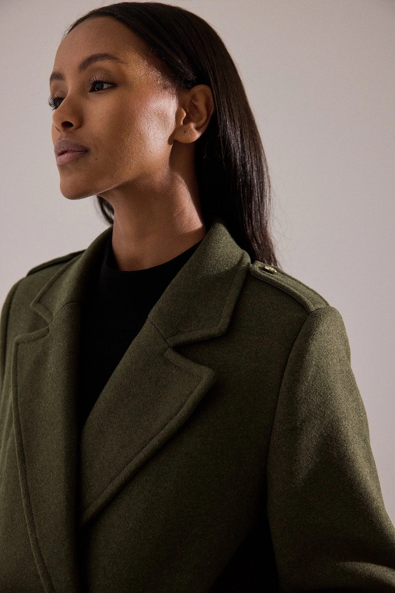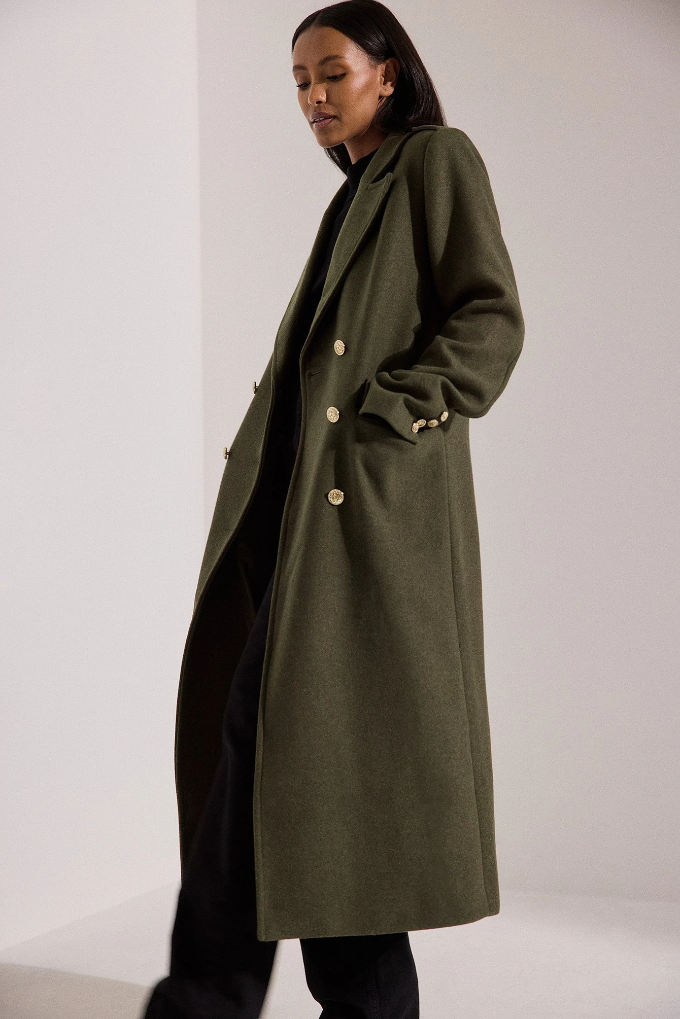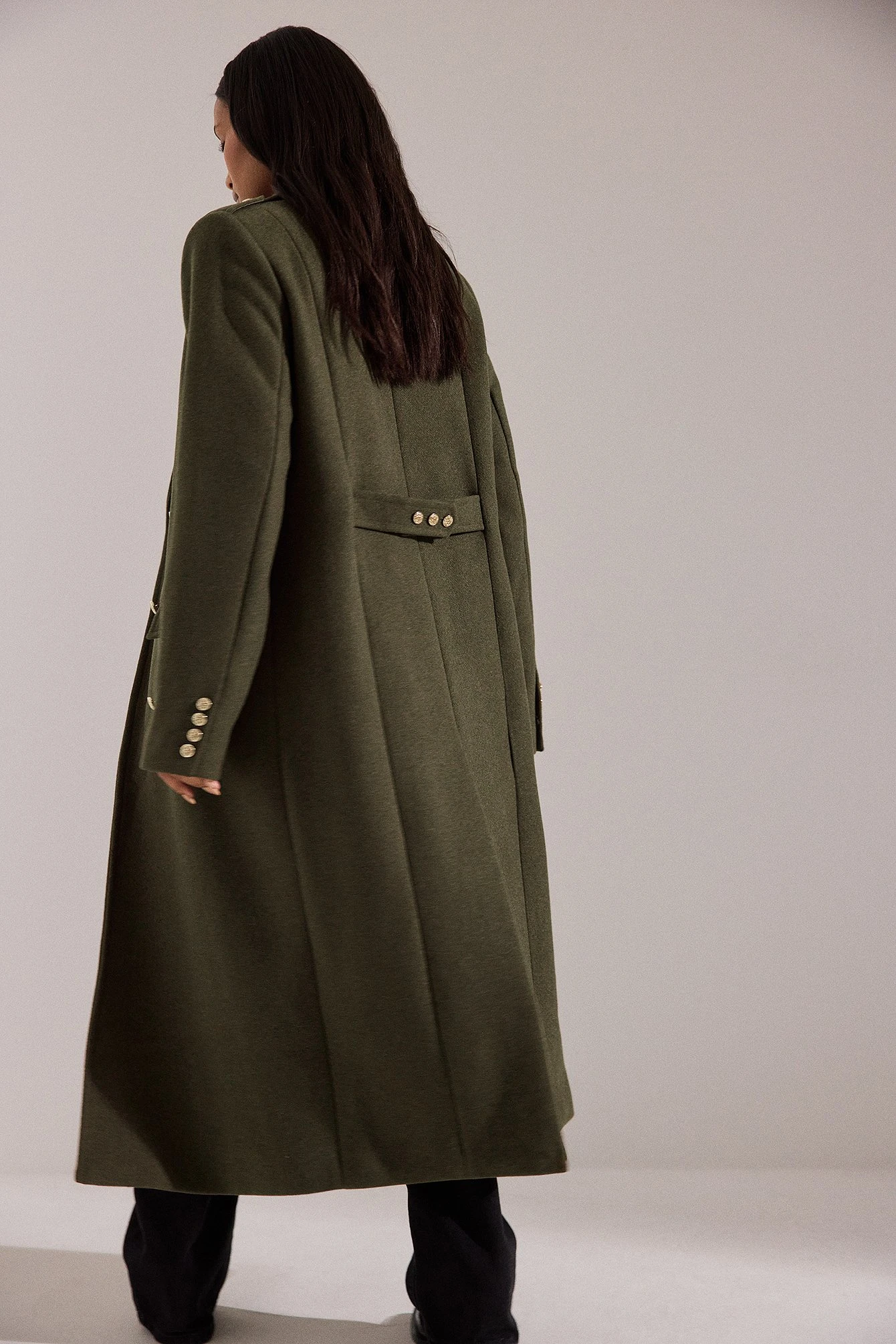 This coat features padded shoulders with button details. It has double button closures at the front and button cuffs. This coat features front flap pockets, a back slit detail and button details at the back.