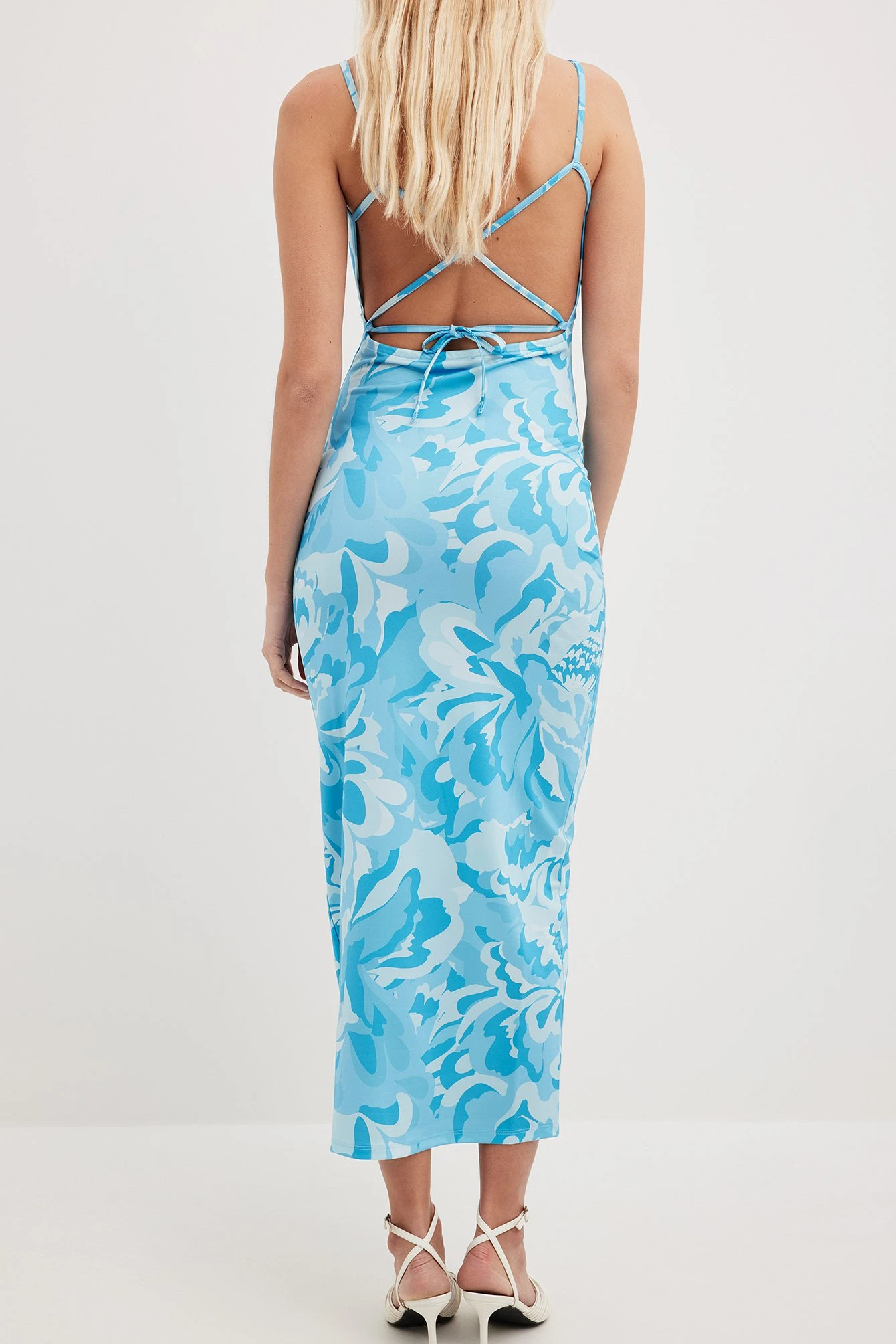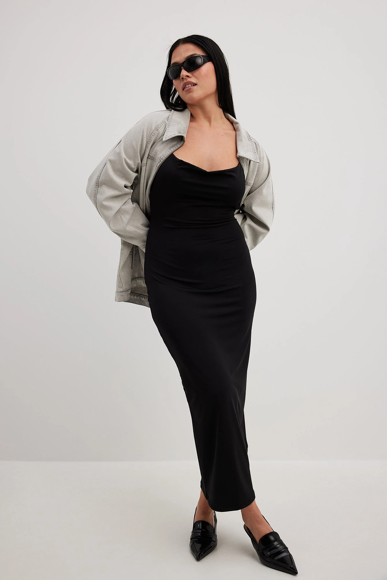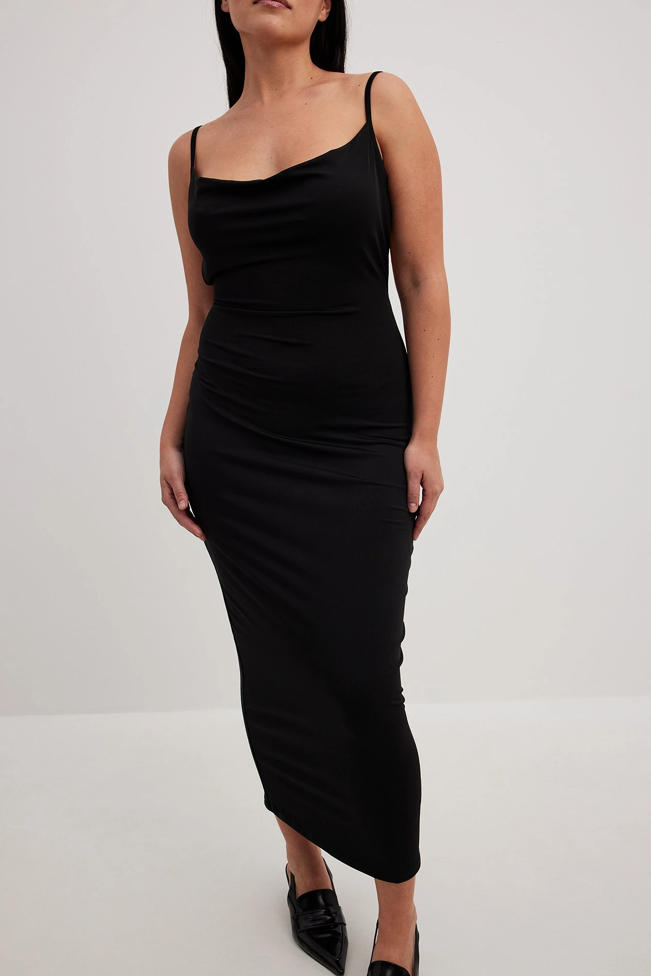 This dress features a waterfall neckline. It has shoulder straps and an open back design. This dress features a midi length and a stretchy material.