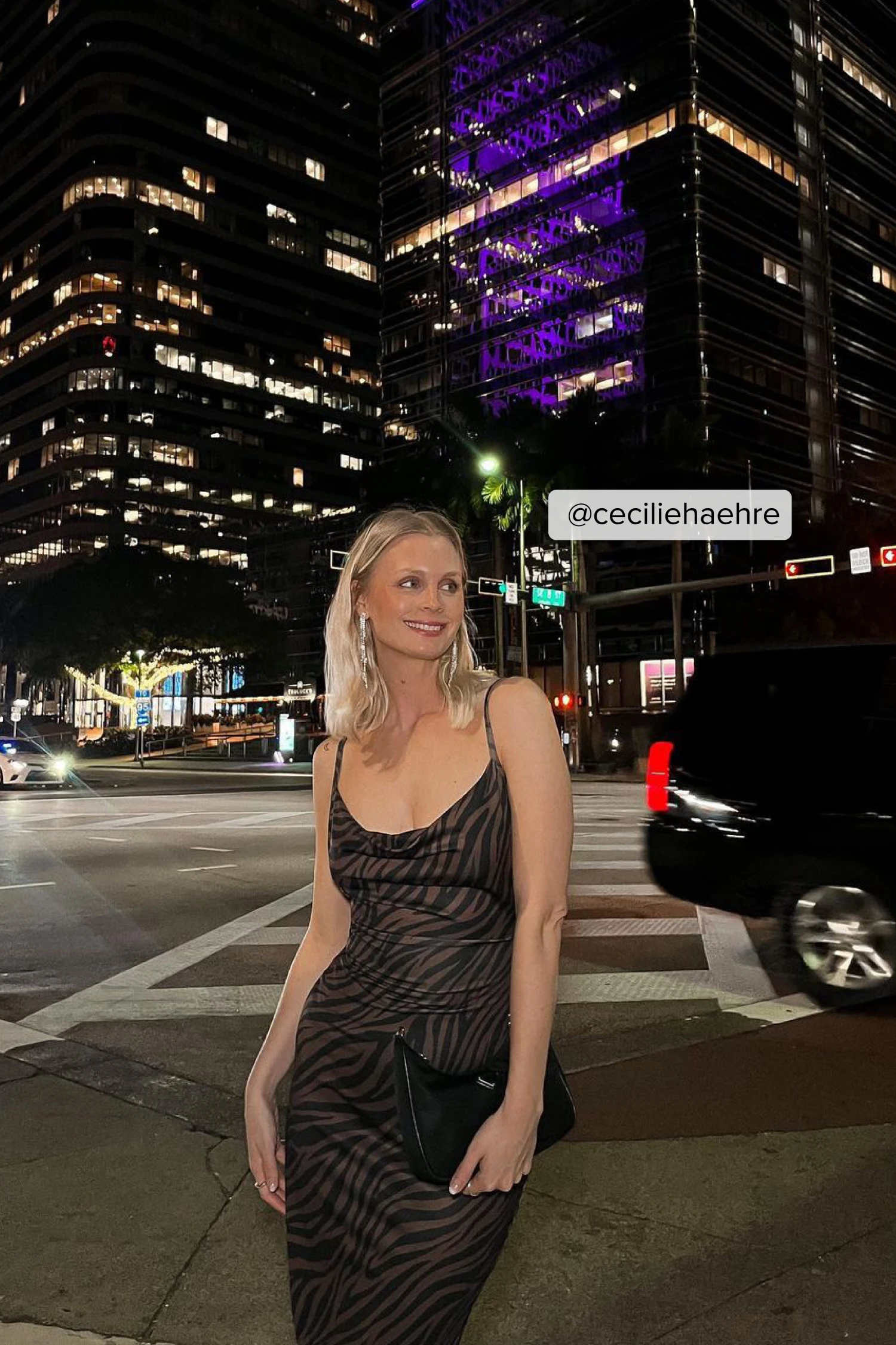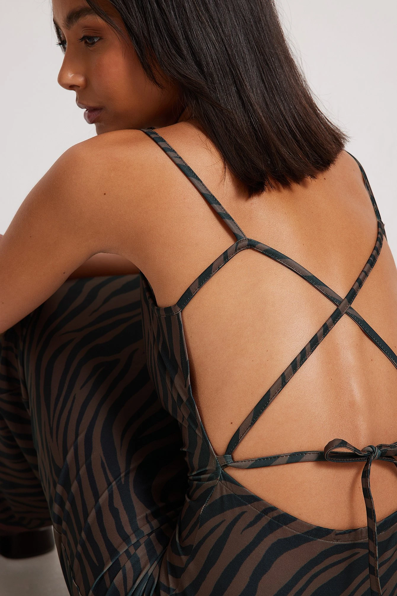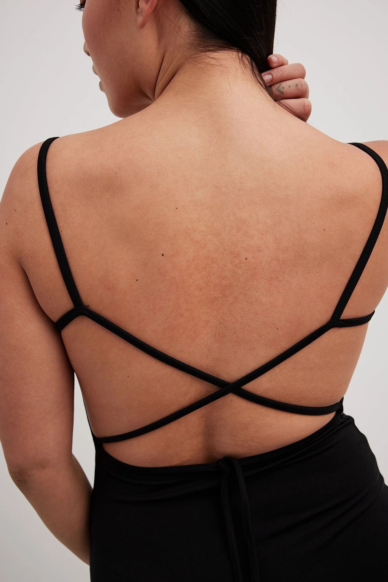This dress features a waterfall neckline. It has shoulder straps and an open back design. This dress features a midi length and a stretchy material.