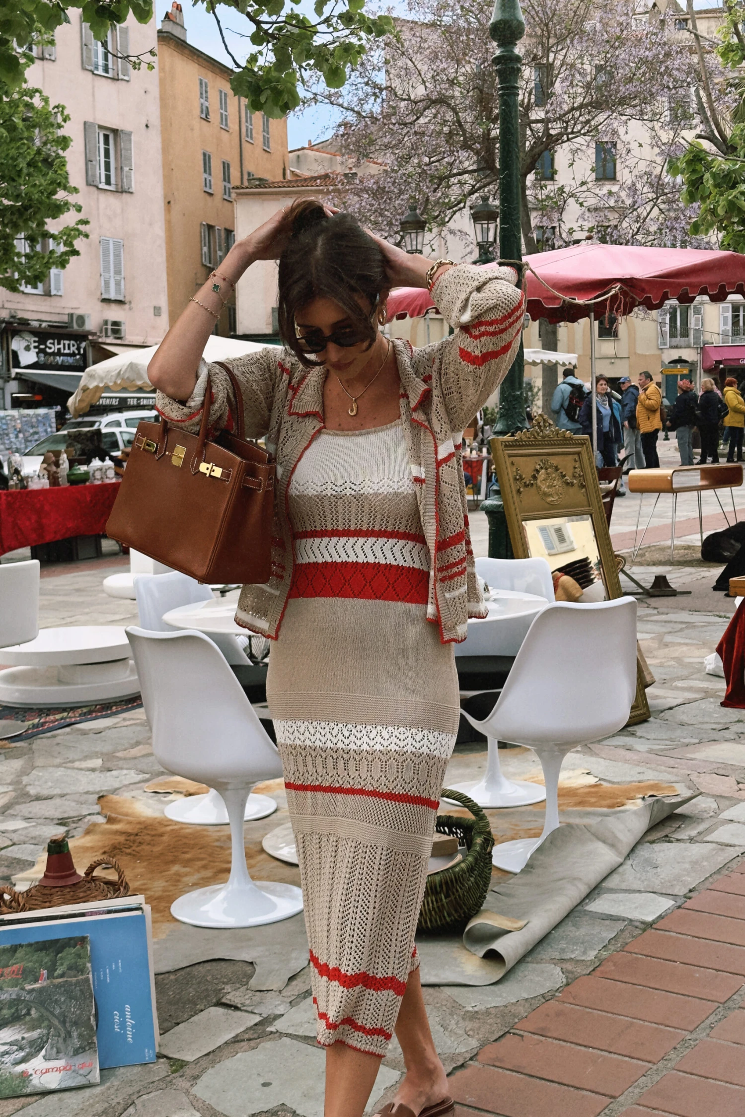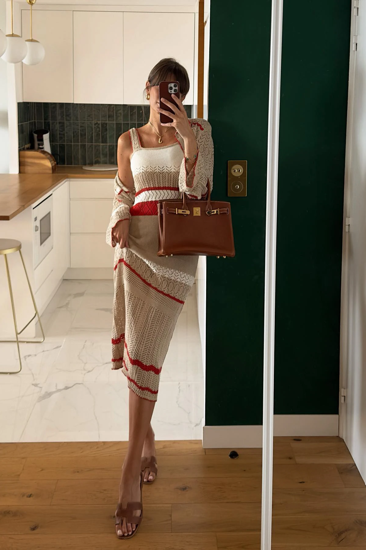 This midi dress is stretchy and knitted and features crochet details. It has wide shoulder straps.