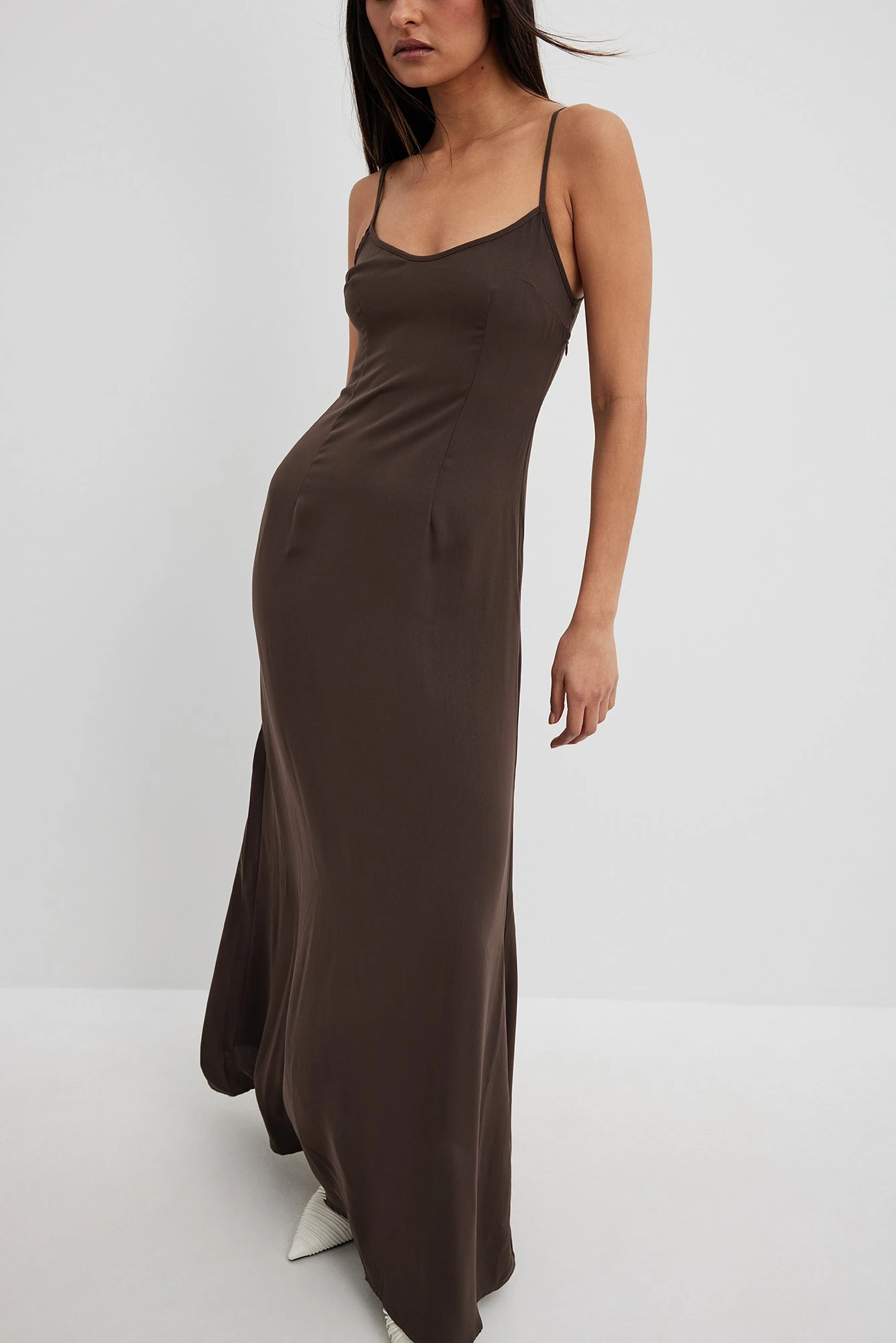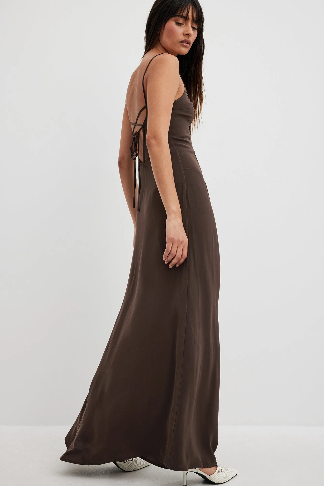 This maxi dress features non adjustable shoulder straps, a scoop back with a crossed self tied knot band, a hidden side zipper closure and a flowy fit.