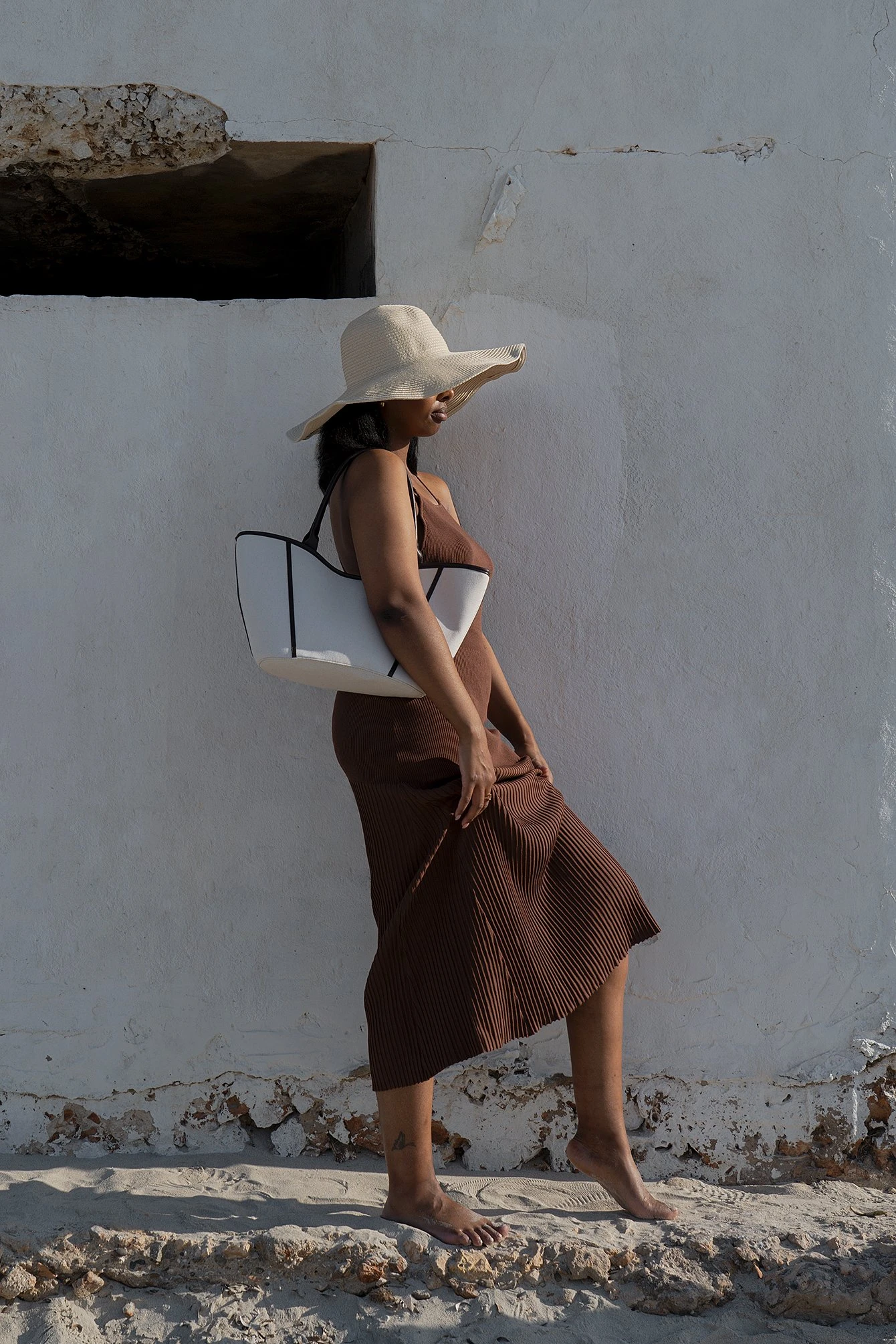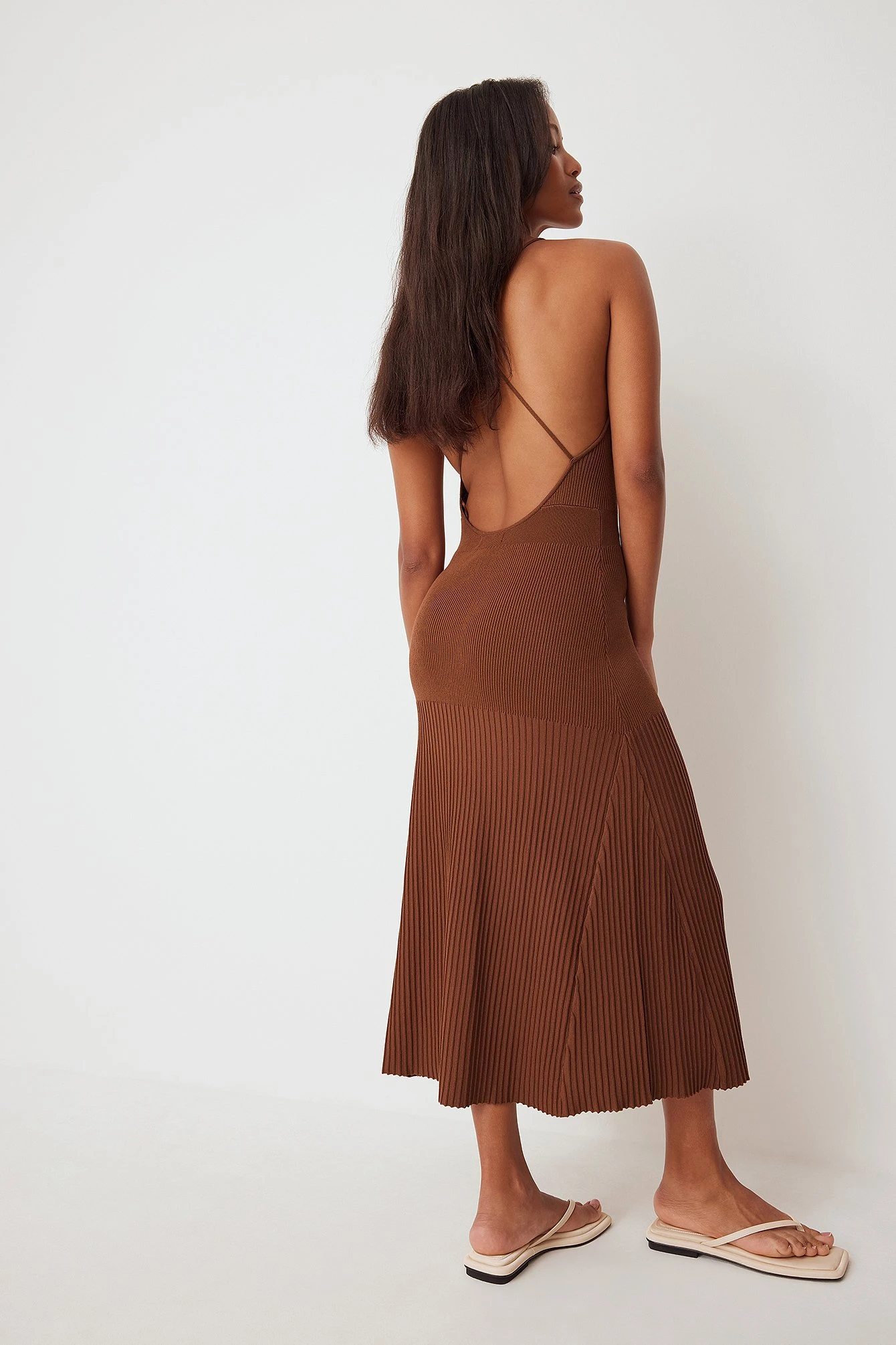This midi dress features cross back straps with an open back design, an a line skirt and a stretchy, rib-knit material.