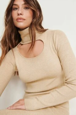 This knit dress is long and features long sleeves, a turtleneck, a cut out detail on the chest and a soft touch.