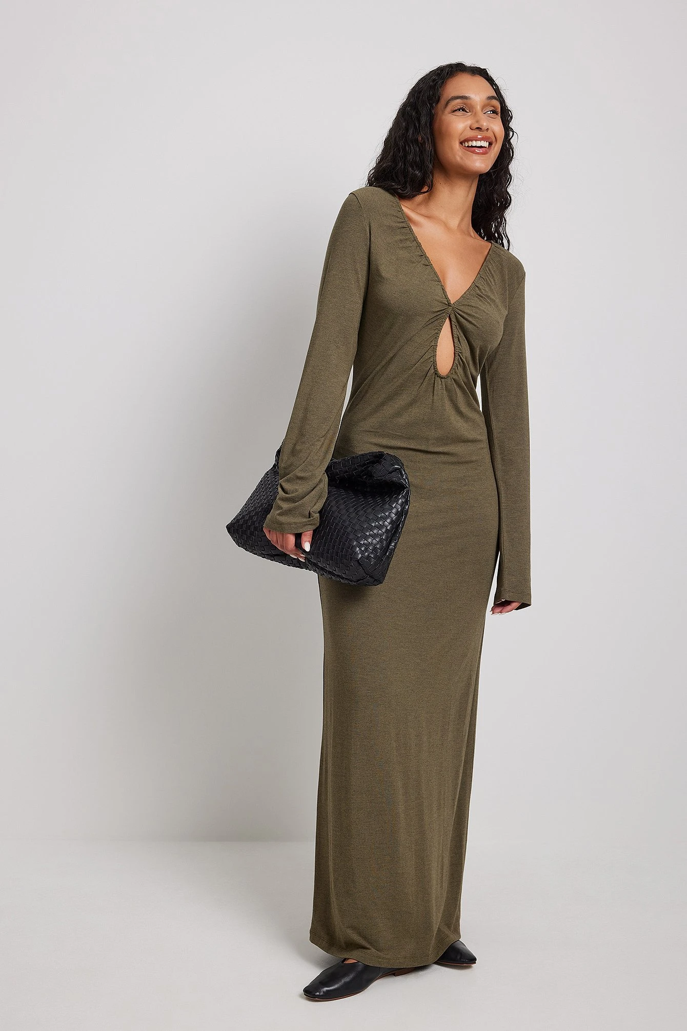 This dress features a v neckline with a cut out detail, long sleeves, a stretchy material and a maxi length.