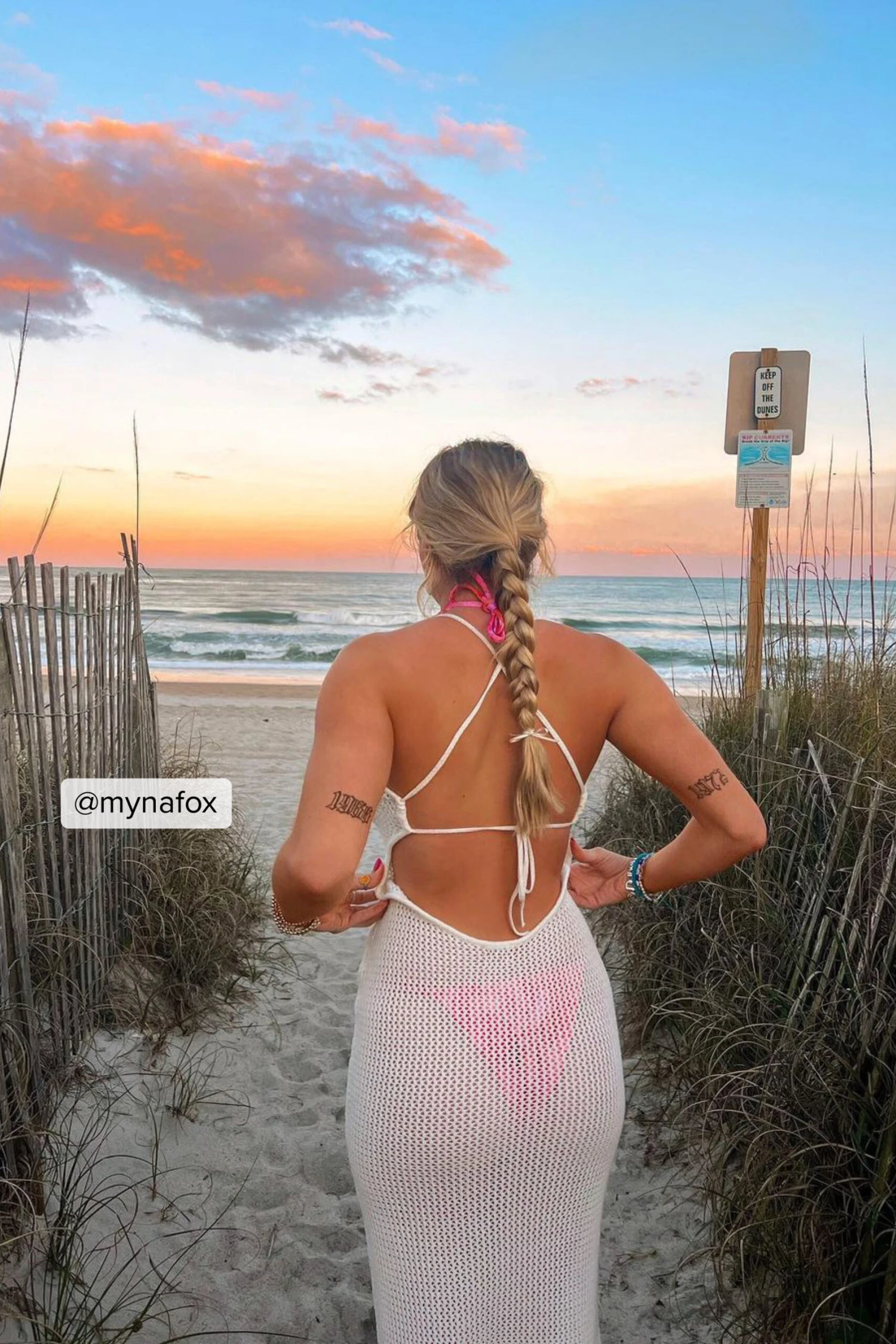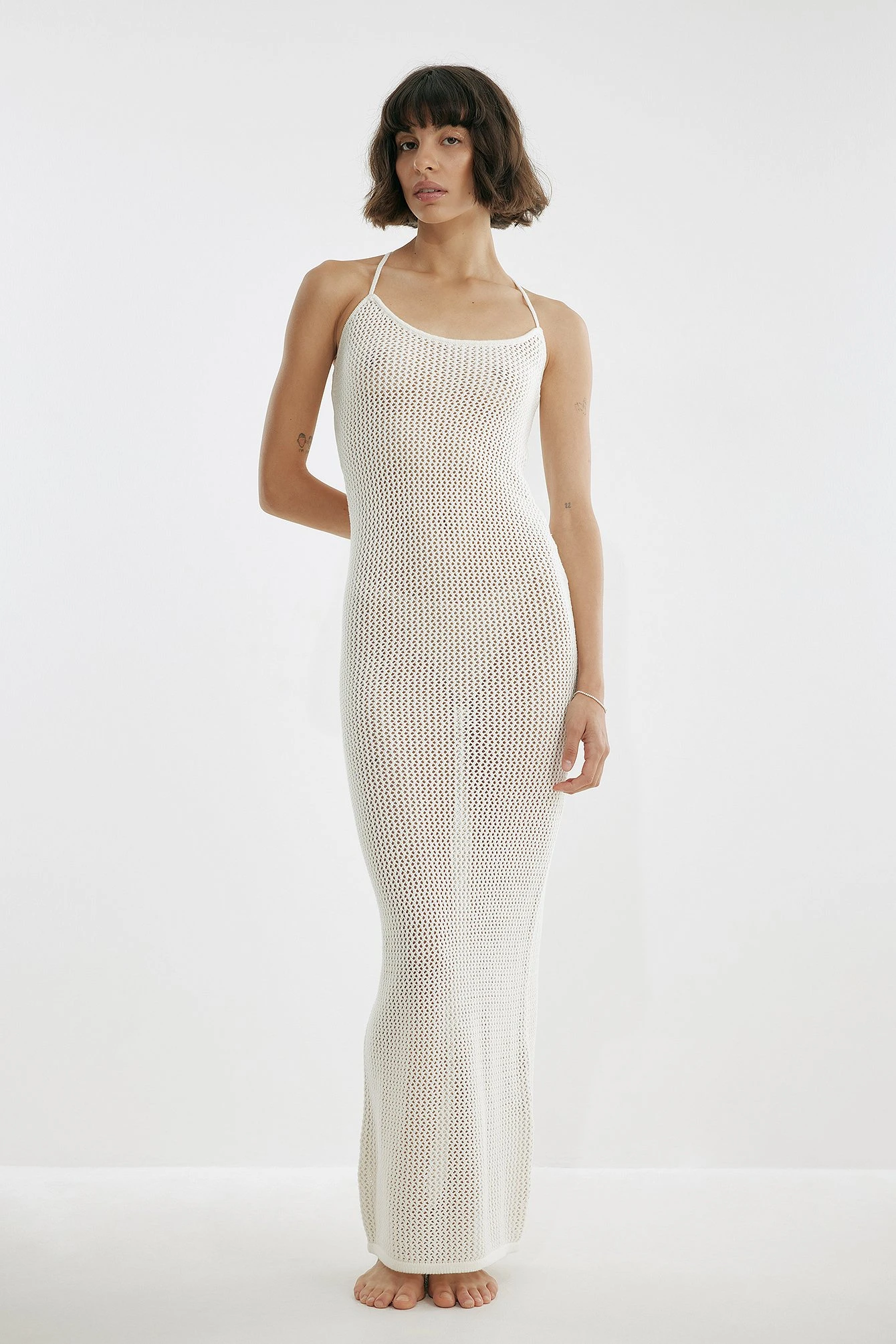 This maxi dress features crossed shoulder straps, a deep back with a self tie detail and a seethrough knit material.