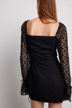 This mini dress features a crew neckline with a button closure on the back. It has long sleeves with a draped detail and shoulder pads and an elasticized waistband. This mini dress features a side zipper closure.