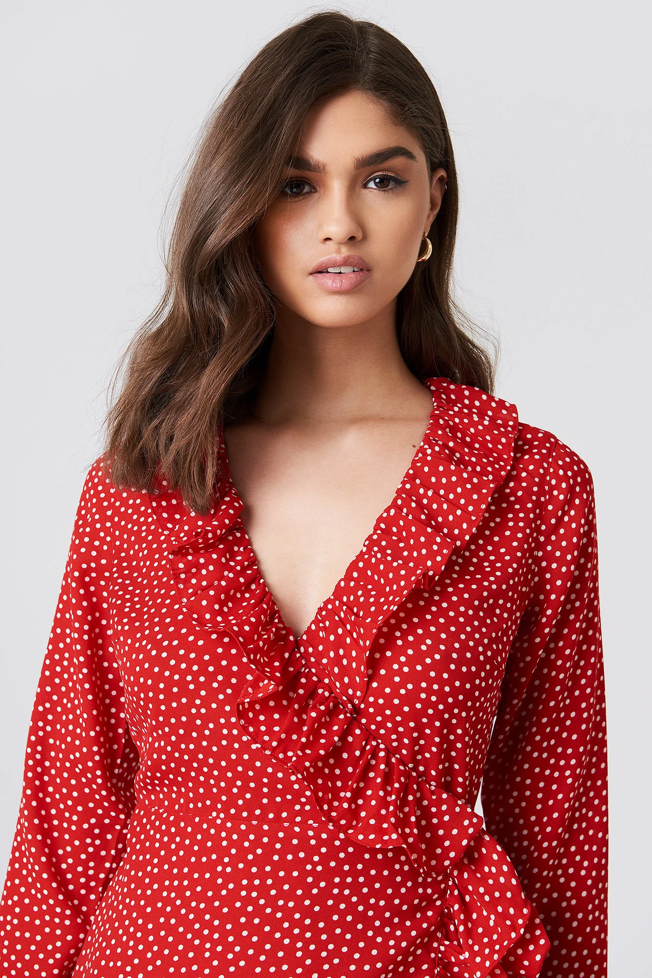 The Dotted Frill Dress by NA-KD Boho features a mini dress with a wrap-around front, frill design at the hems, long sleeve and a self-tie waist and is unlined.