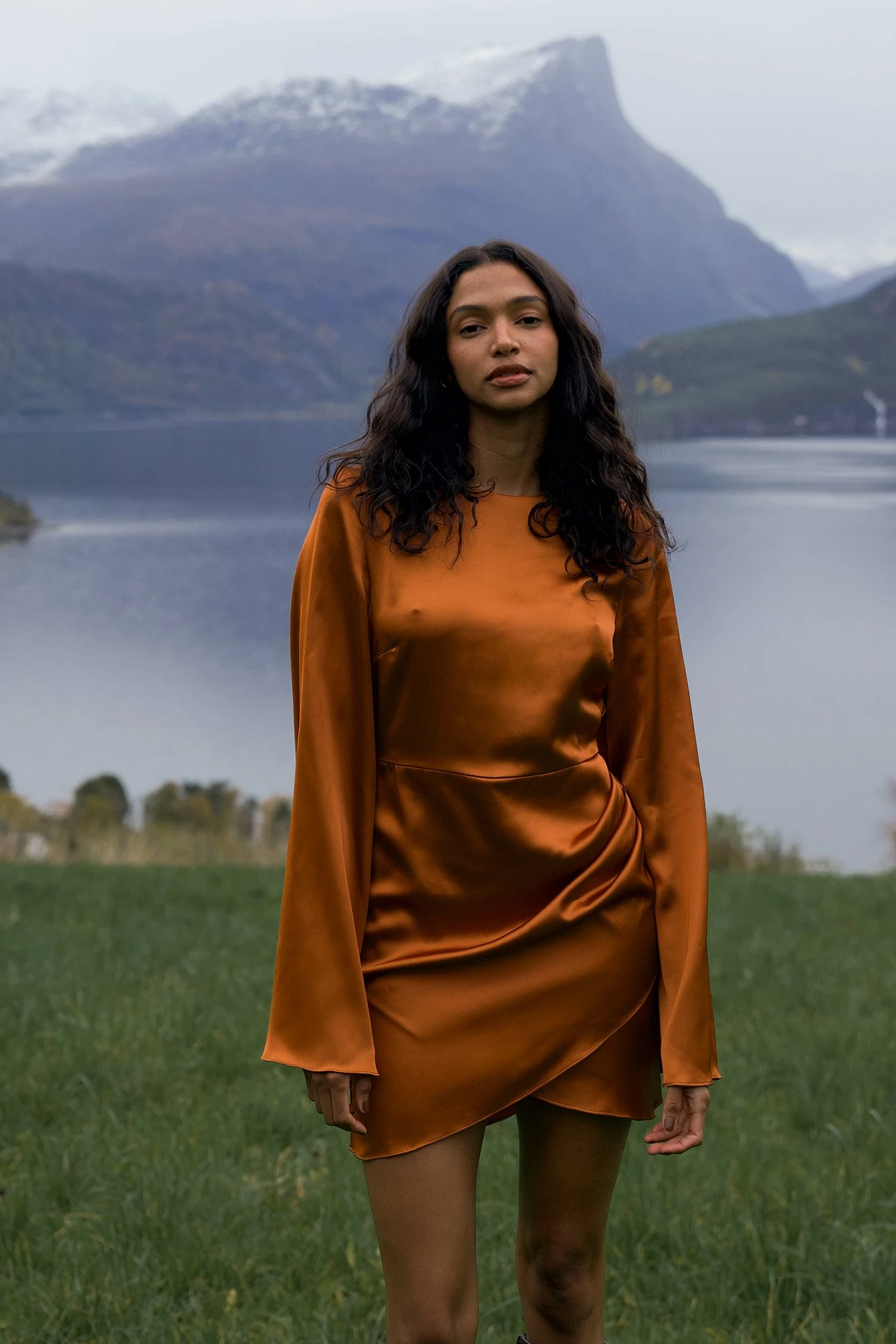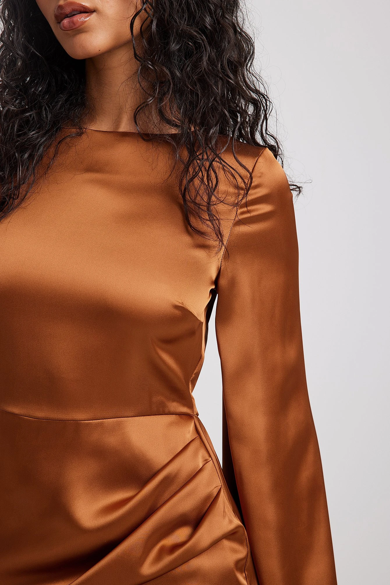 This mini dress is made of satin and features a crew neckline with a button closure at the back, flared long sleeves, a draped detail on one side and a skirt with a wrap detail.
