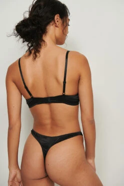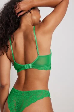 This triangle bra features thin adjustable shoulder straps, an unpadded cup with a lace design and a hook-and-eye closure at the back.
