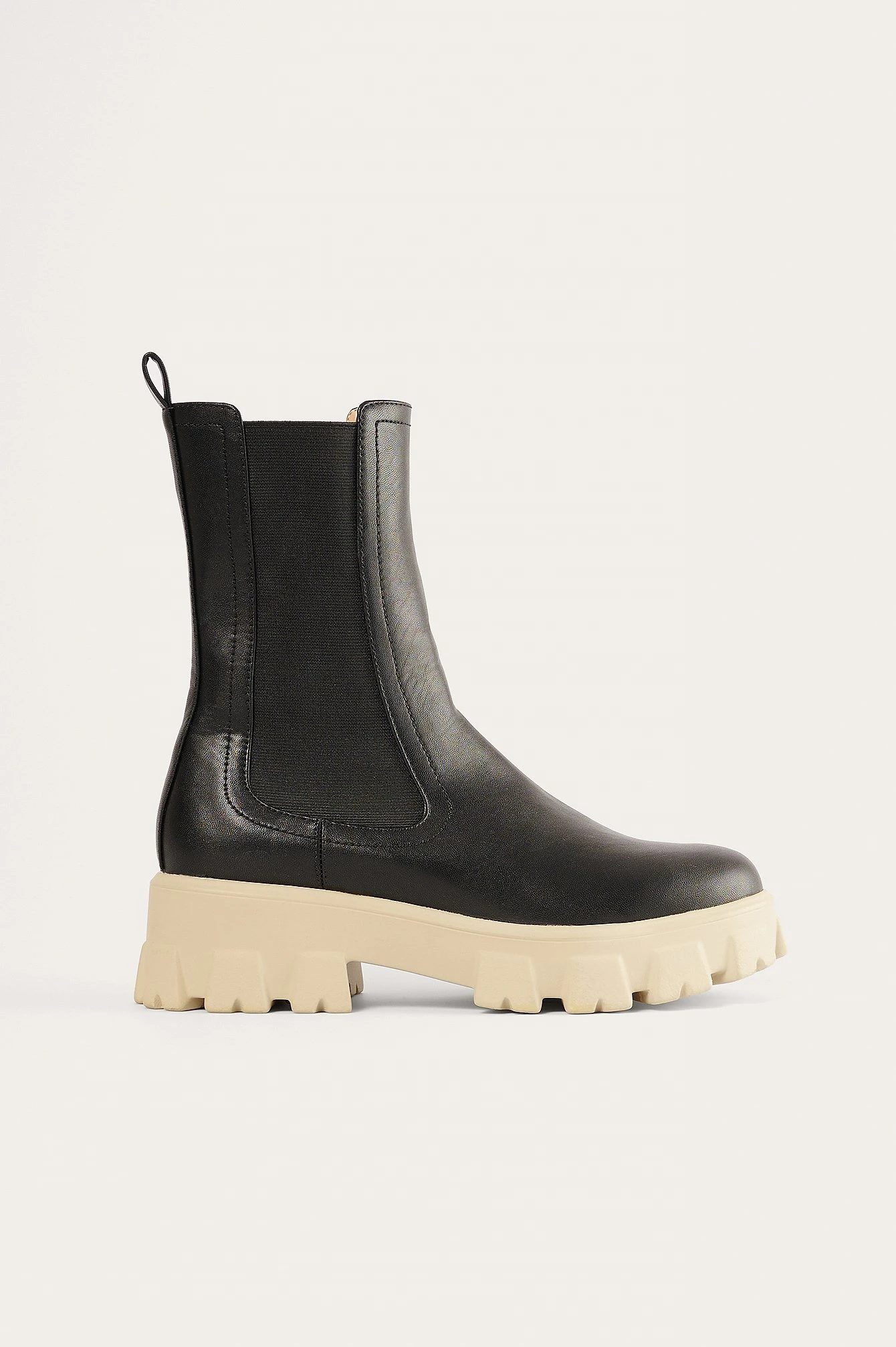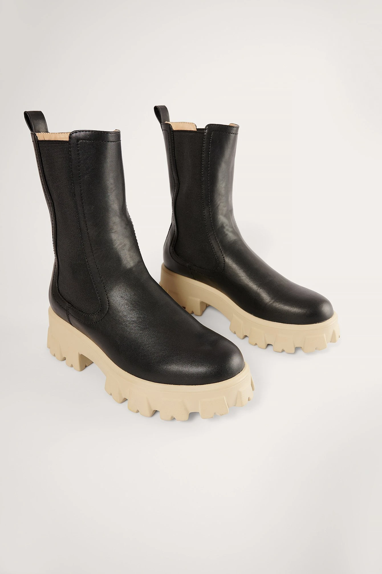 These boots feature a faux leather material, a round toe, a high ankle, an elasticized shaft and a chunky rubber sole. Sole Height: 5 cm / 1.9 in. The shaft height on this boot measures 20 in size 39. The shaft height might differ from size to size.