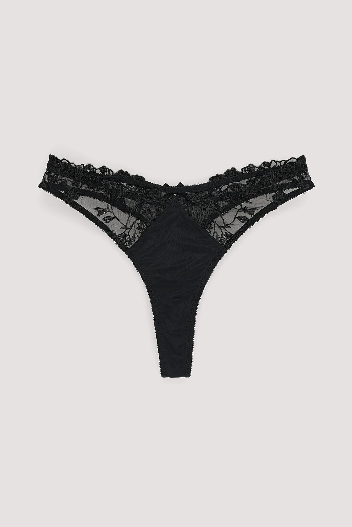This thong is v-shaped and features a high cut leg and a crotch lining with a soft touch. It has a sheer material with flower embroidery and a hole detail with a ribbon at the back.
