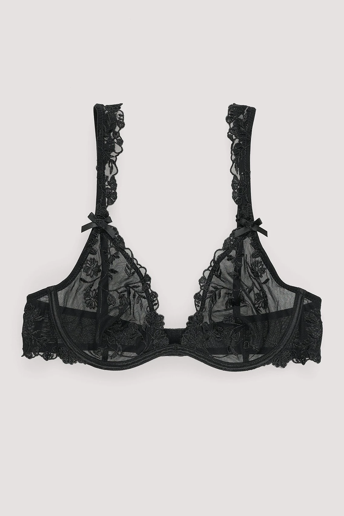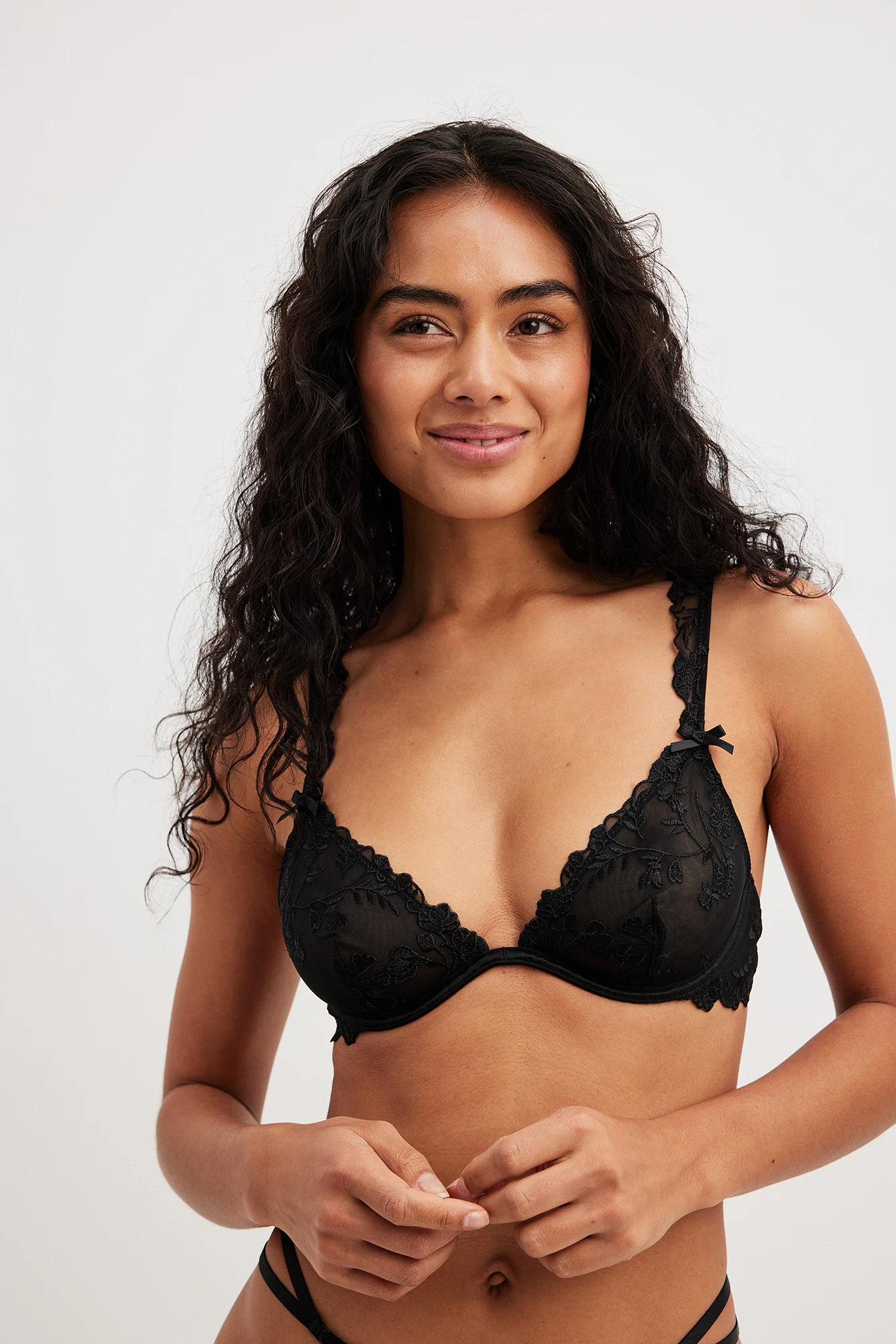 This bra features unpadded, mesh underwire cups with flower embroidery and decorative ribbons at the top. It has adjustable shoulder straps with embroidered details at the front and a hook-and-eye closure on the back.