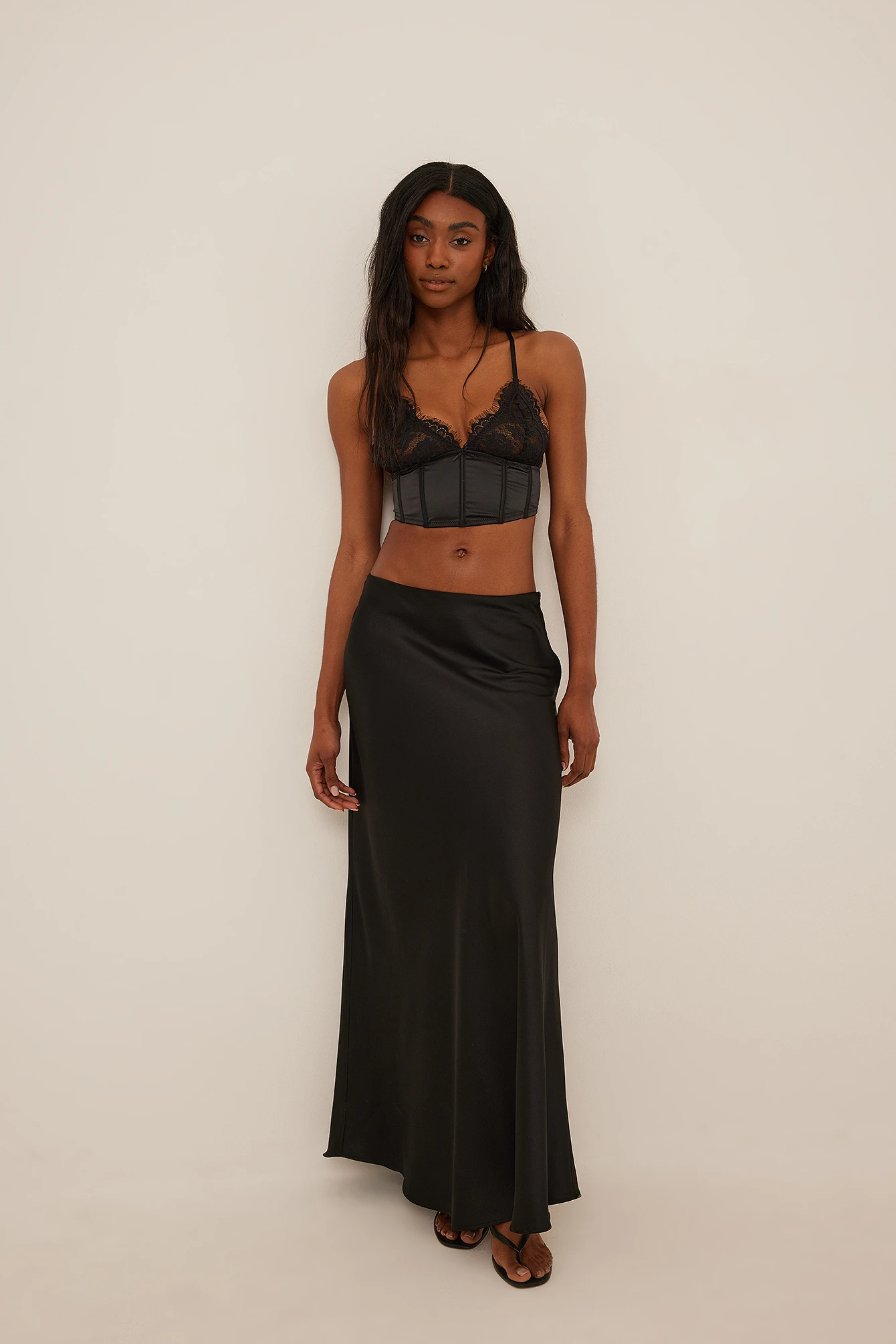 This bra features unpadded, seethrough cups in lace, adjustable shoulder straps, a bow detail on the front, a hook-and-eye closure on the back and a corset design in satin.
