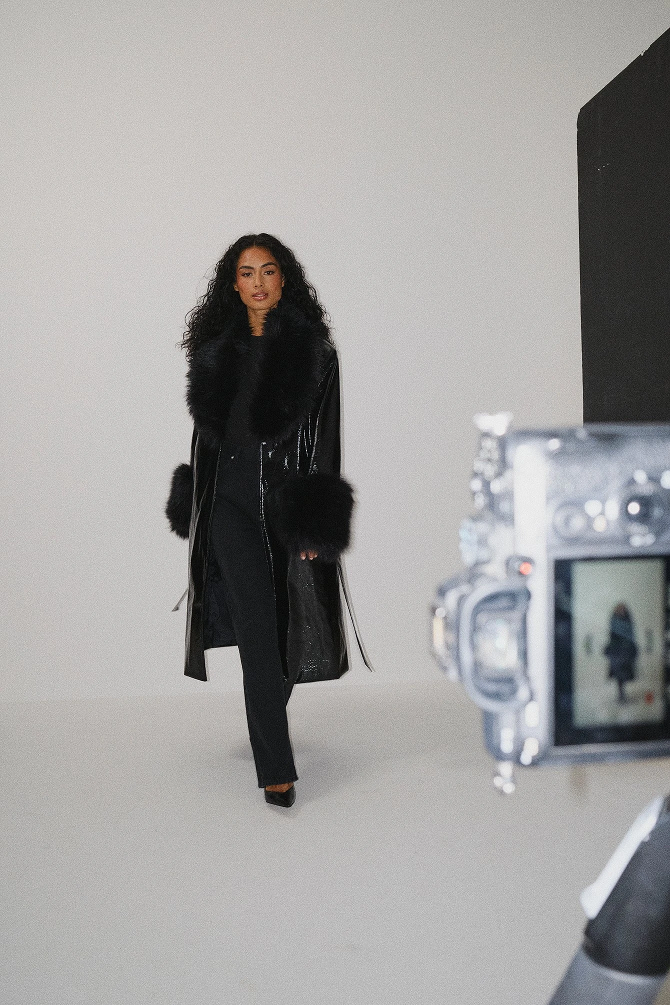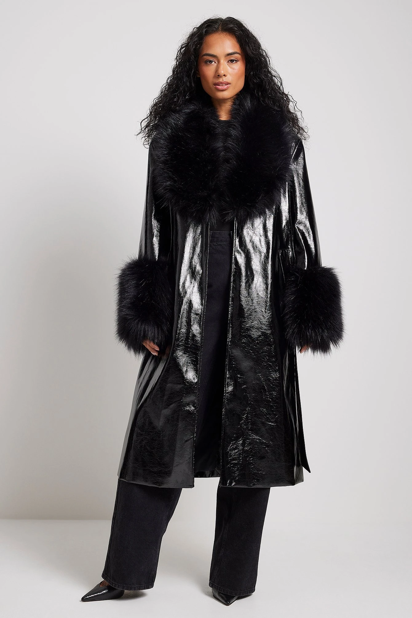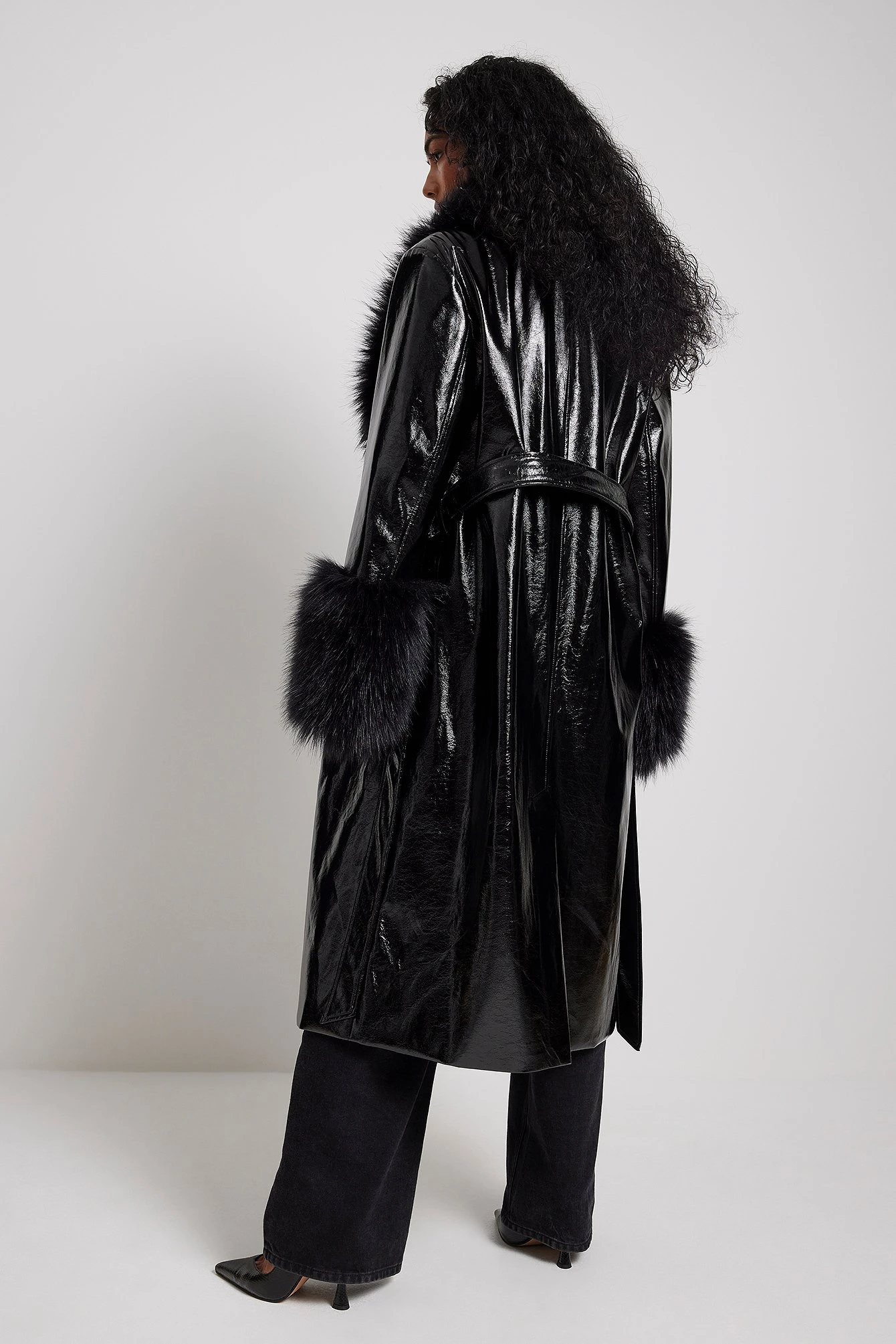This coat is made of PU and features a collar in faux fur, long sleeves with faux fur on the cuffs, side pockets, a snap button closure, a self-tie belt, a slit detail at the back and a lining.