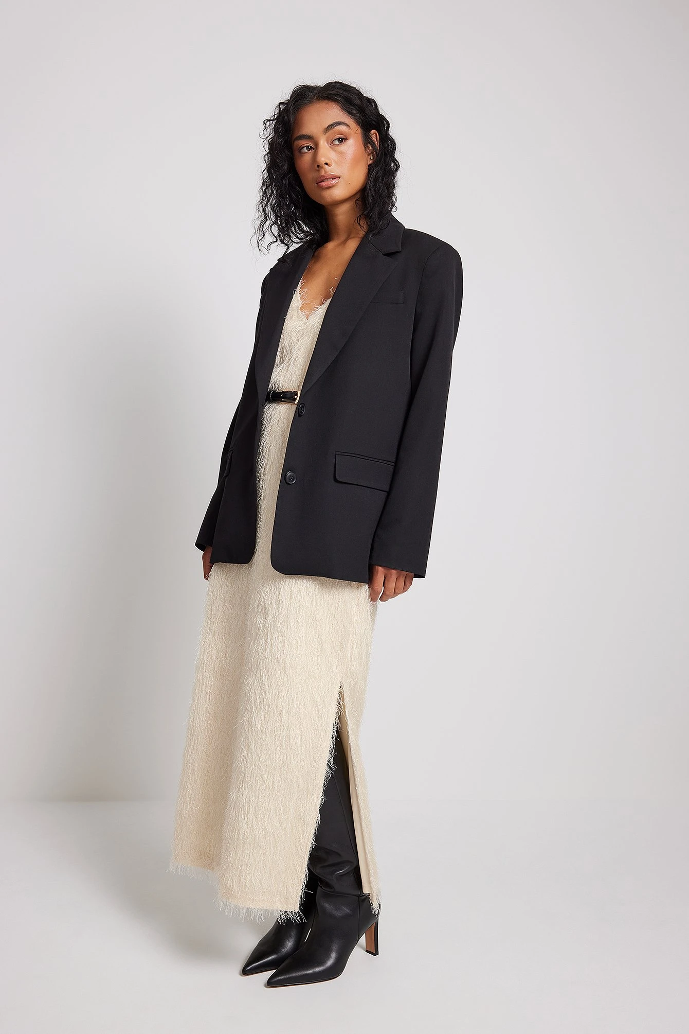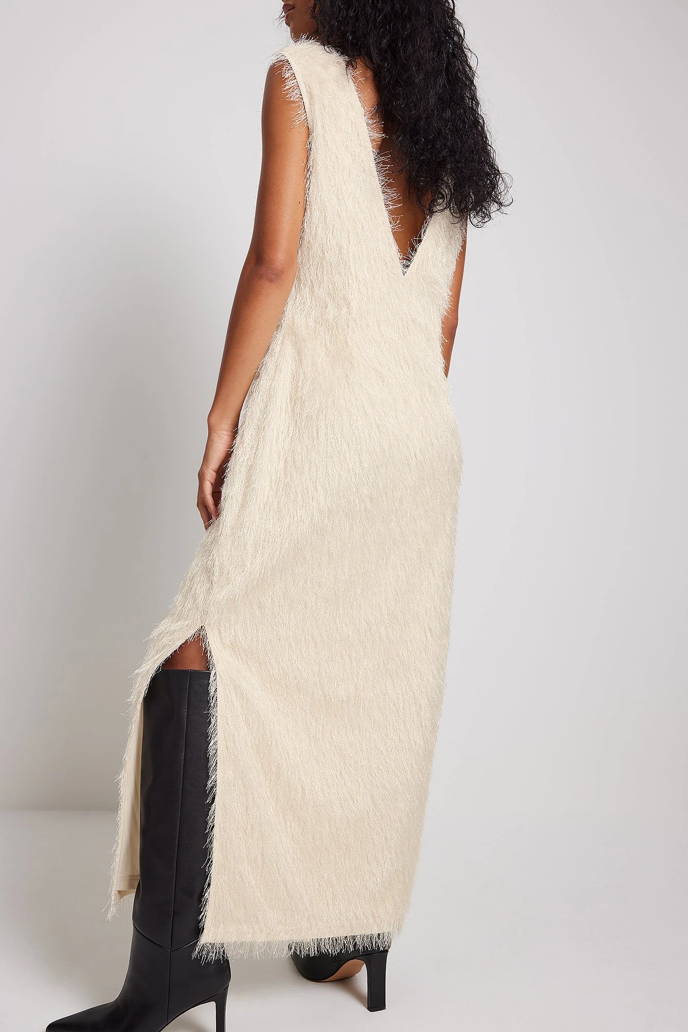 This maxi dress features a glittery feather look, slit details on the sides and a fabric lining.
