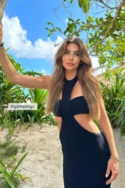 This maxi dress is stretchy and features a ribbed fine knit. It has a high neckline with a button closure at the back of the neck and a cut out detail.