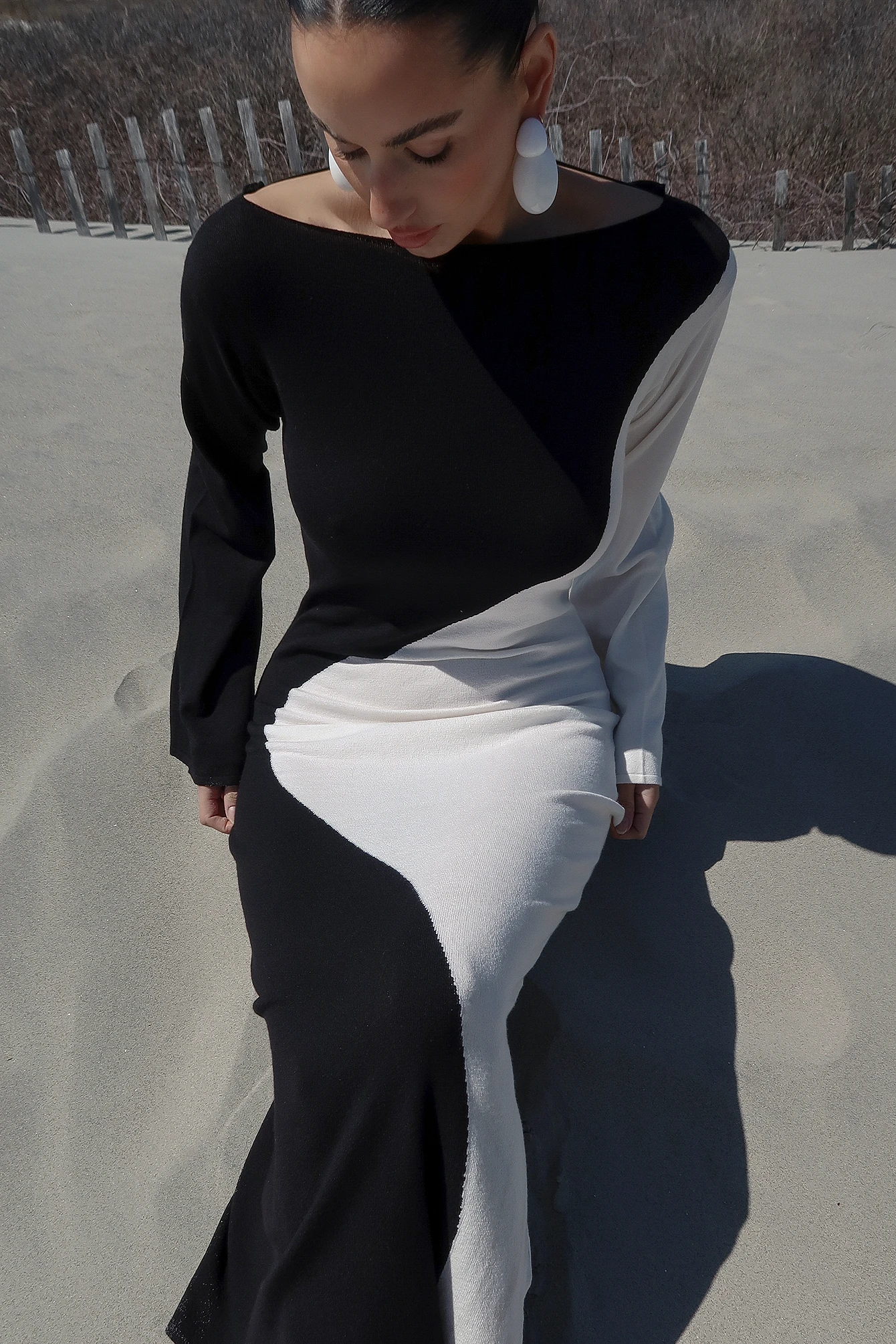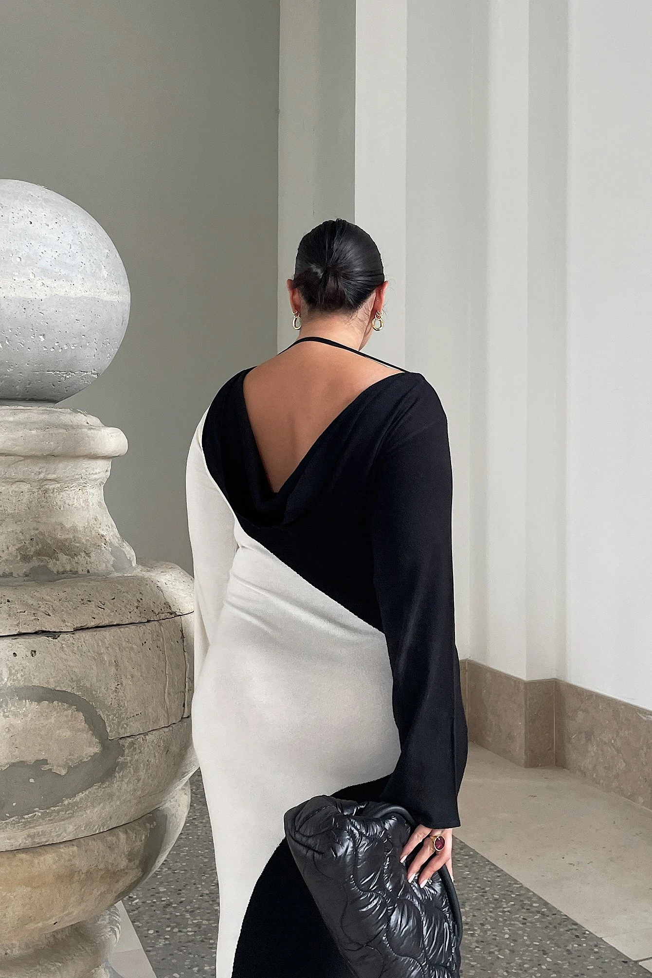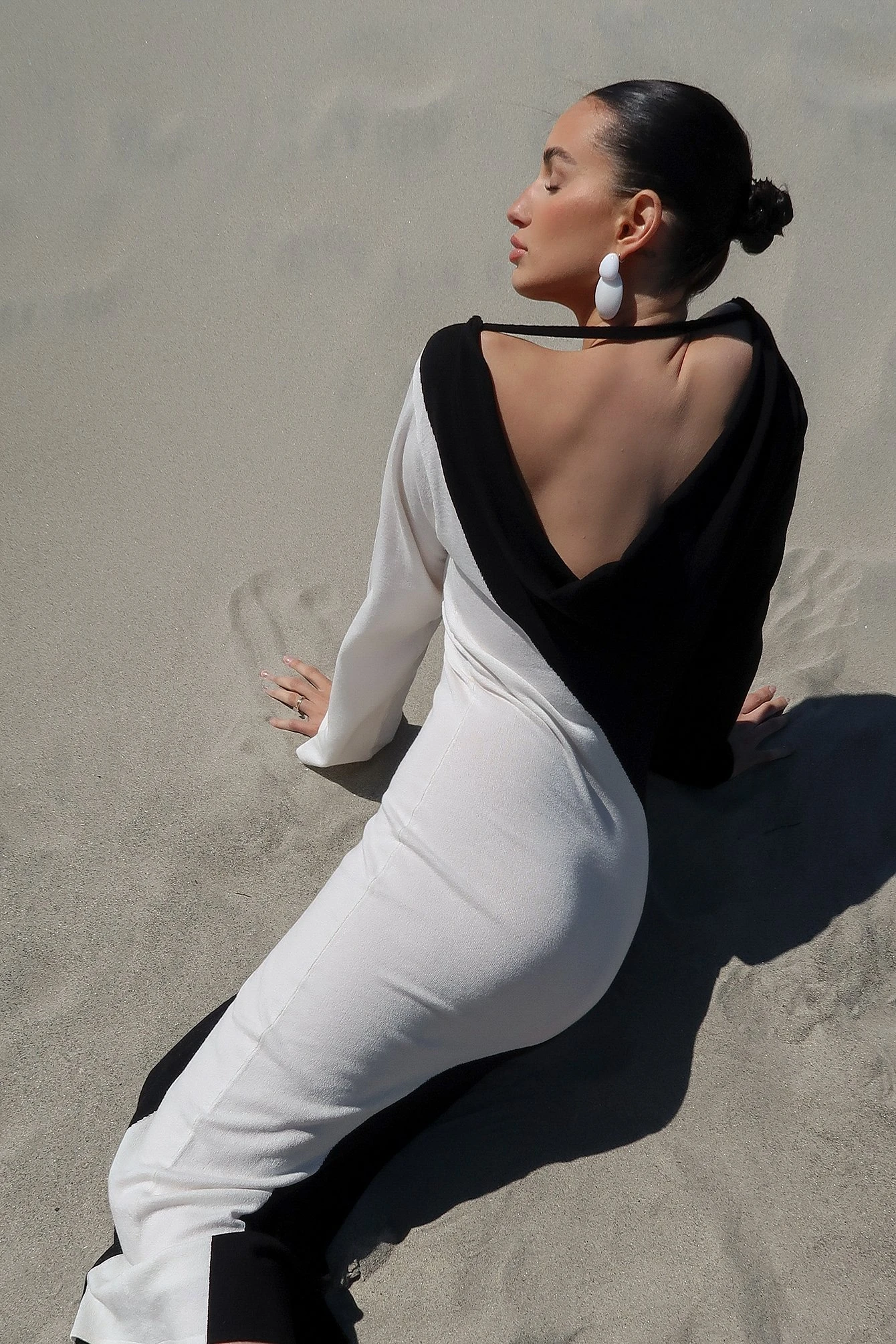 This maxi dress features a boat neckline, long trumpet sleeves, a large, draped open back and a stretchy fine knit fabric.