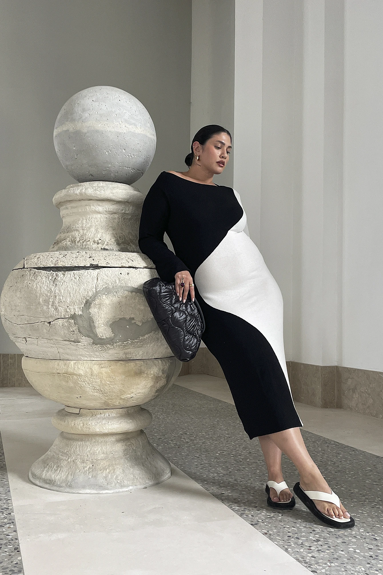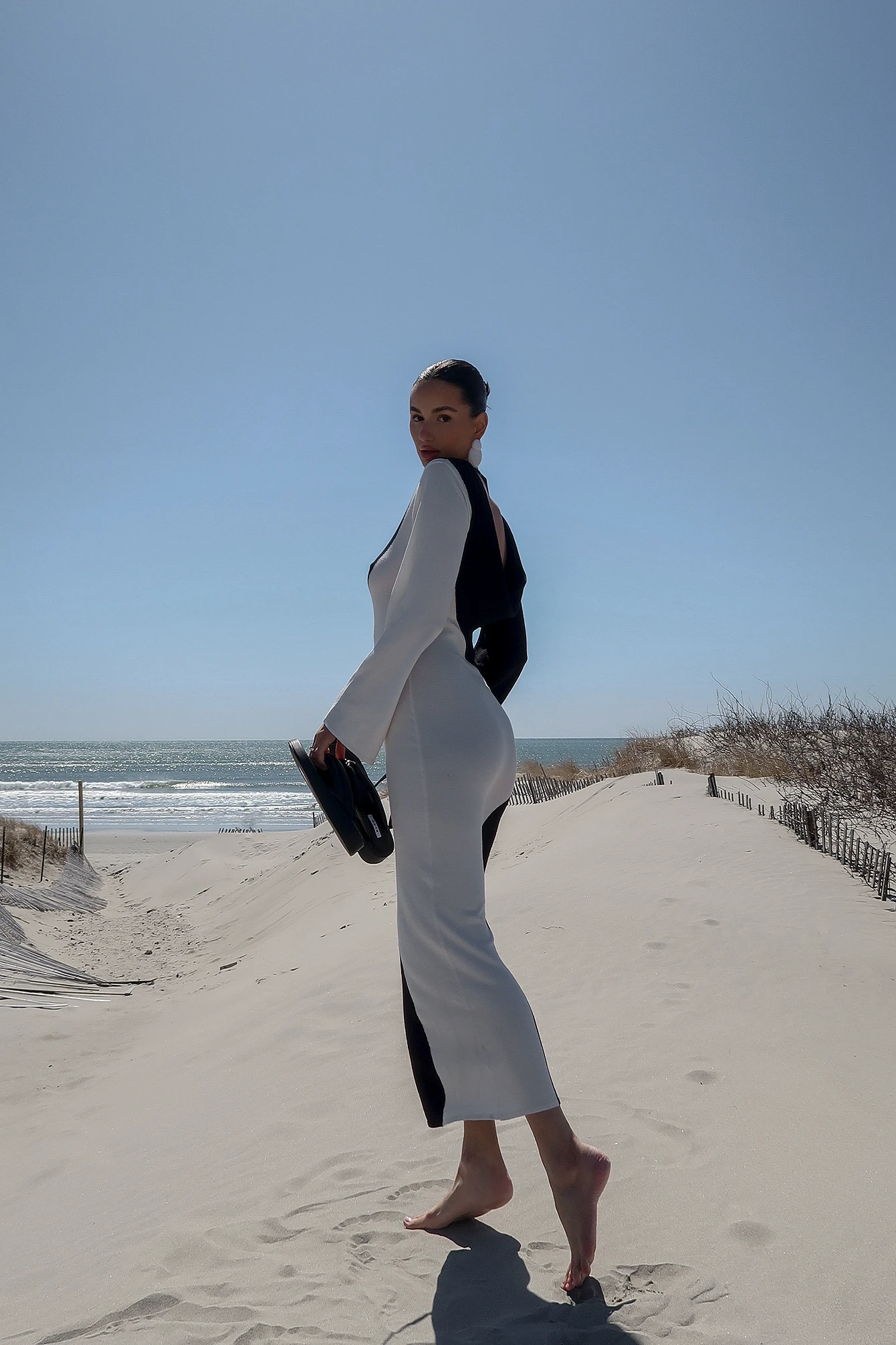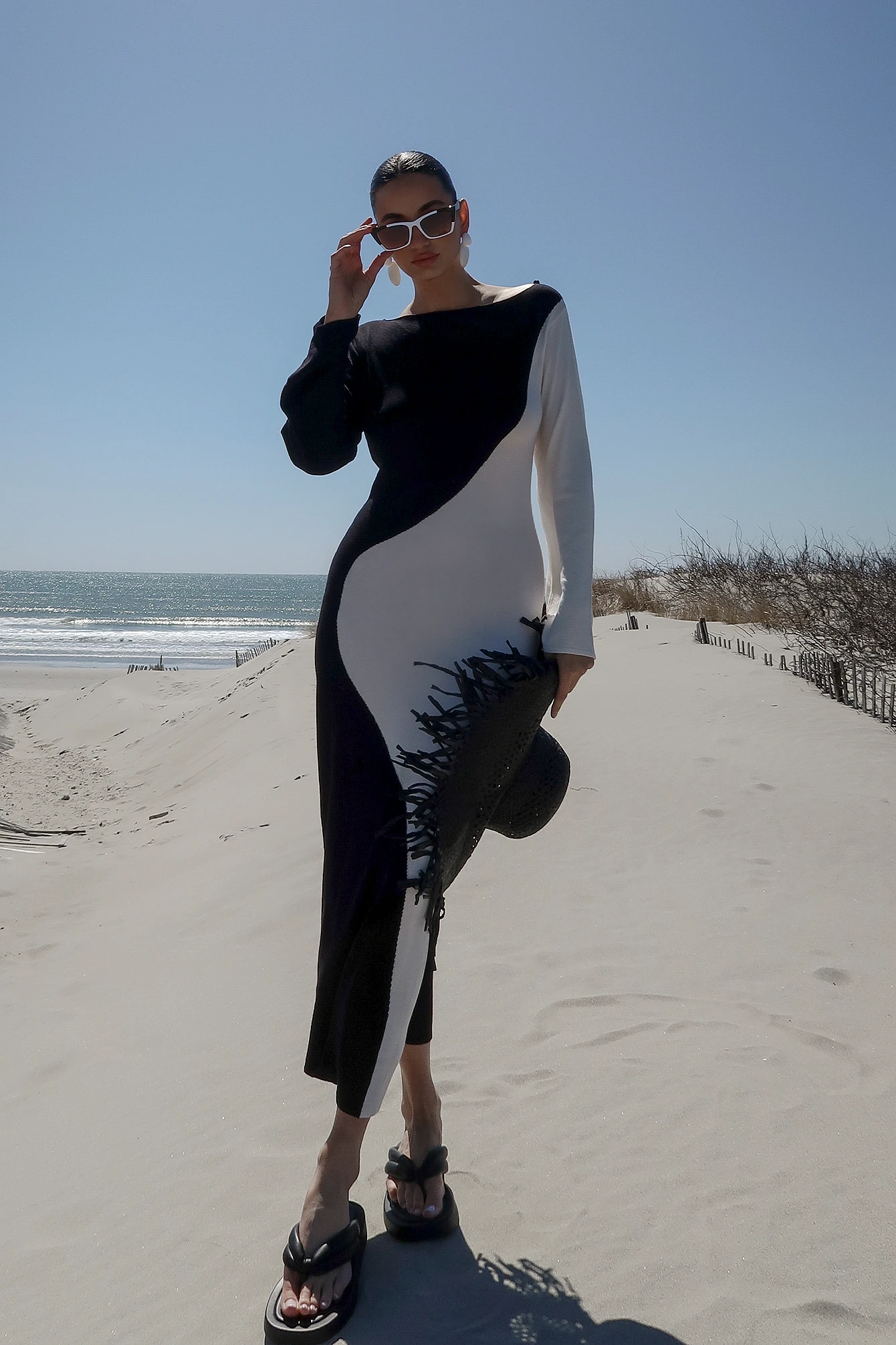 This maxi dress features a boat neckline, long trumpet sleeves, a large, draped open back and a stretchy fine knit fabric.