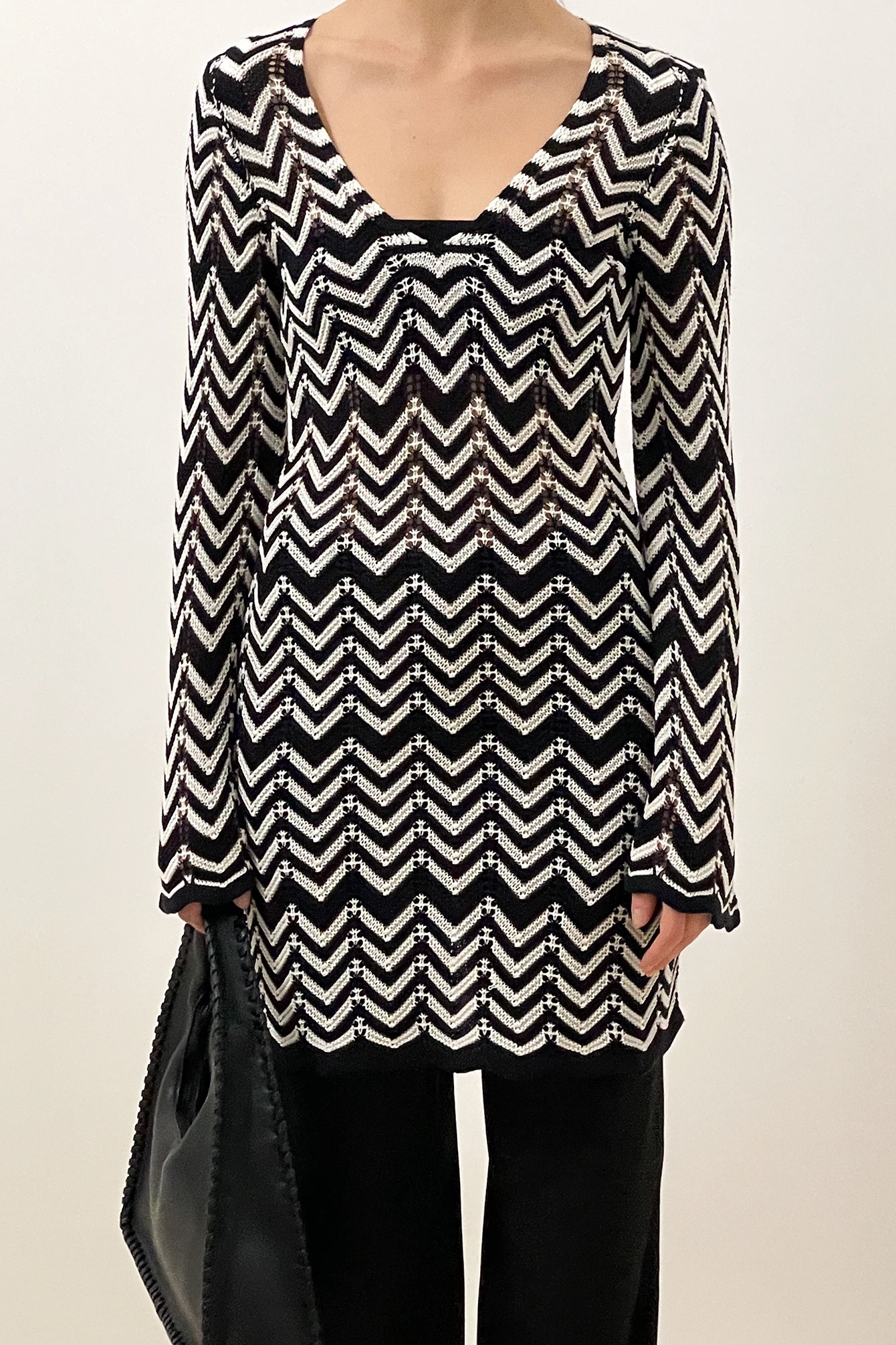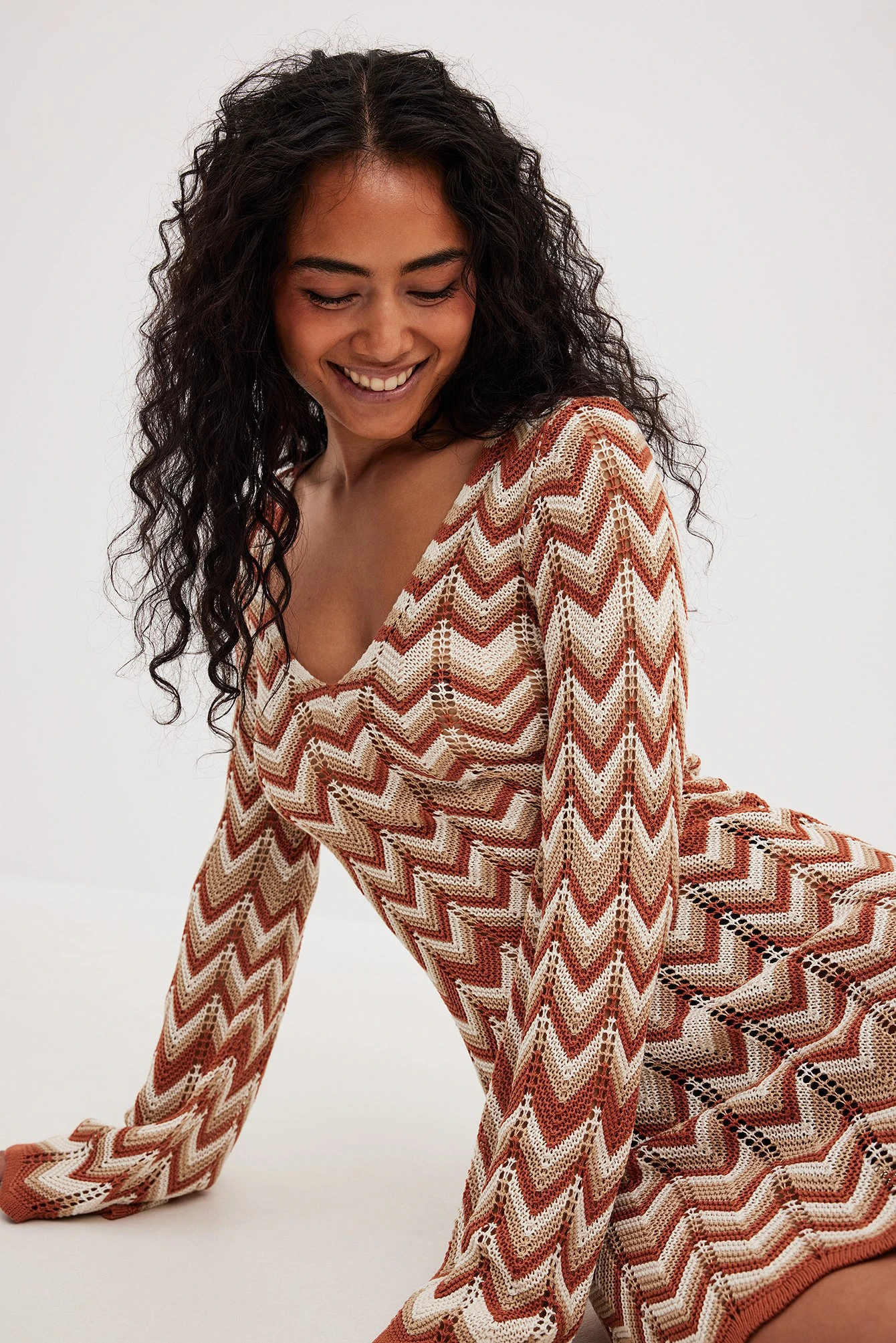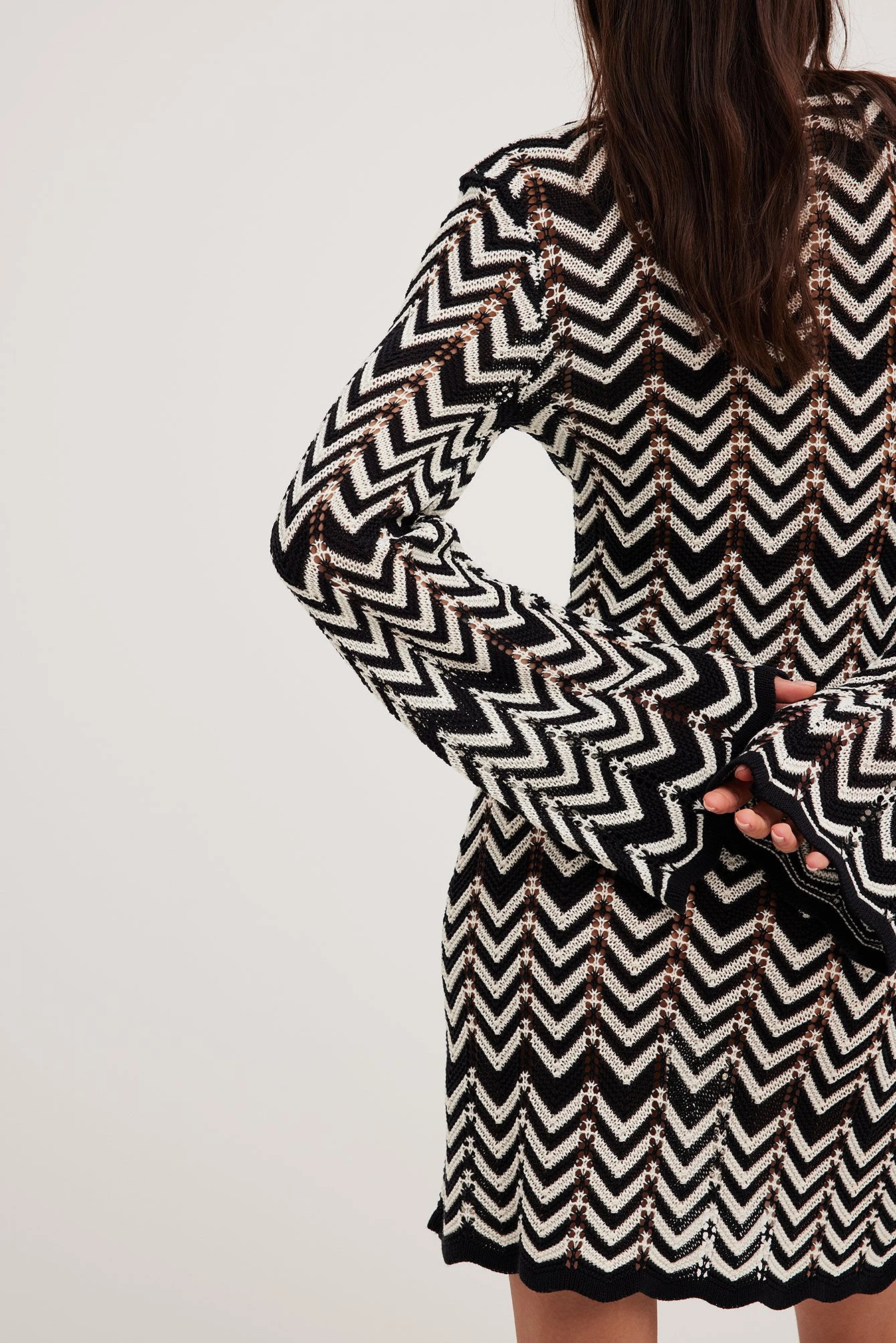 This mini dress is knee high and features a stretchy knit material and a flowy fit. It has a v neckline and trumpet long sleeves. Our mini dress features wavy details on the cuffs and at the hems.