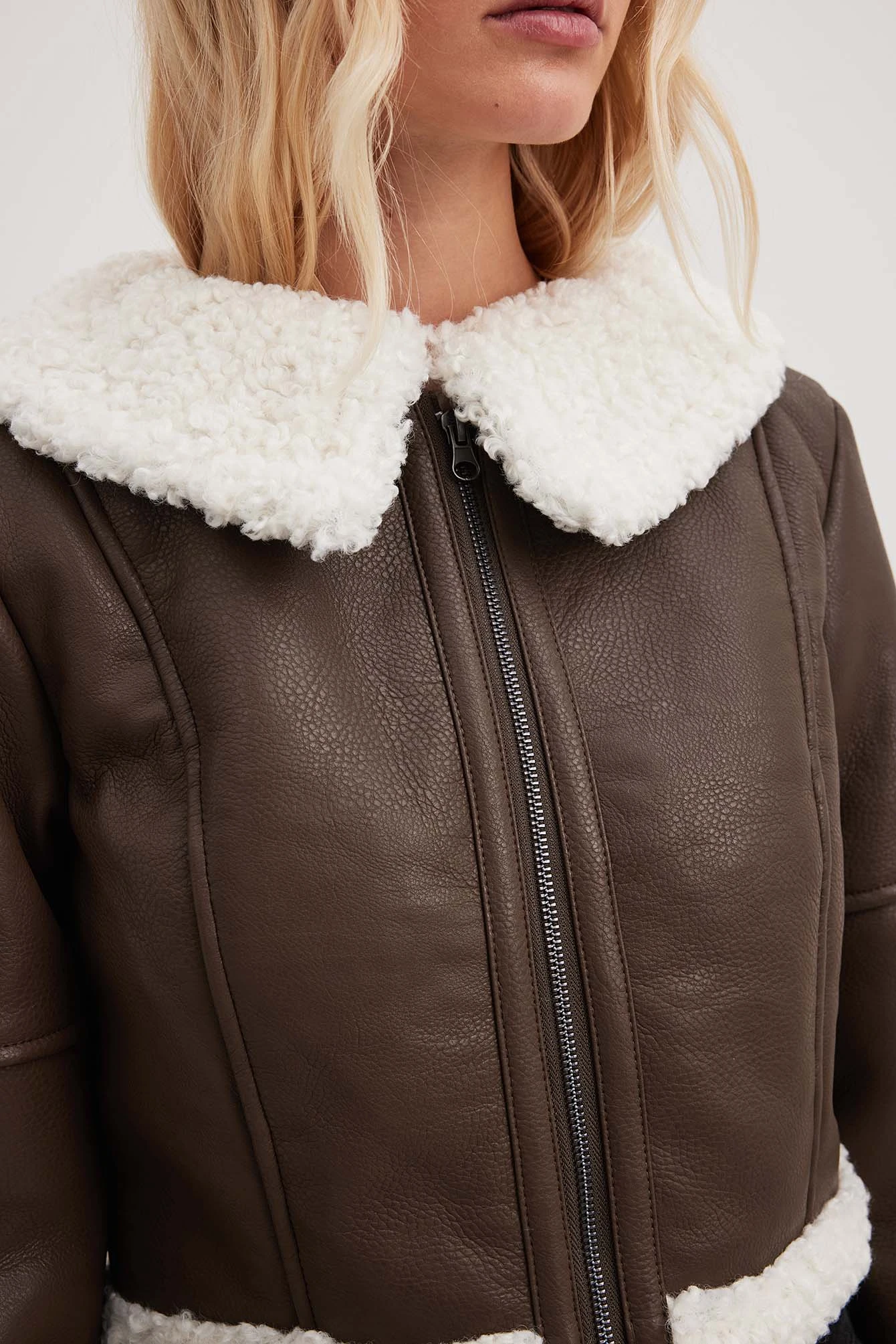 This jacket is fitted and features cropped length. It has a faux leather material with trims in faux shearling and a lining in faux shearling. This jacket features a zipper closure.