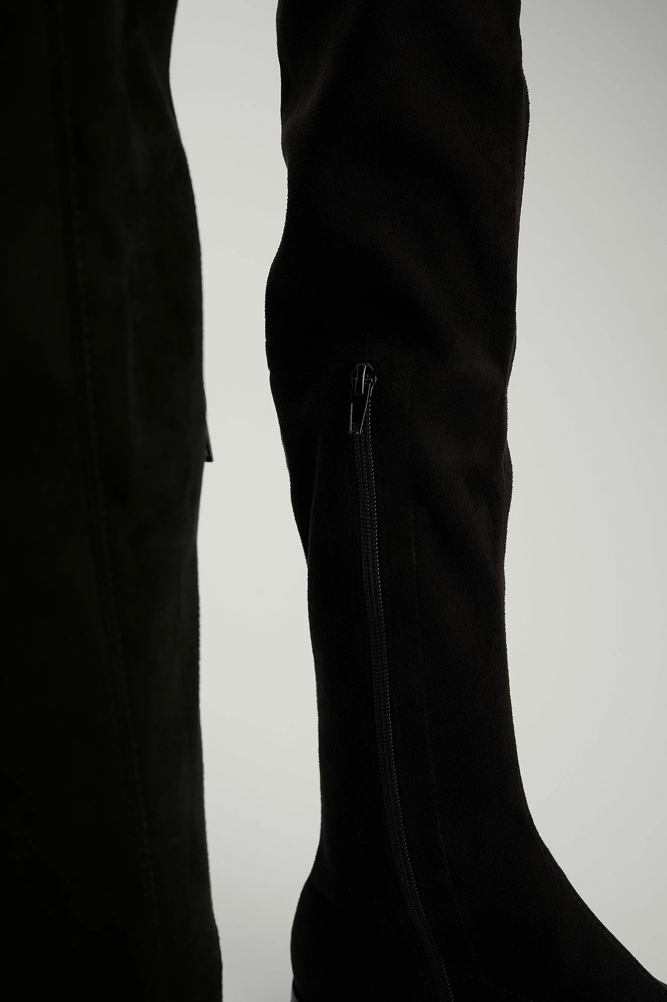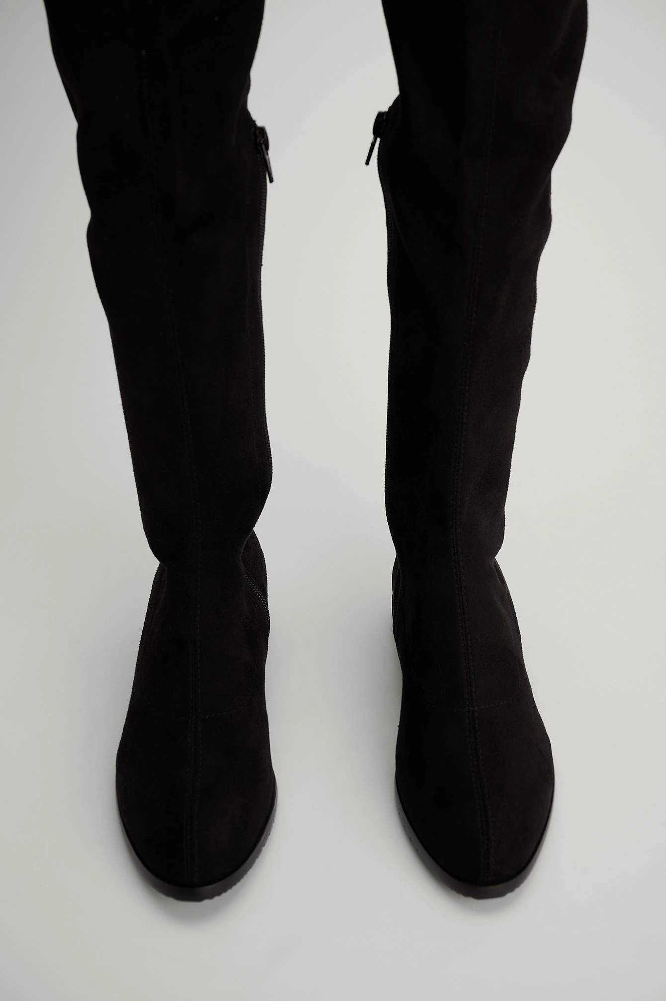 This boot features a thigh high design, a rounded toe, a side zipper on the inside and an adjustable drawstring at the top. Heel Height: 2,4 cm / 0.9 in.