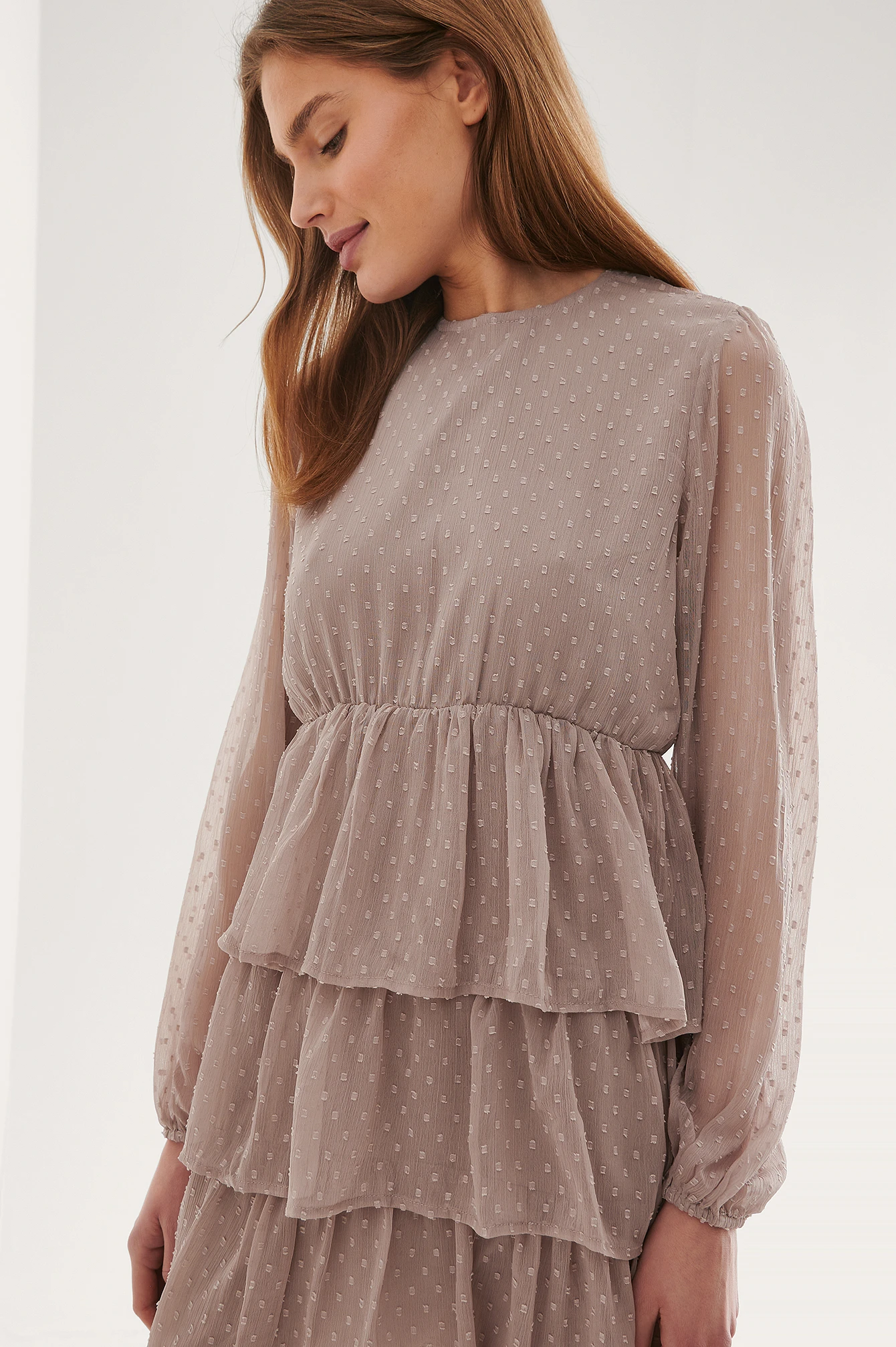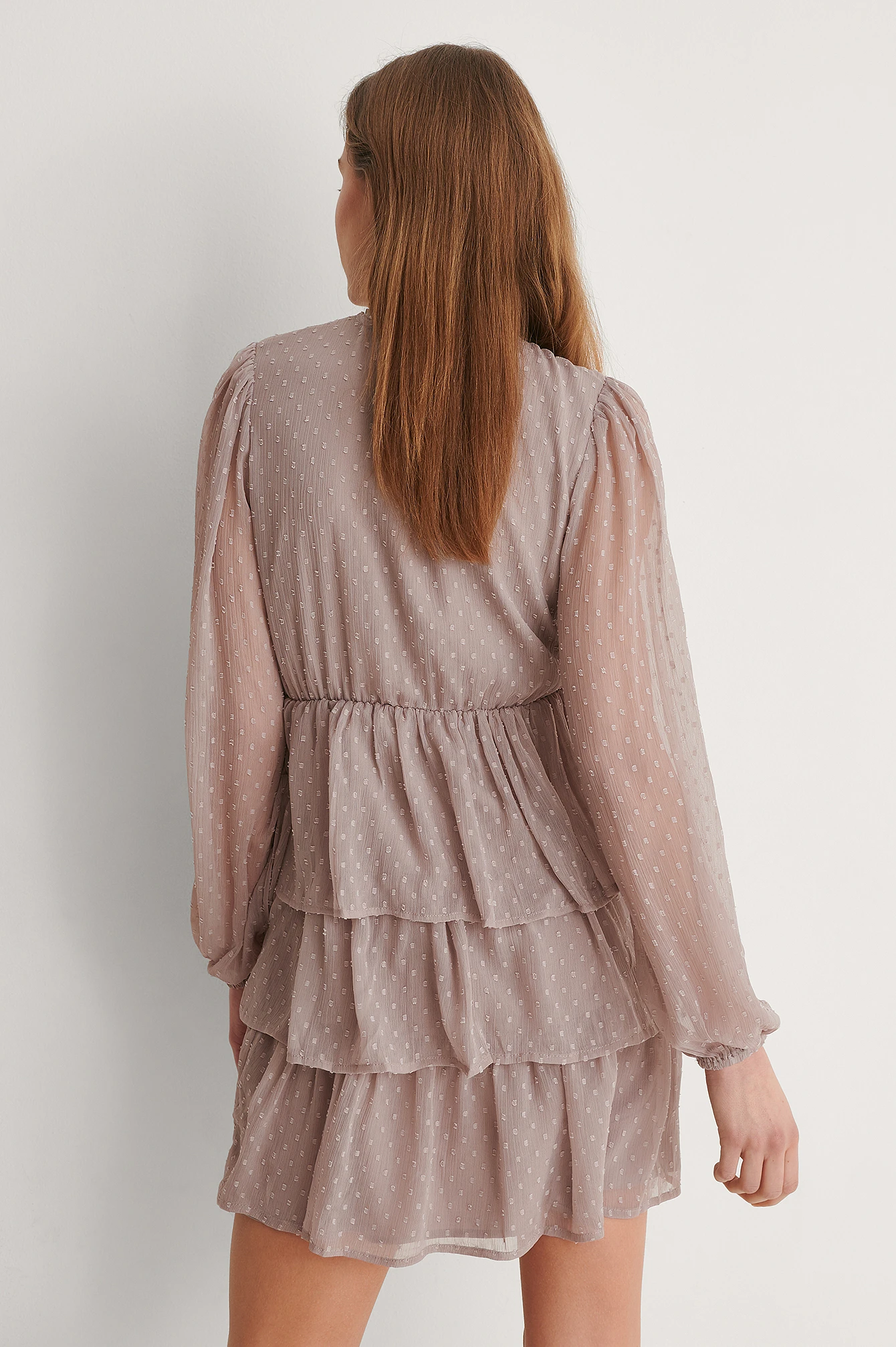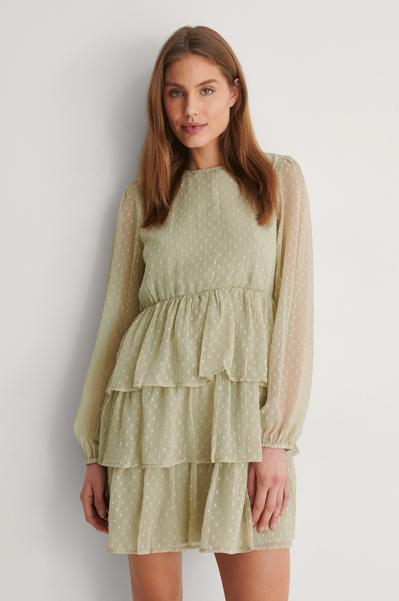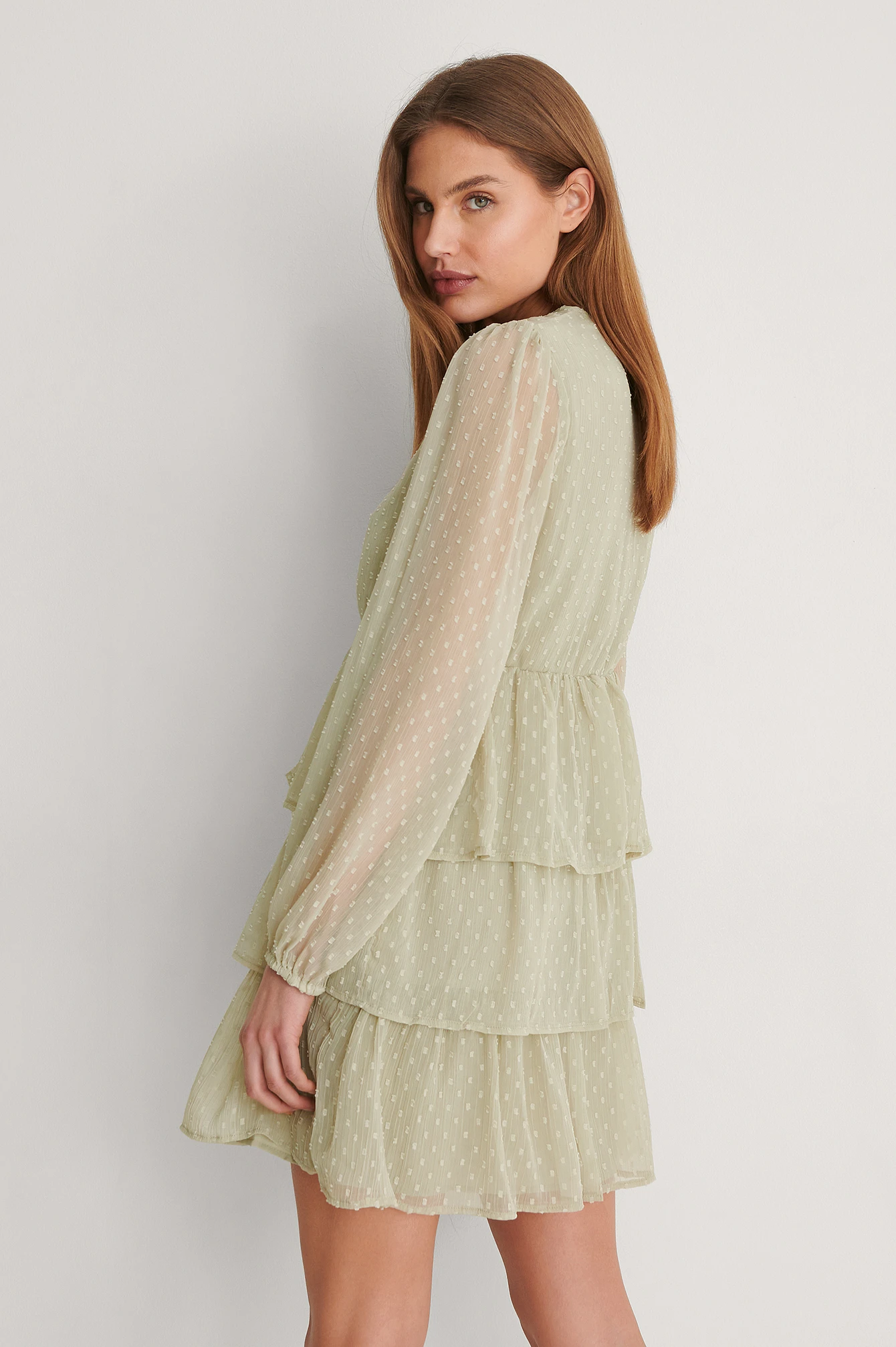 This dress features a round neck with one button closure behind the neck, slightly transparent long sleeves, an elasticized waist, flounced details and a mini length.