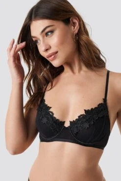 This bra by NA-KD Lingerie features an underwire cup, mesh fabric, lace detailing on the front, a hook and eye closure at the back and thin adjustable shoulder straps.