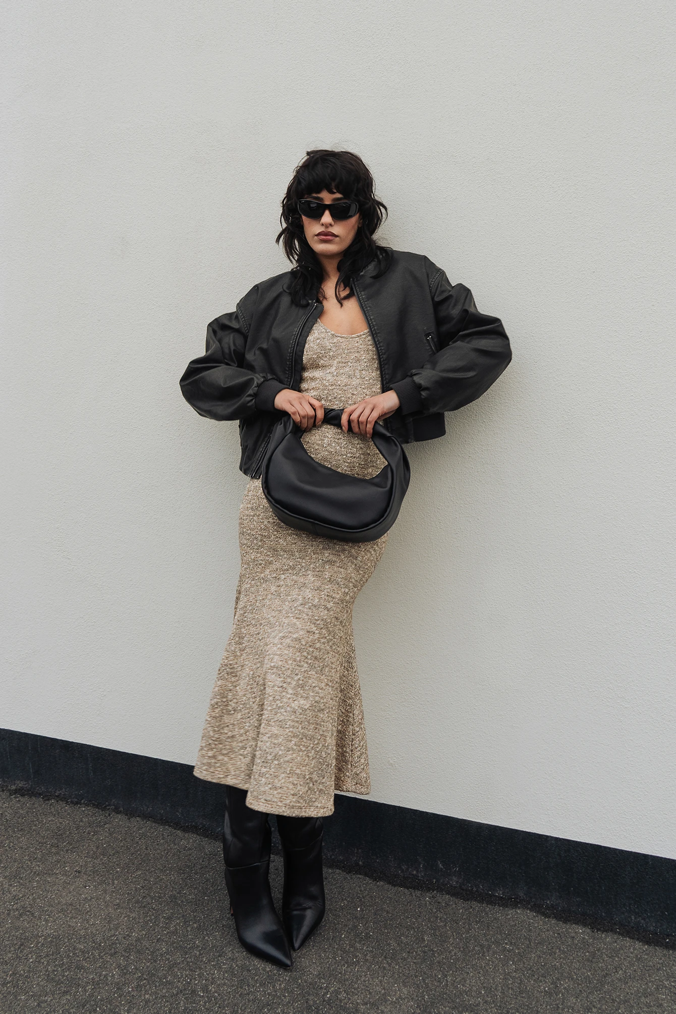 This midi dress is sleeveless. It features a relaxed knit and a flowy fit on the bottom. This midi dress features a scoop neck and a scoop backline.