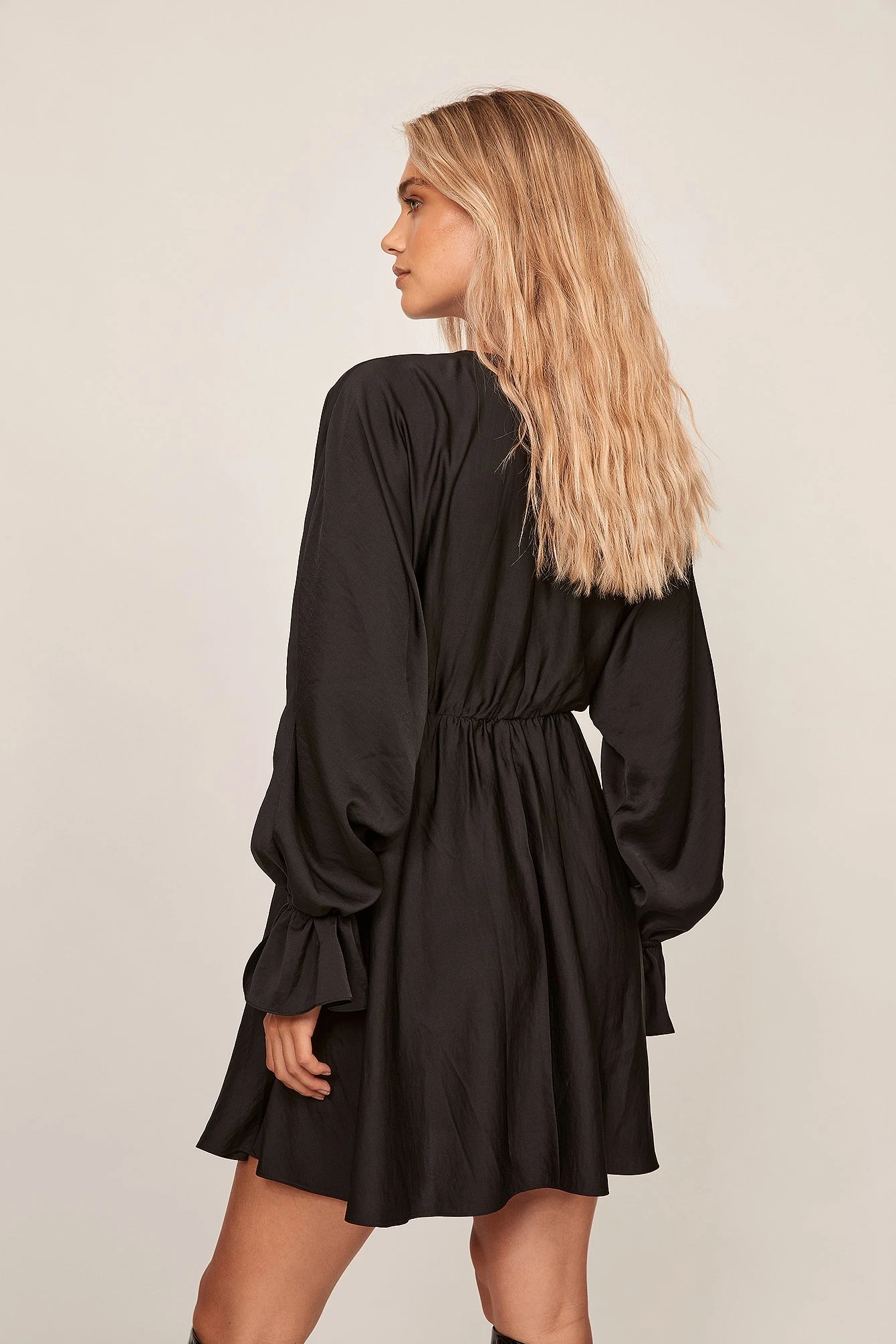 This mini dress is satin and features a V-neck, a pleated waistline, long batwing sleeves with an elasticized, ruffled cuff and a flowy skirt.