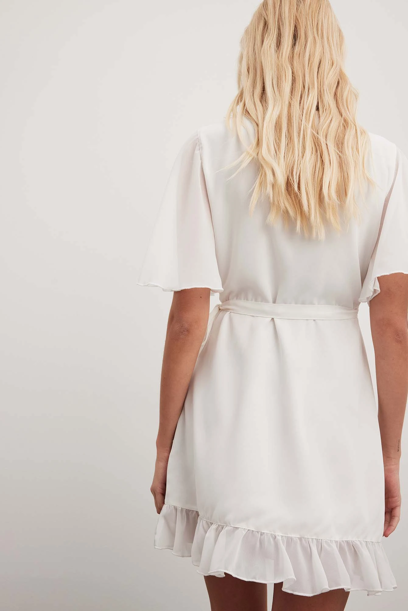 This mini dress is frilled and features a chiffon layer. It has flared short sleeves and a wrap design with a self-tie belt.